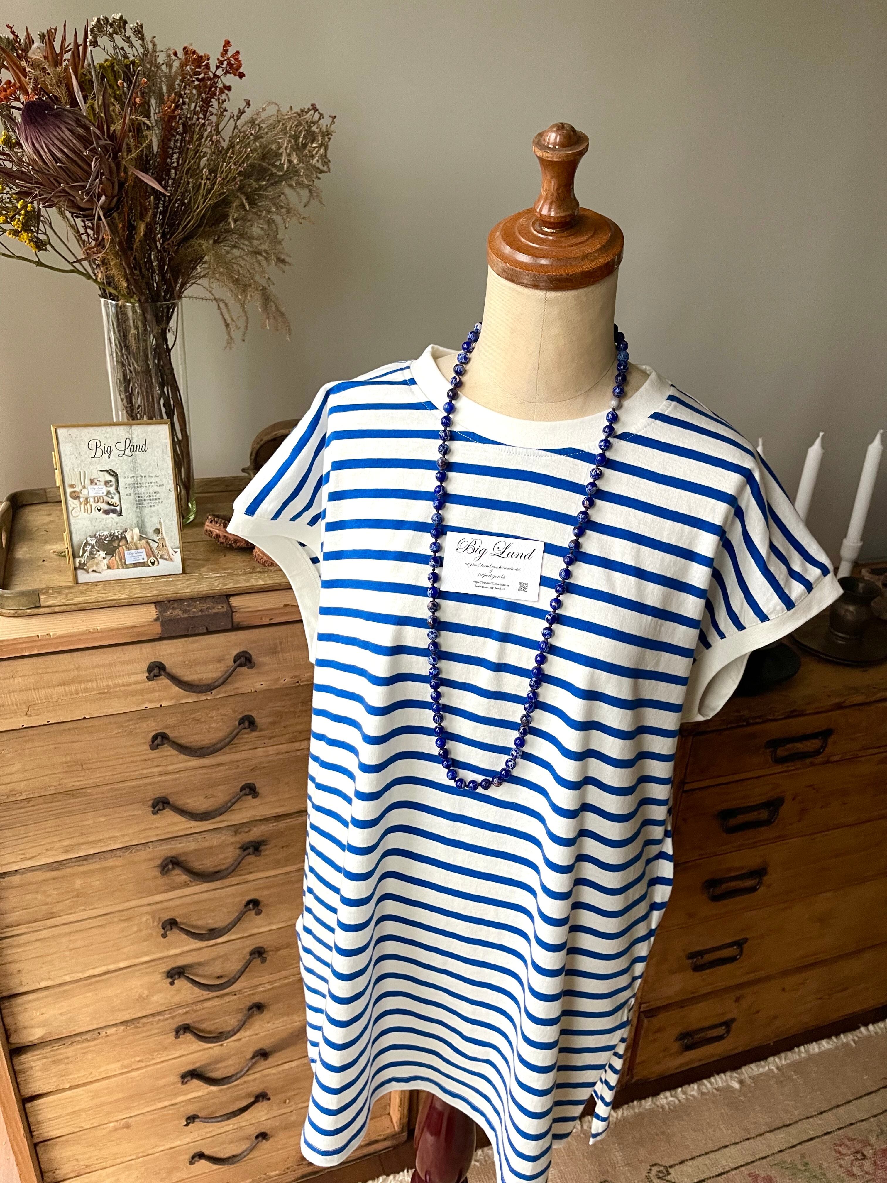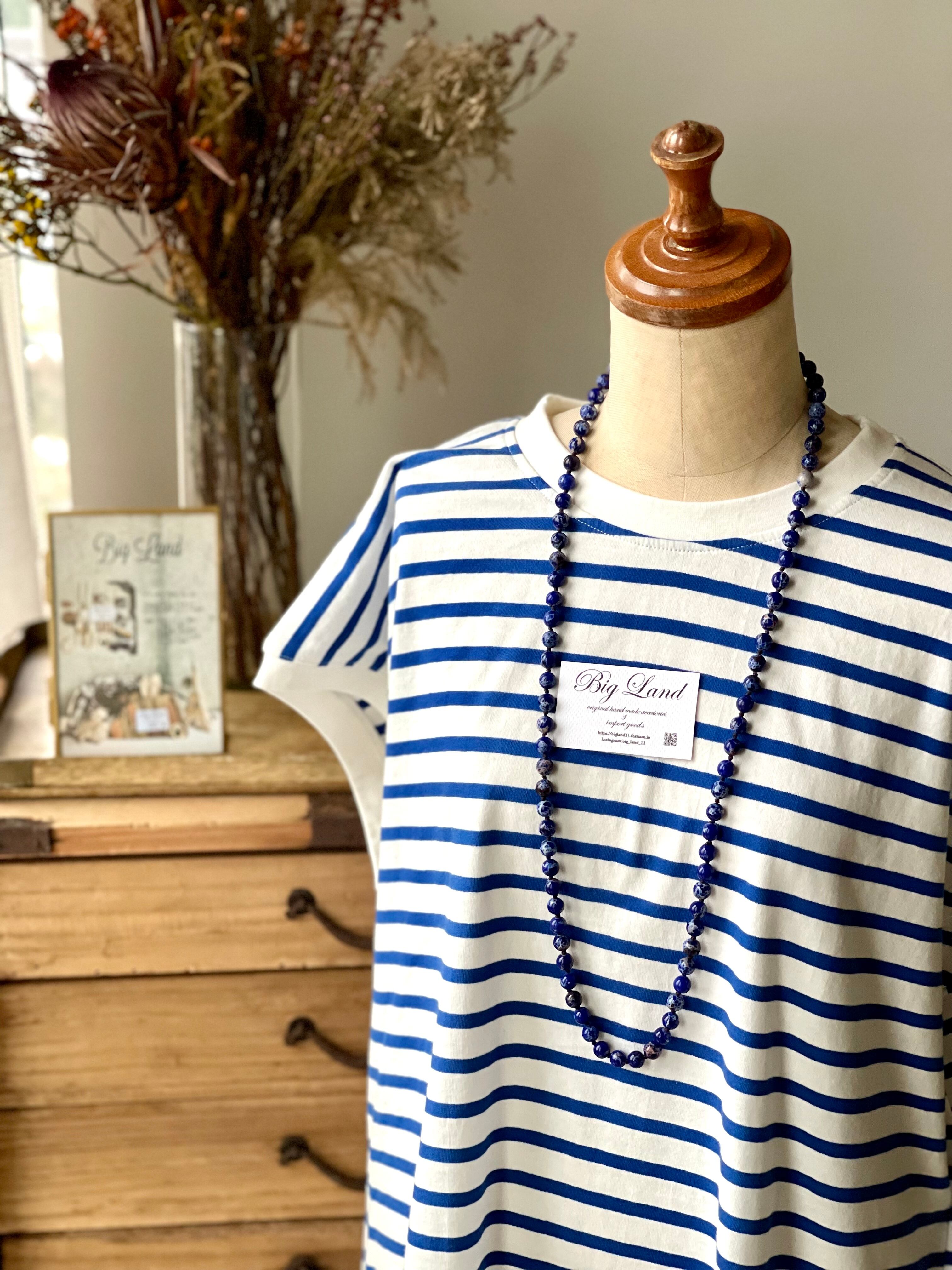 多面カット天然石ラピスラズリを一粒一粒糸で丁寧にしっかり編みあげ、高級感がありどんなお洋服にも合うと皆様色違いでご購入されてます