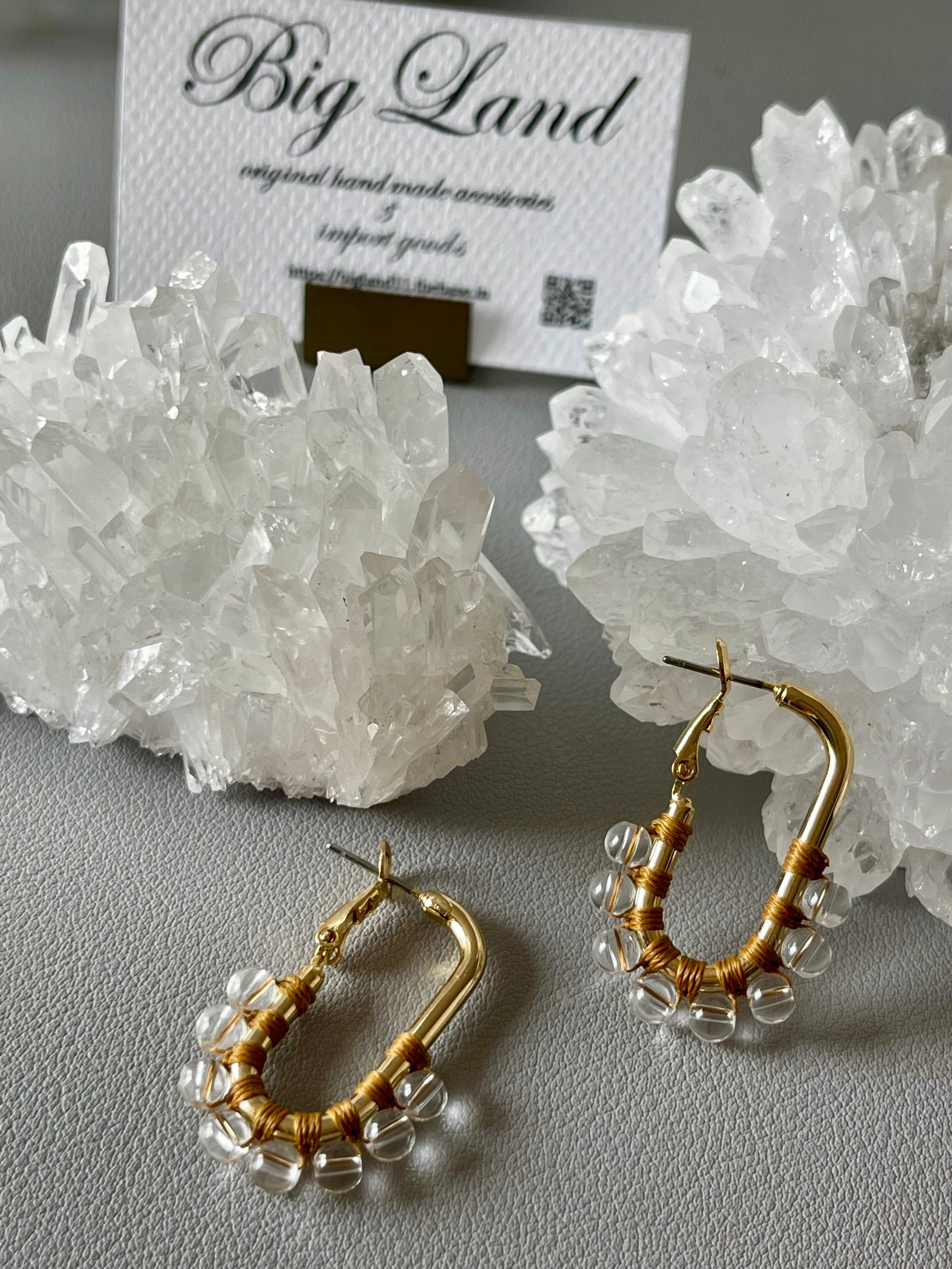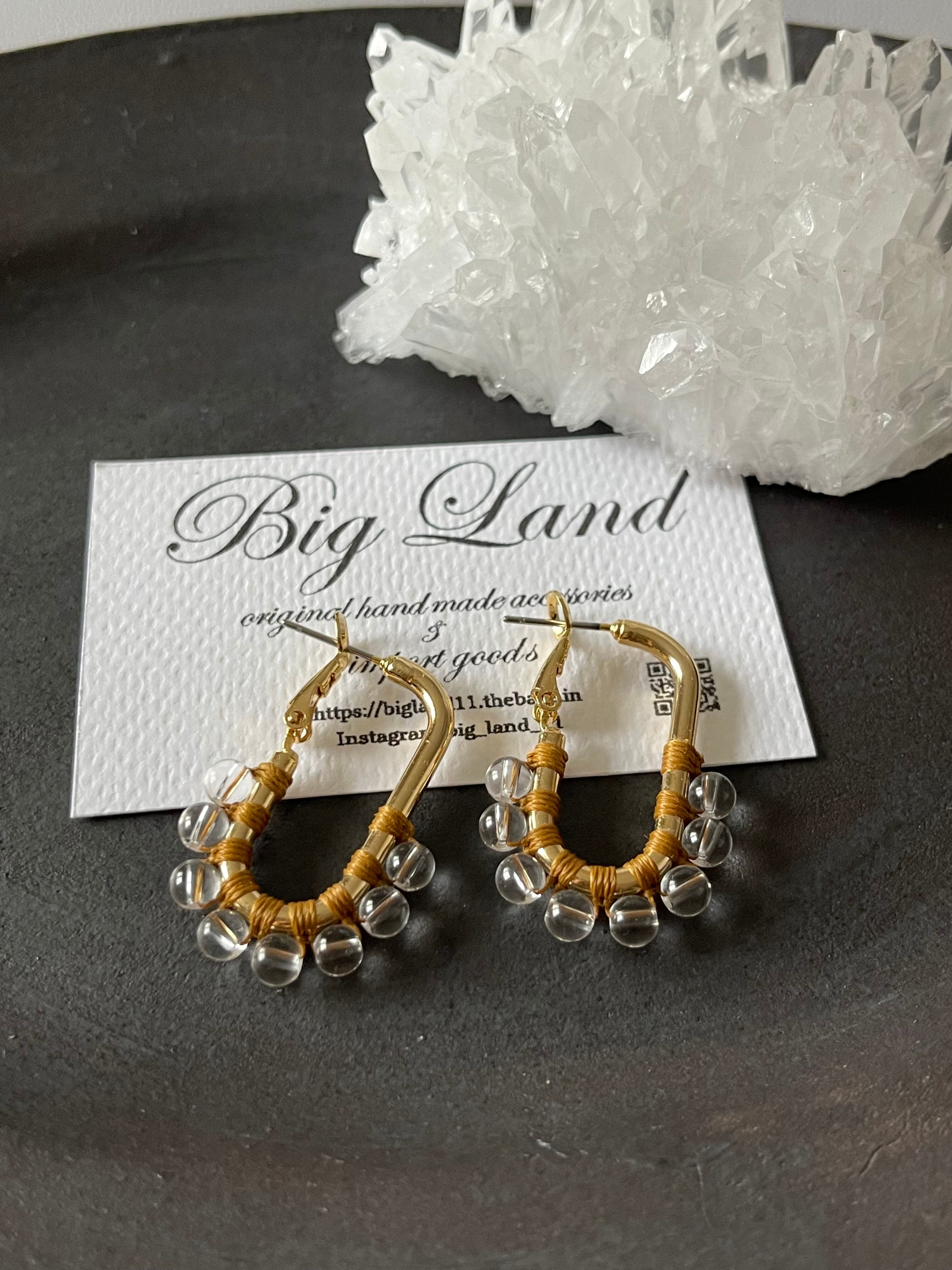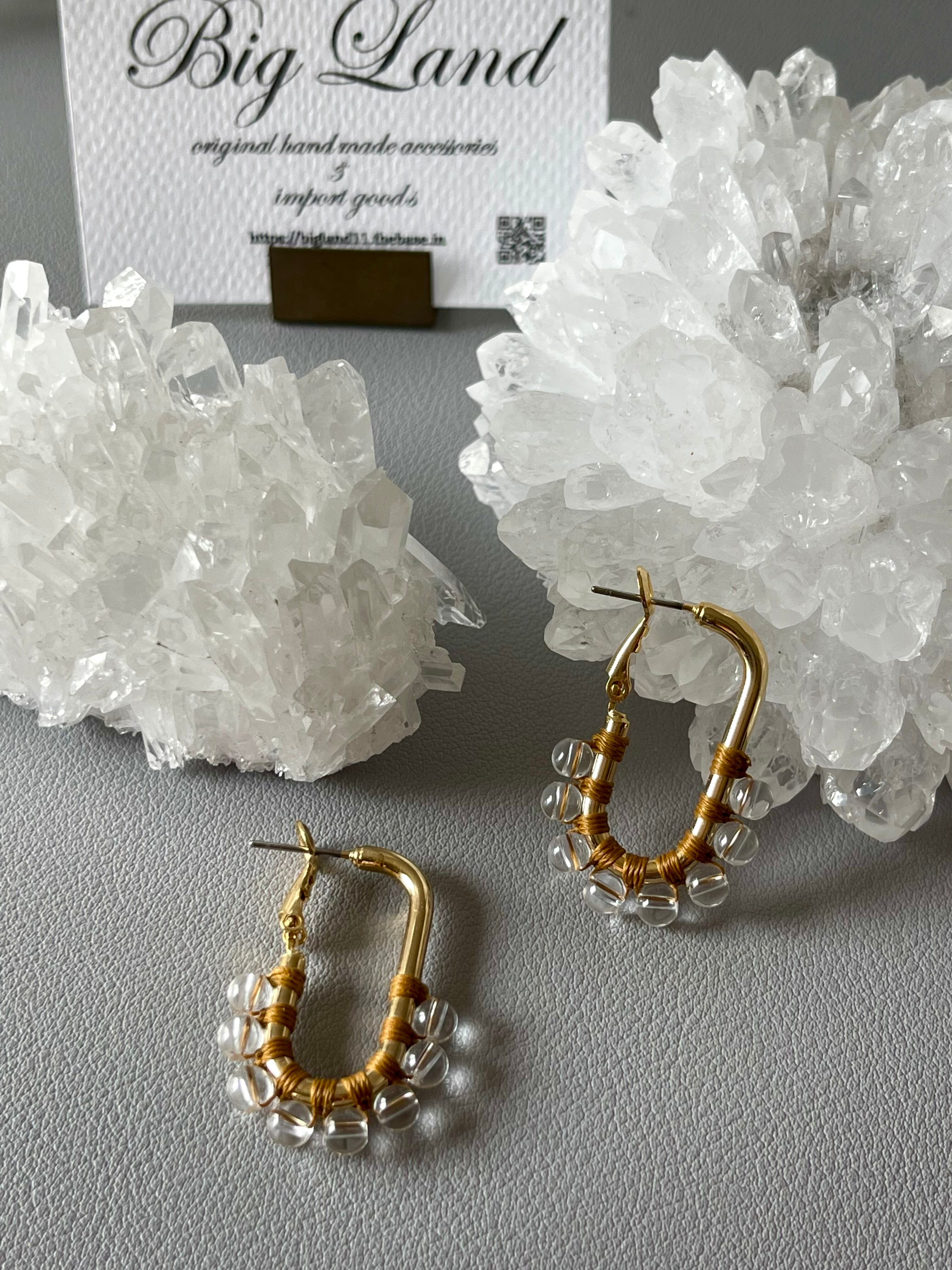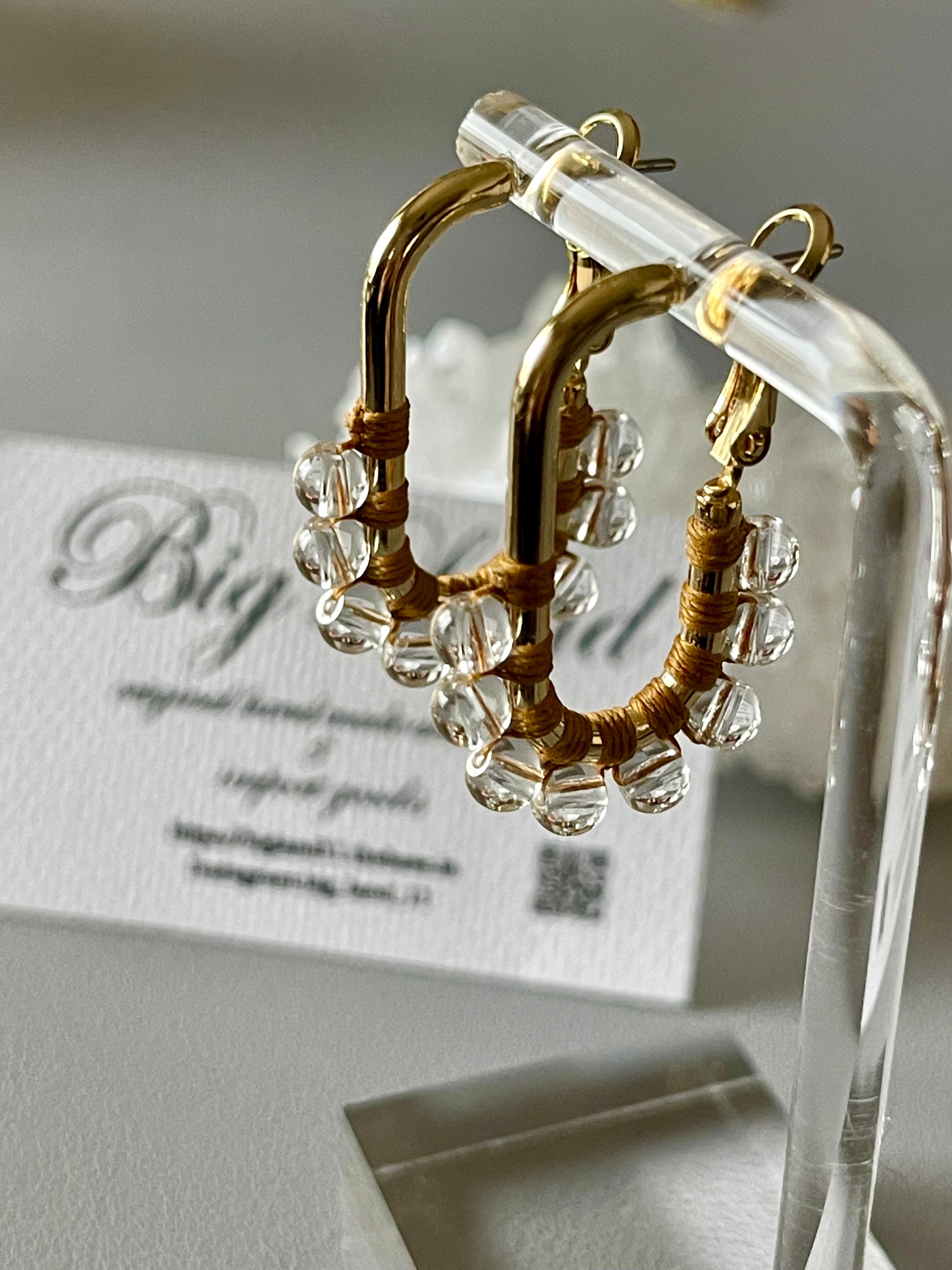 開閉式のぽってりした重厚感あるフープが高品質で、一粒一粒手間をかけて糸でひと編みひと編みしてます