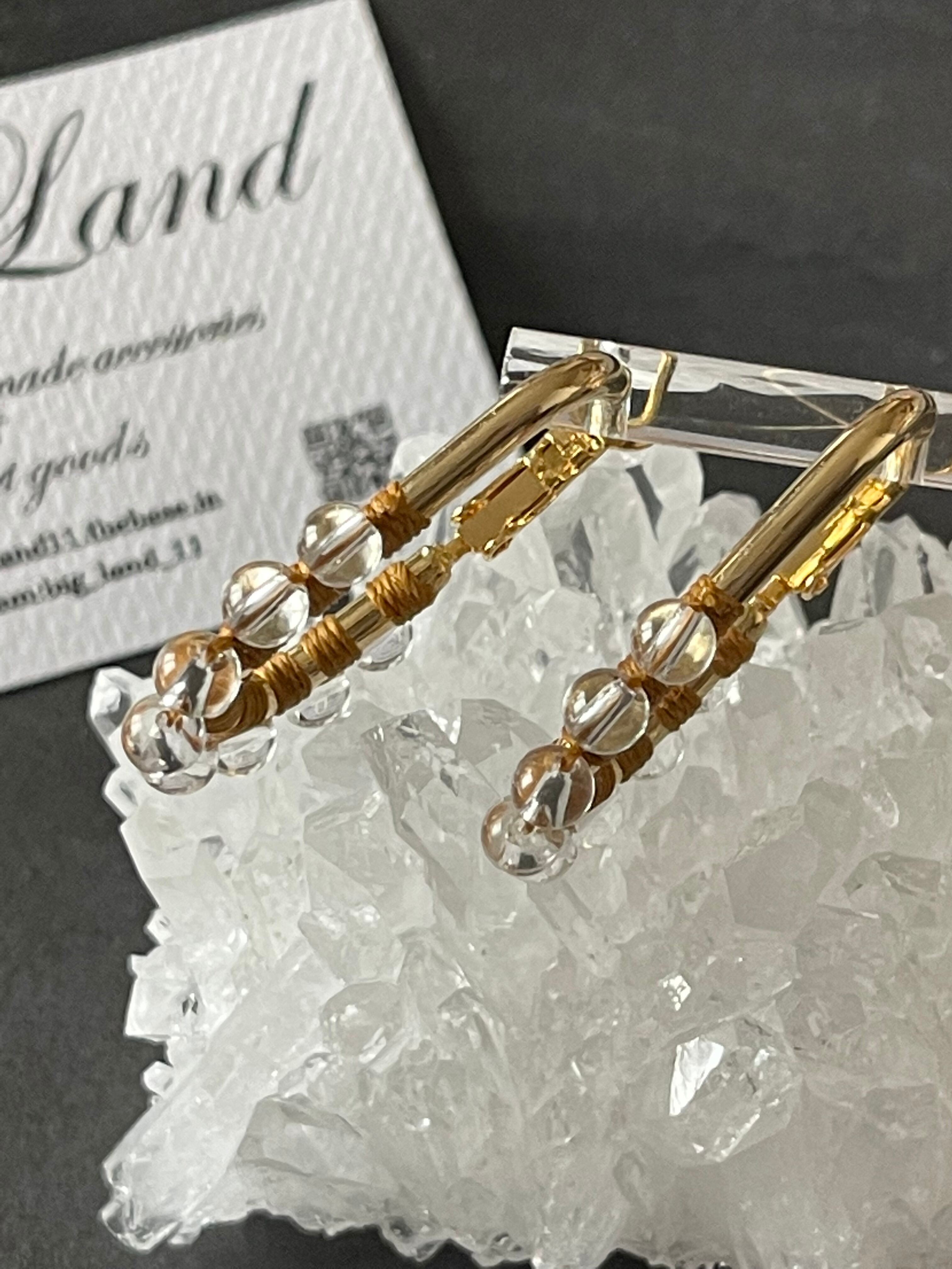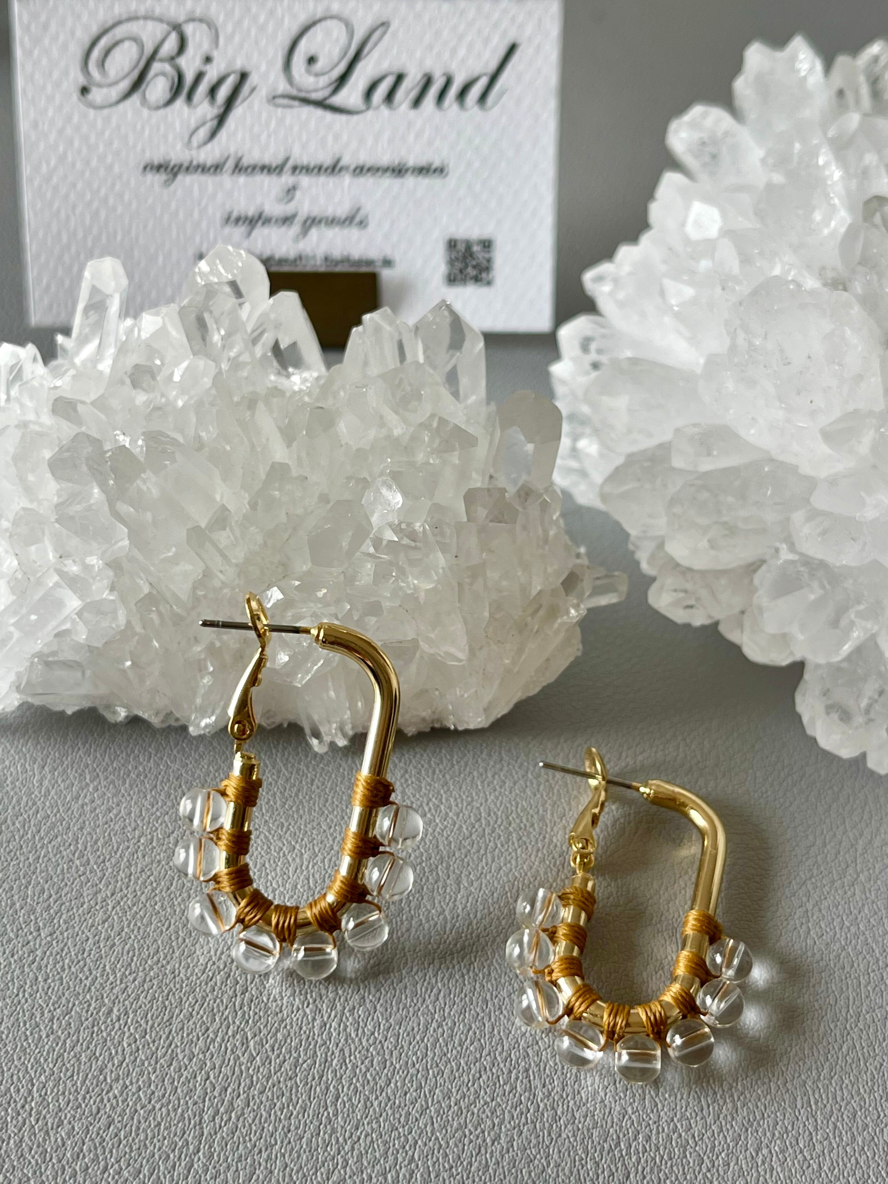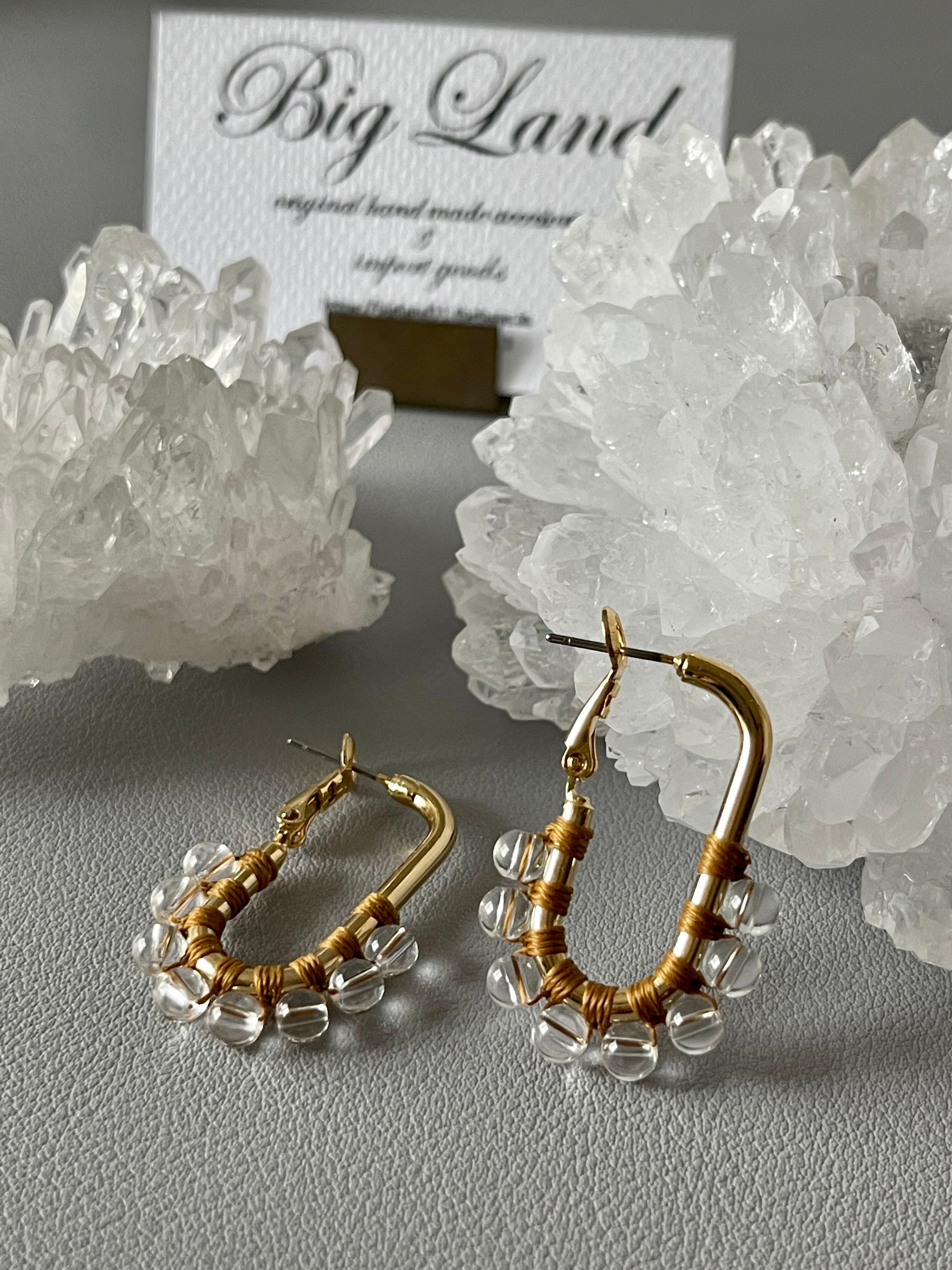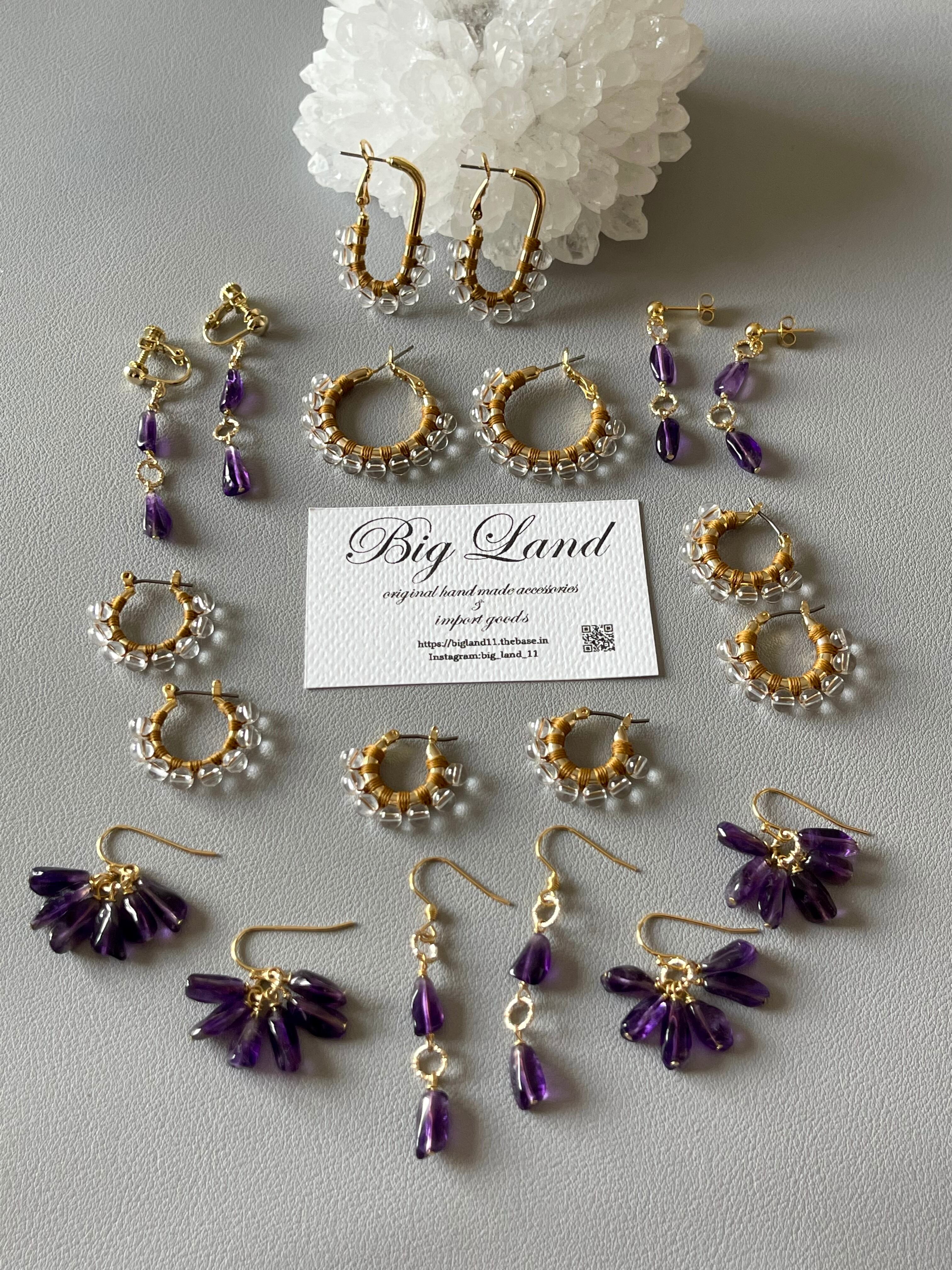 開閉式のぽってりした重厚感あるフープが高品質で、一粒一粒手間をかけて糸でひと編みひと編みしてます
