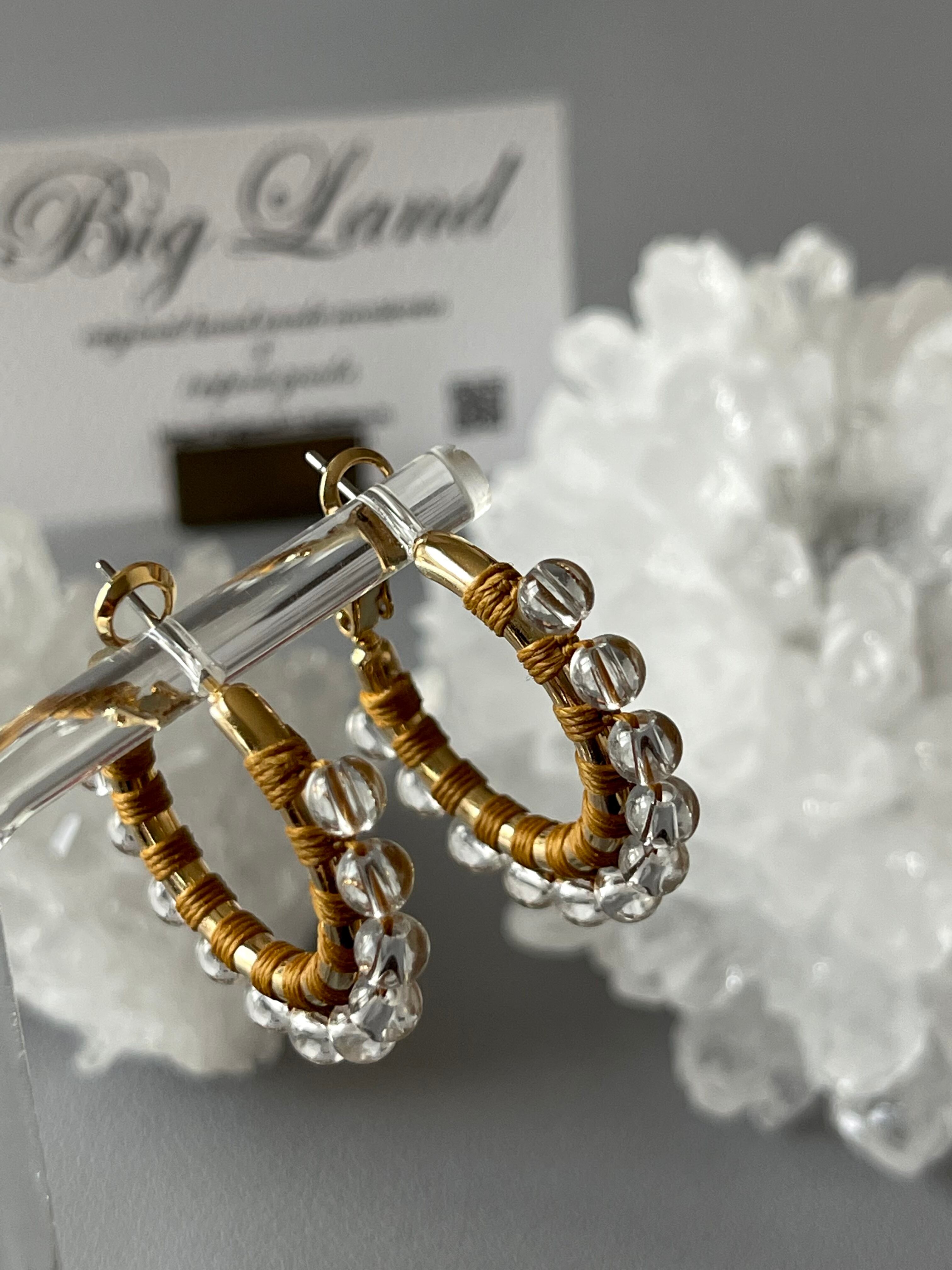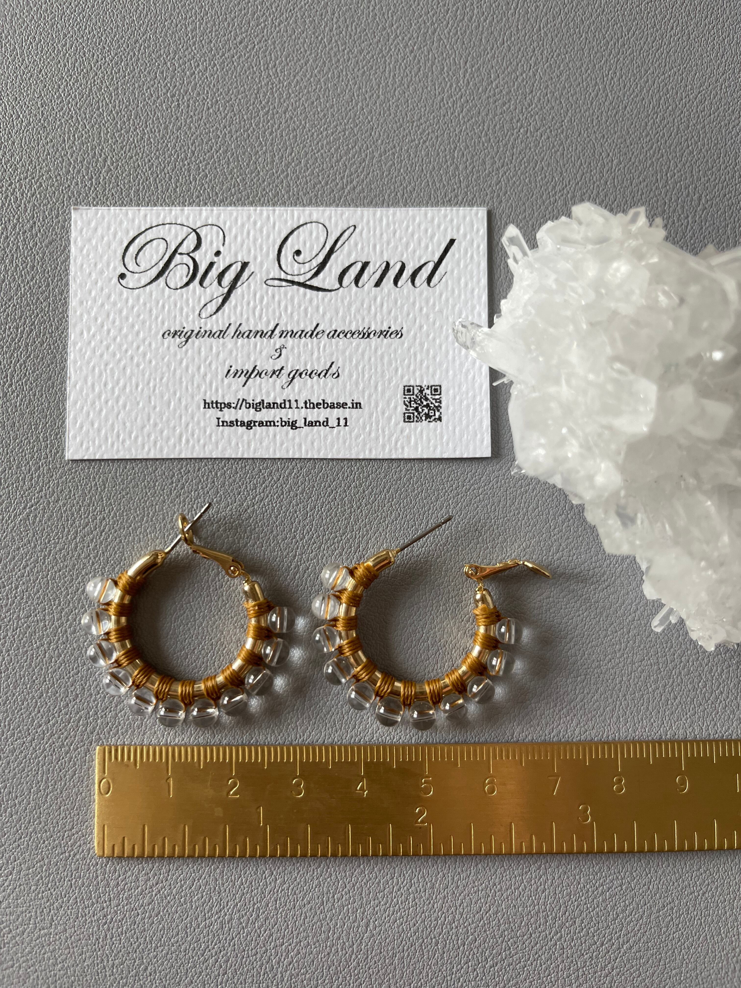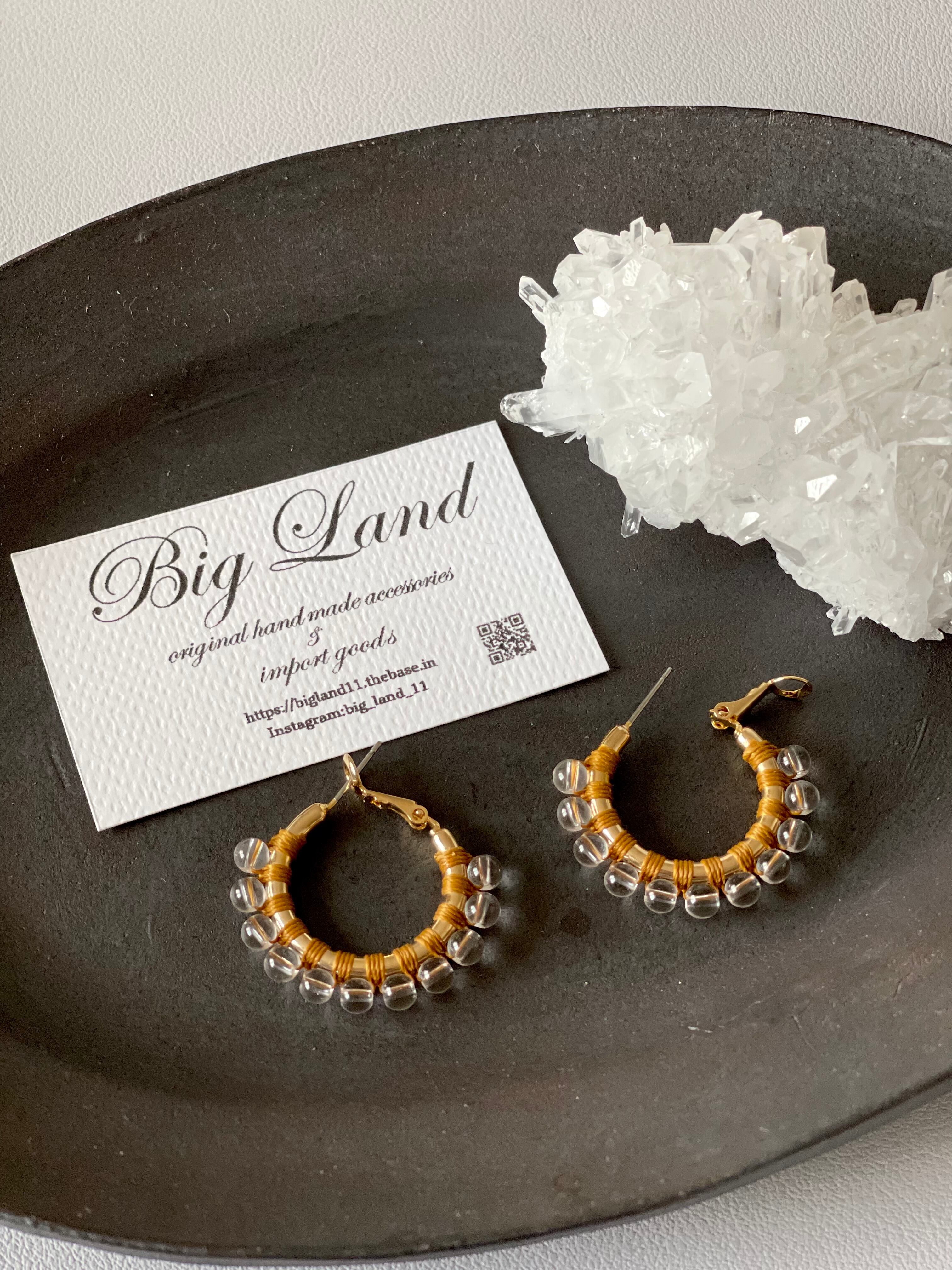 開閉式のぽってりした重厚感あるフープが高品質で、一粒一粒手間をかけて糸でひと編みひと編みしてます