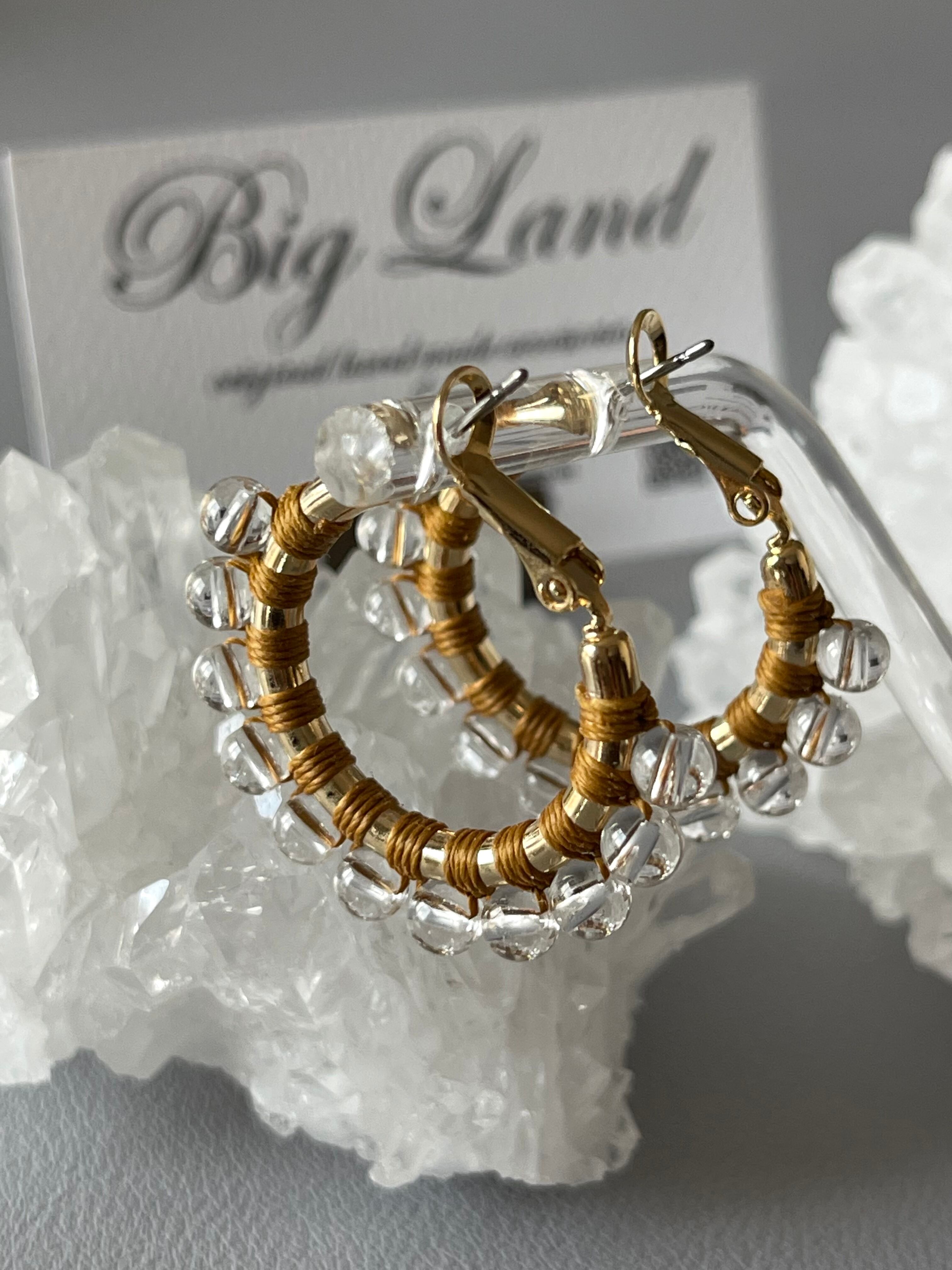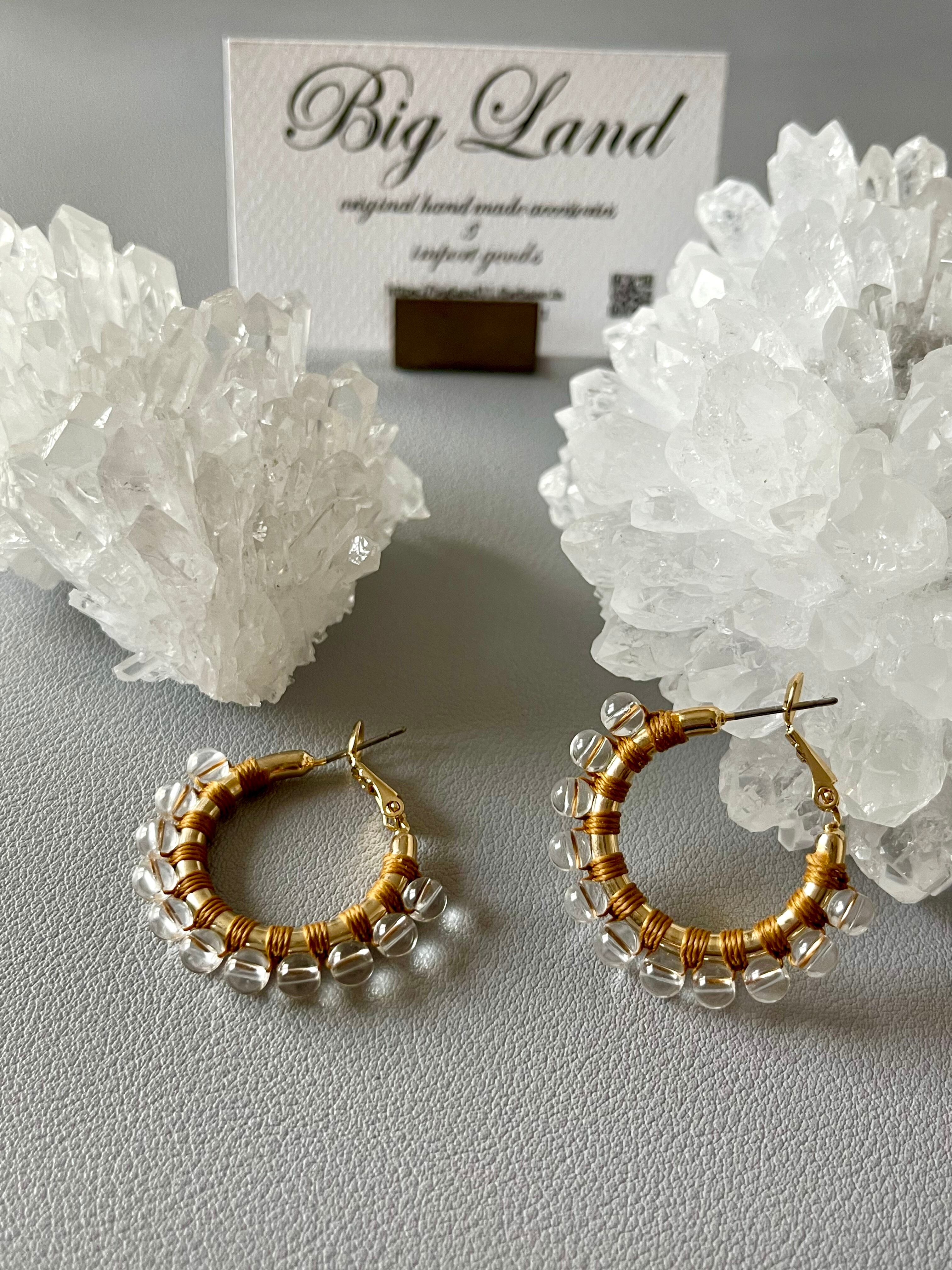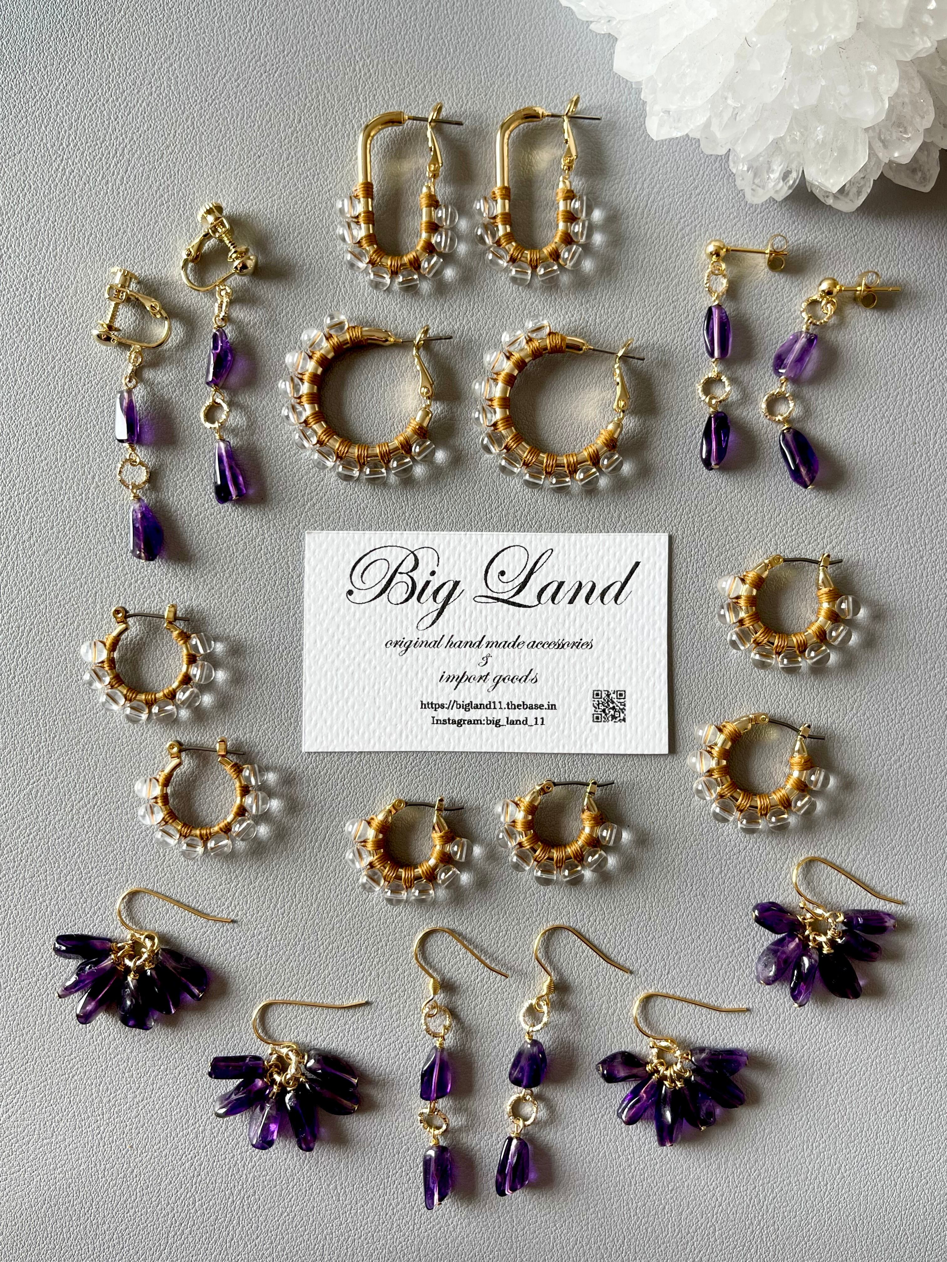 開閉式のぽってりした重厚感あるフープが高品質で、一粒一粒手間をかけて糸でひと編みひと編みしてます