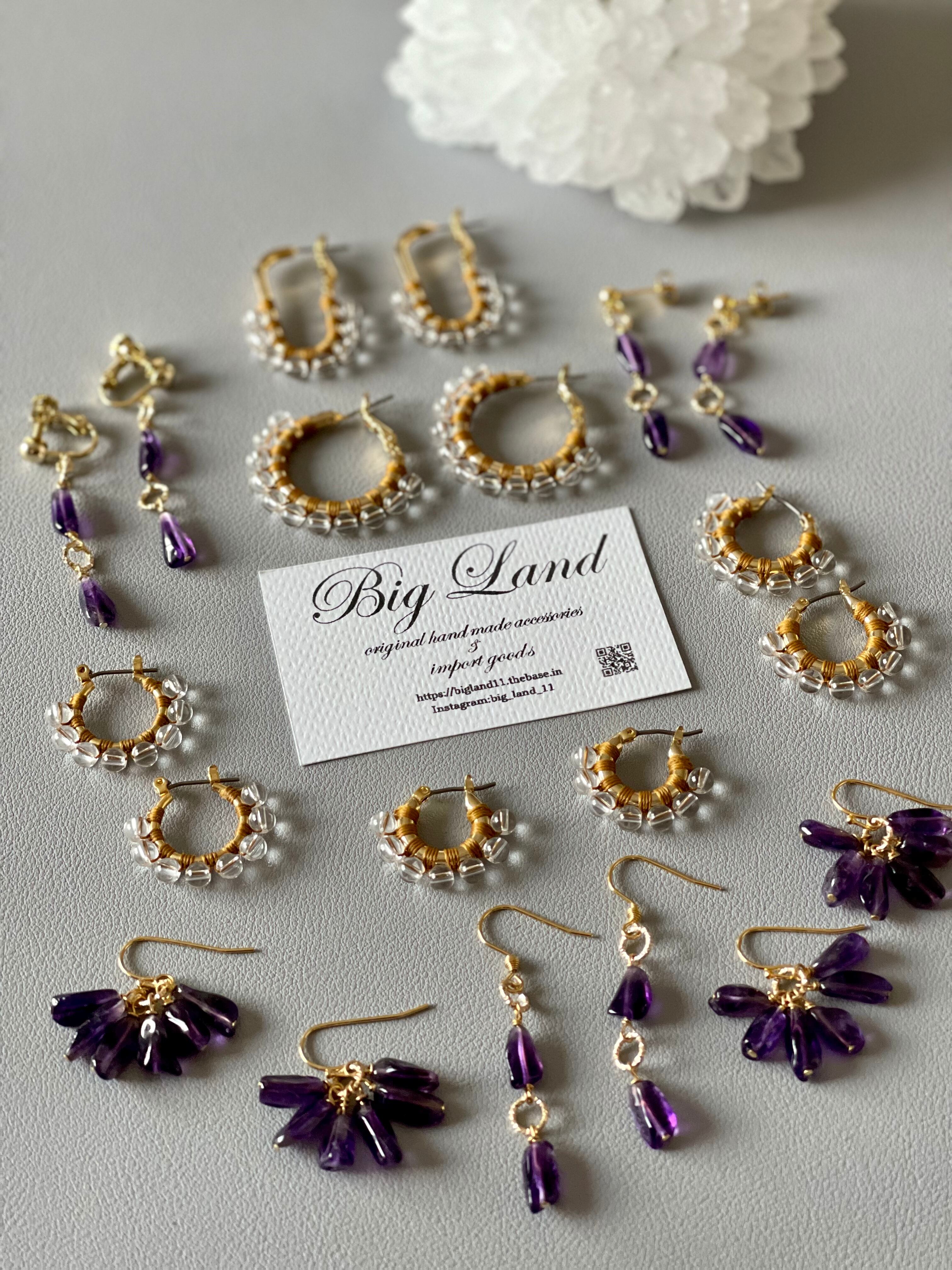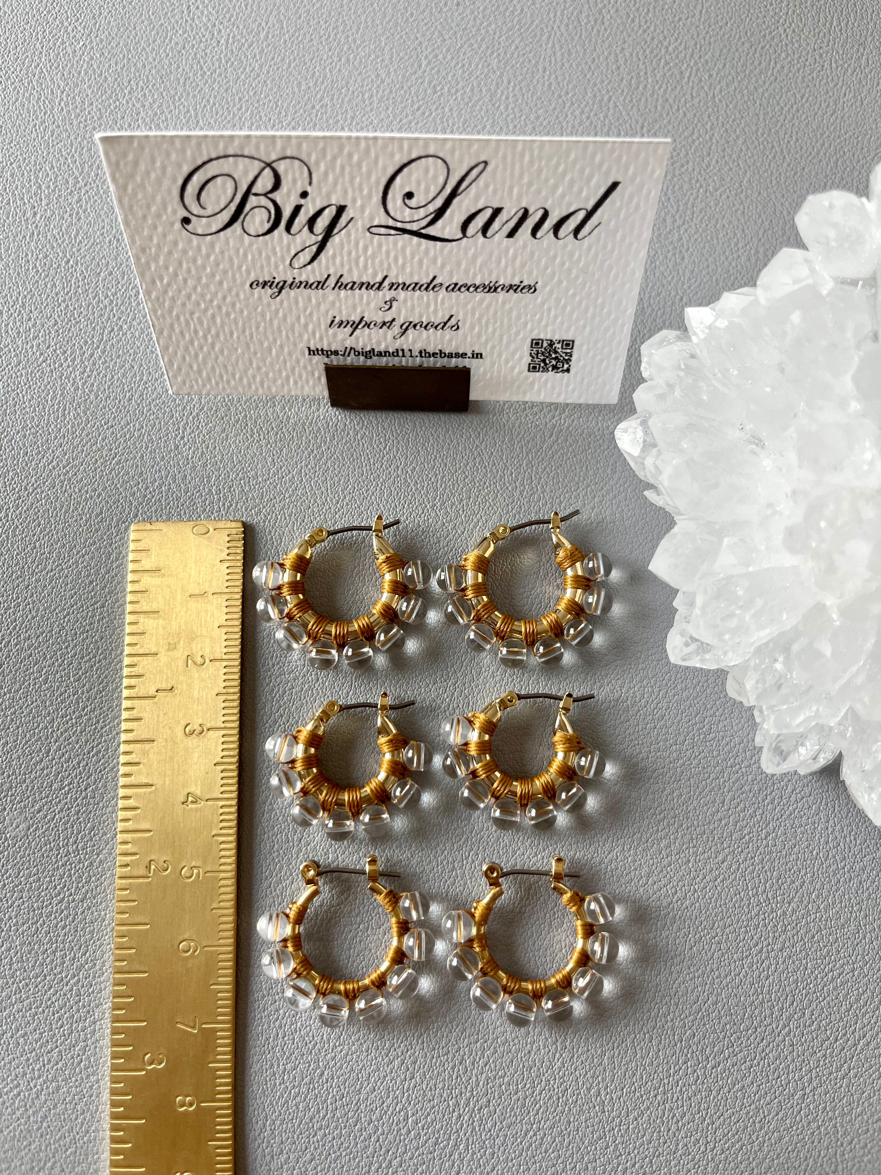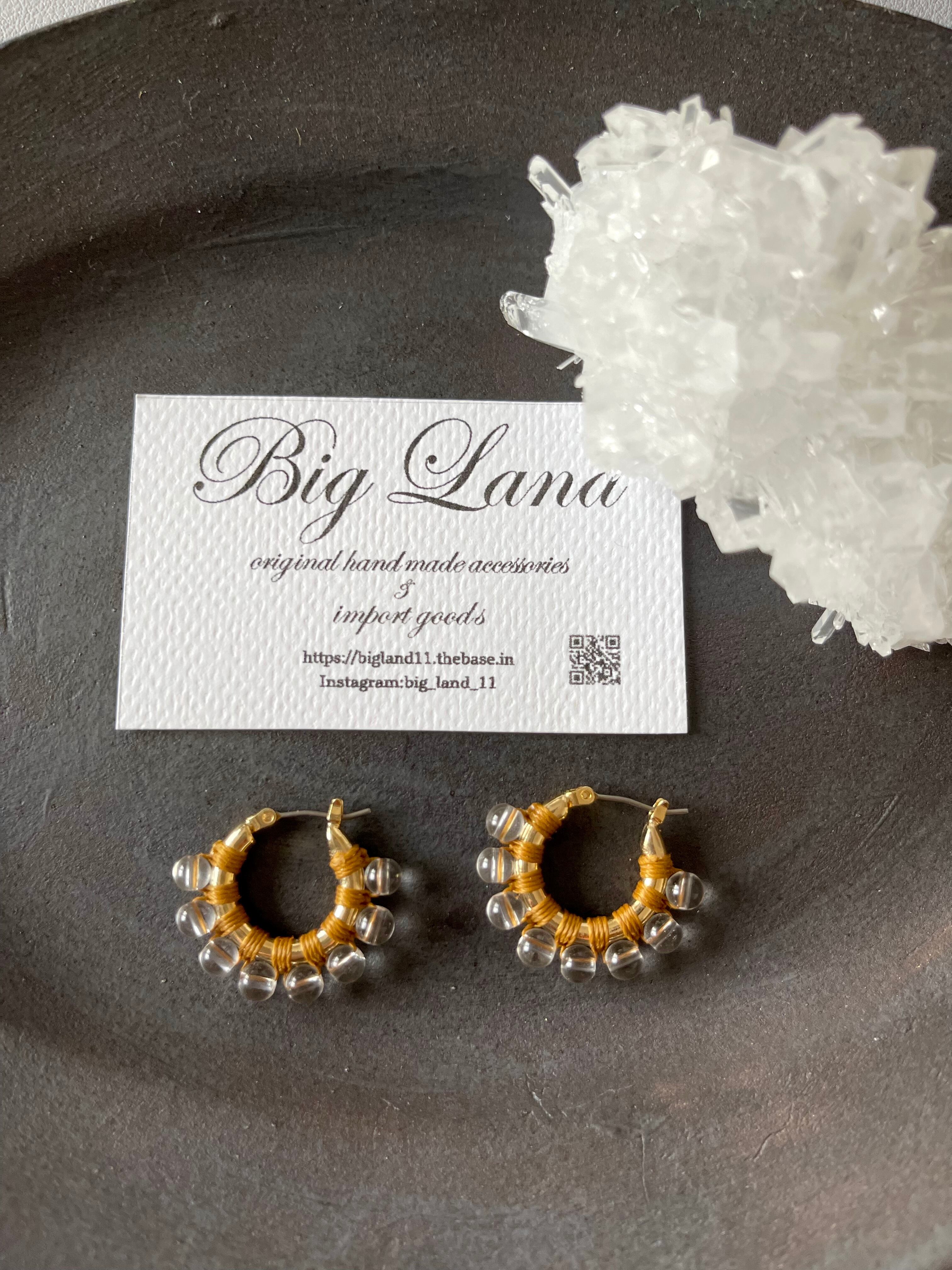 ぽってりした重厚感あるフープが高品質で、一粒一粒手間をかけて糸でひと編みひと編みしてます