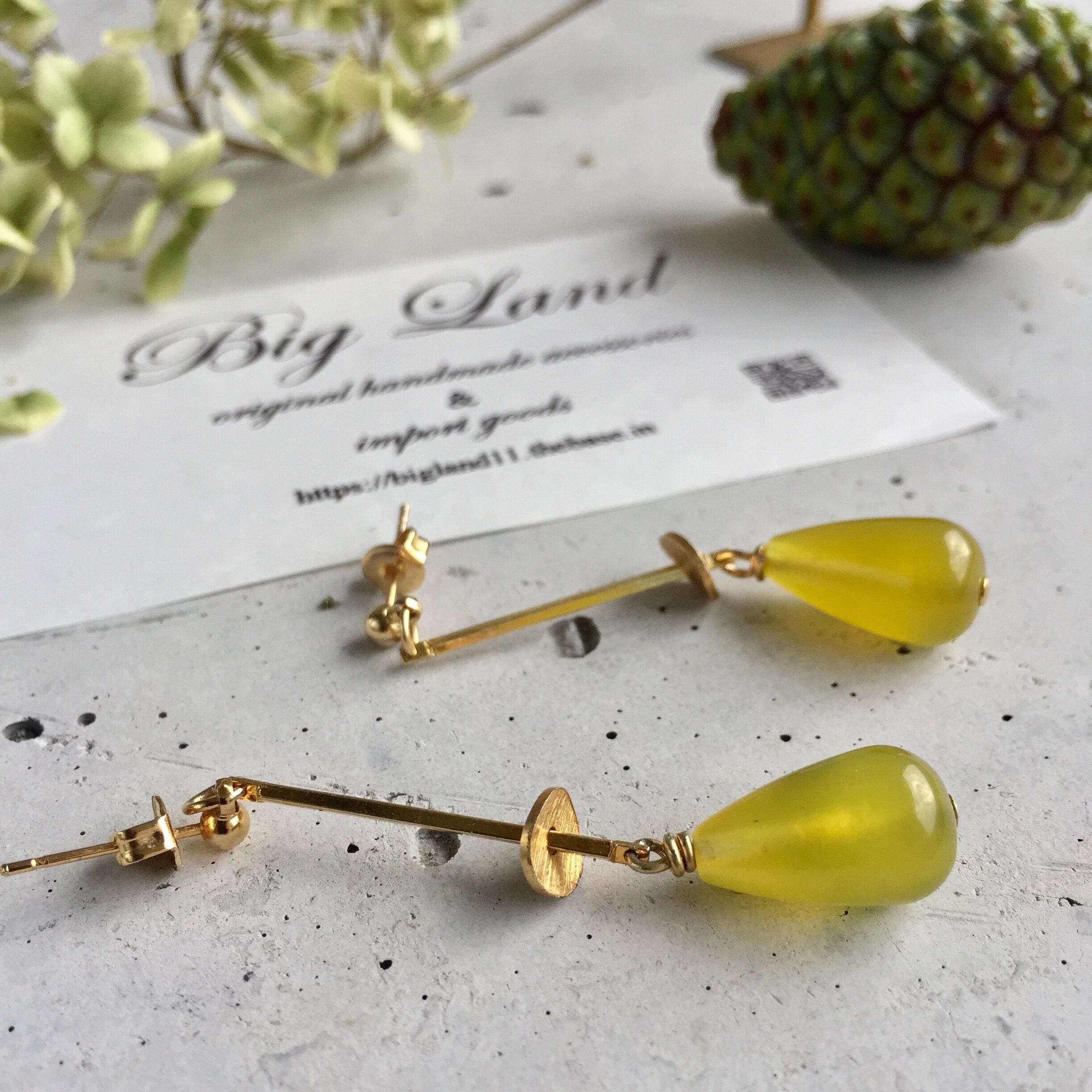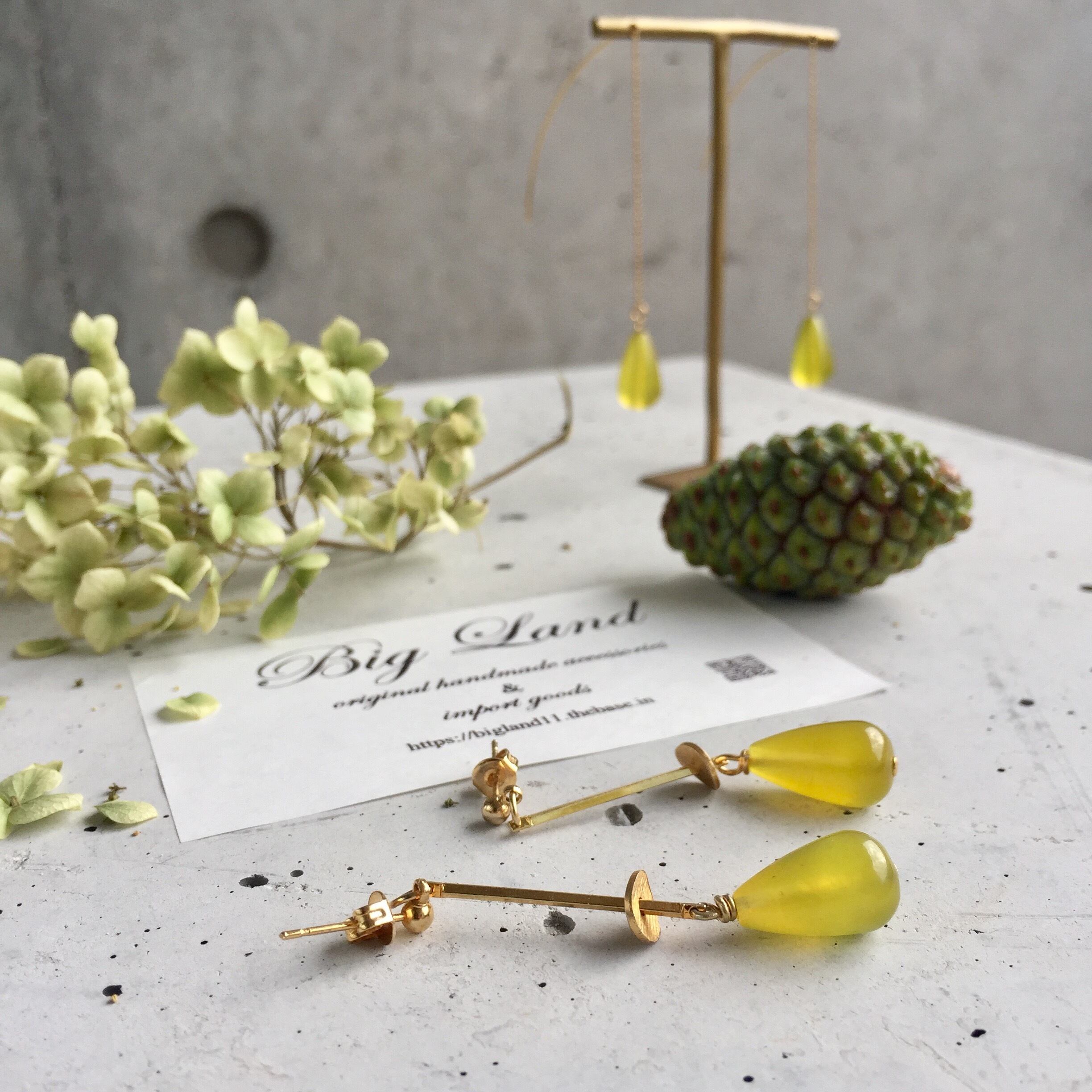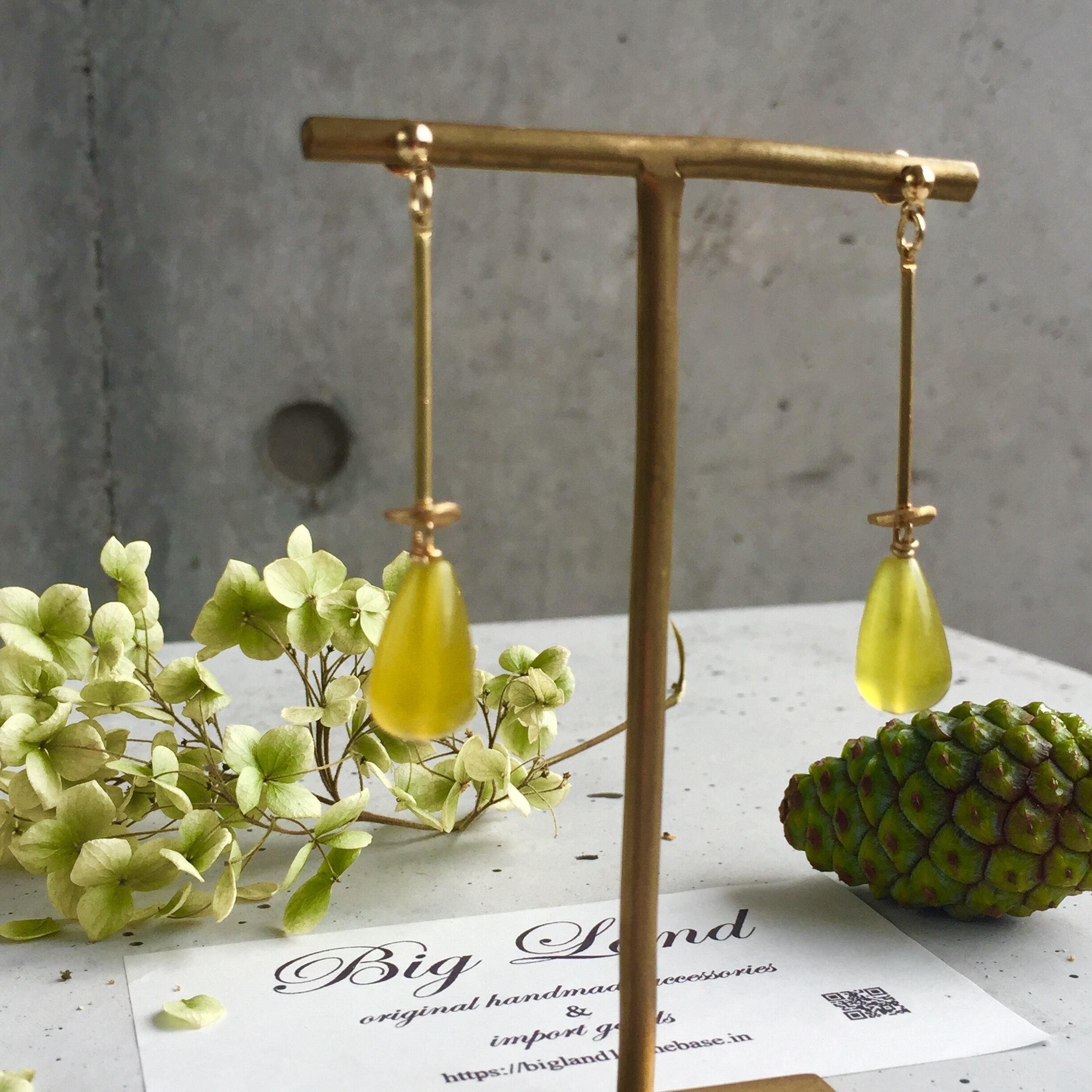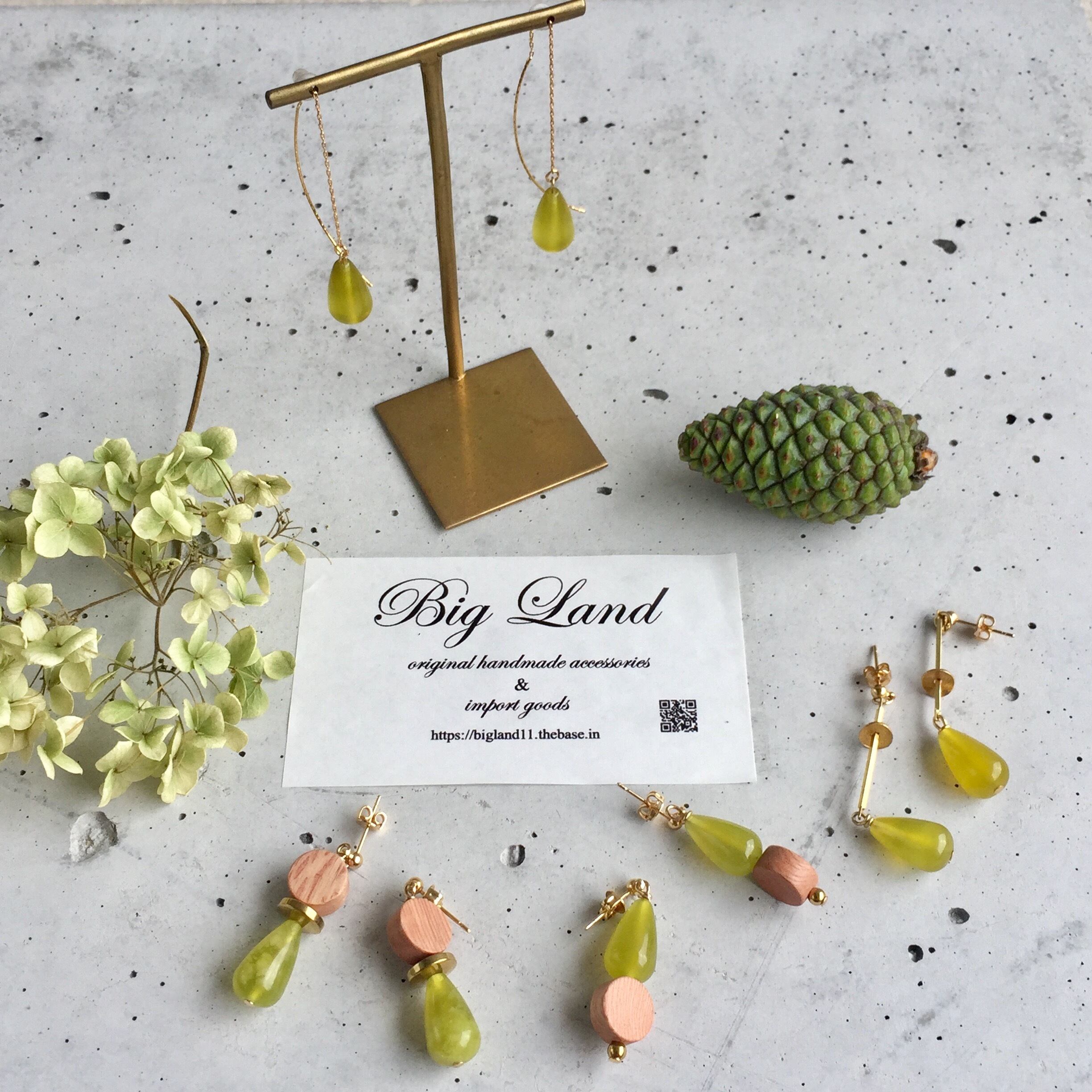 黄緑色の明るい天然石と棒ピアスの間にマットゴールドを入れる事により、オシャレ度が増します✨