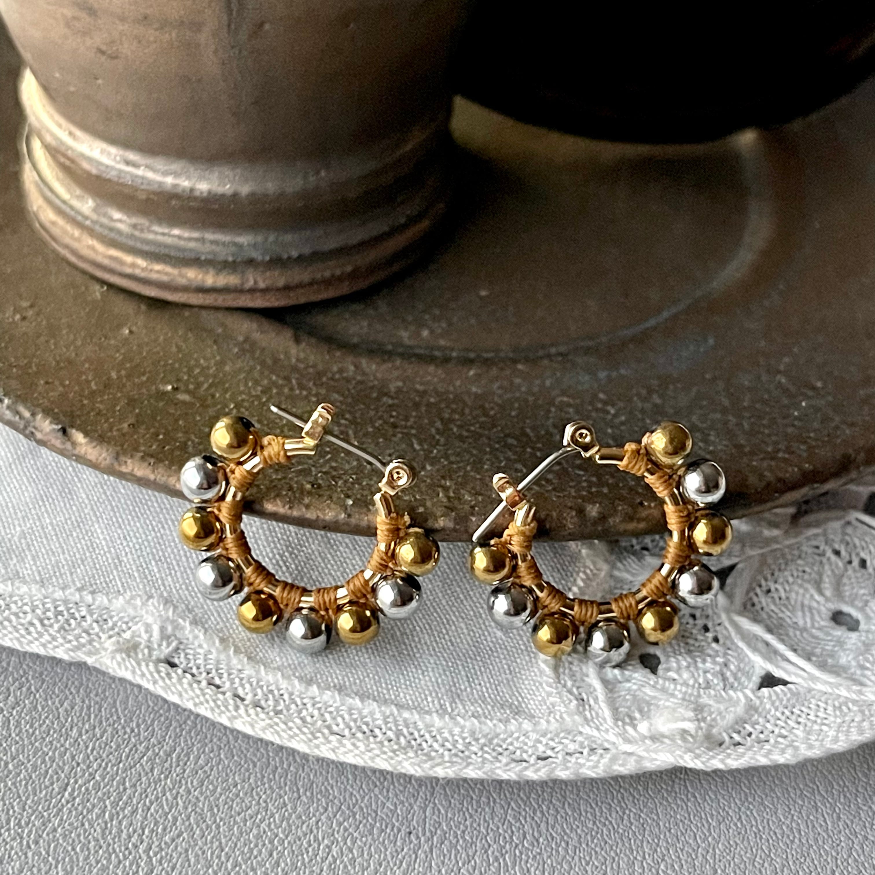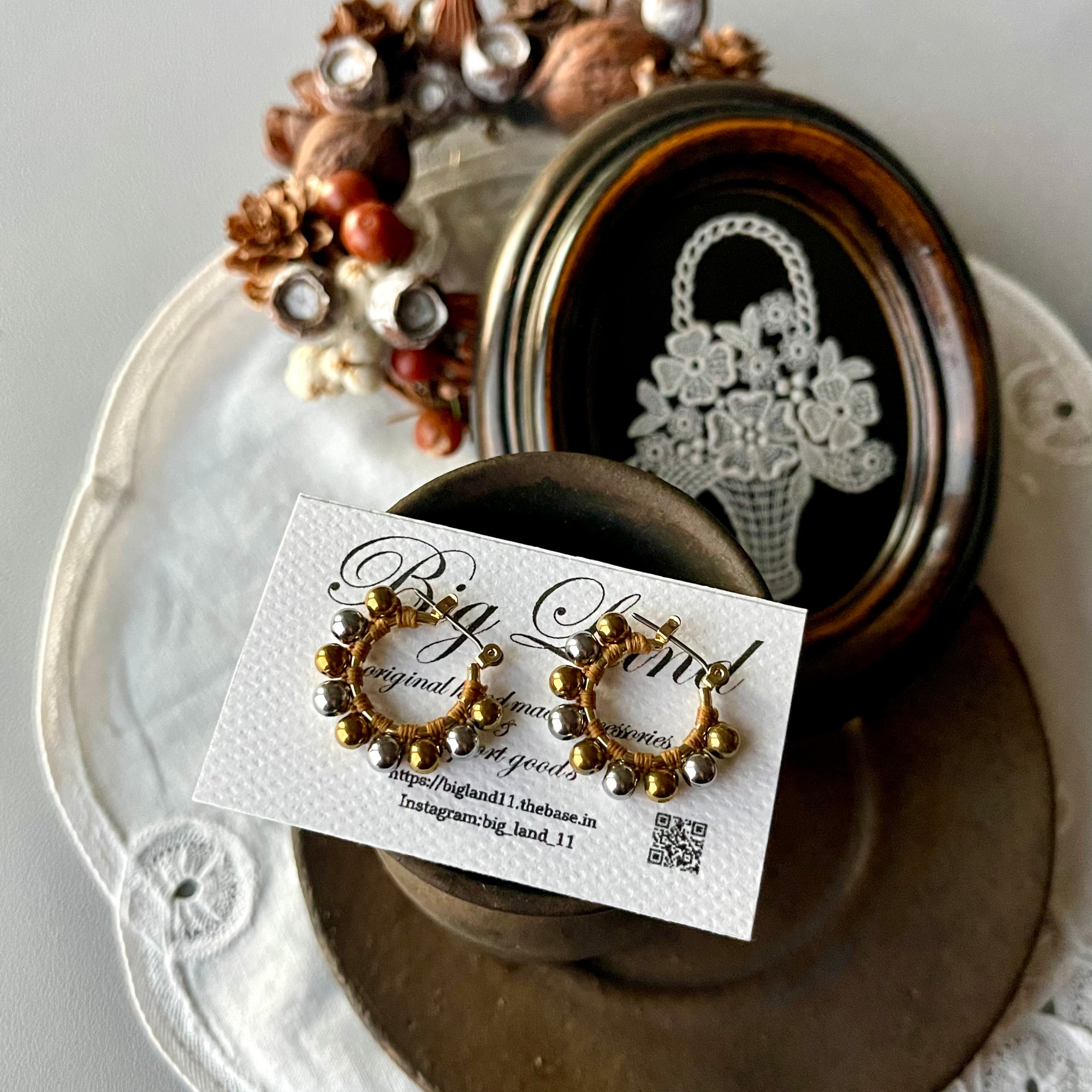 コンビカラーで仕上げた事により、シルバー&ゴールド両方のお色のアクセとコーデが可能なのでオシャレの幅が広がり一粒一粒手間をかけて編んでます