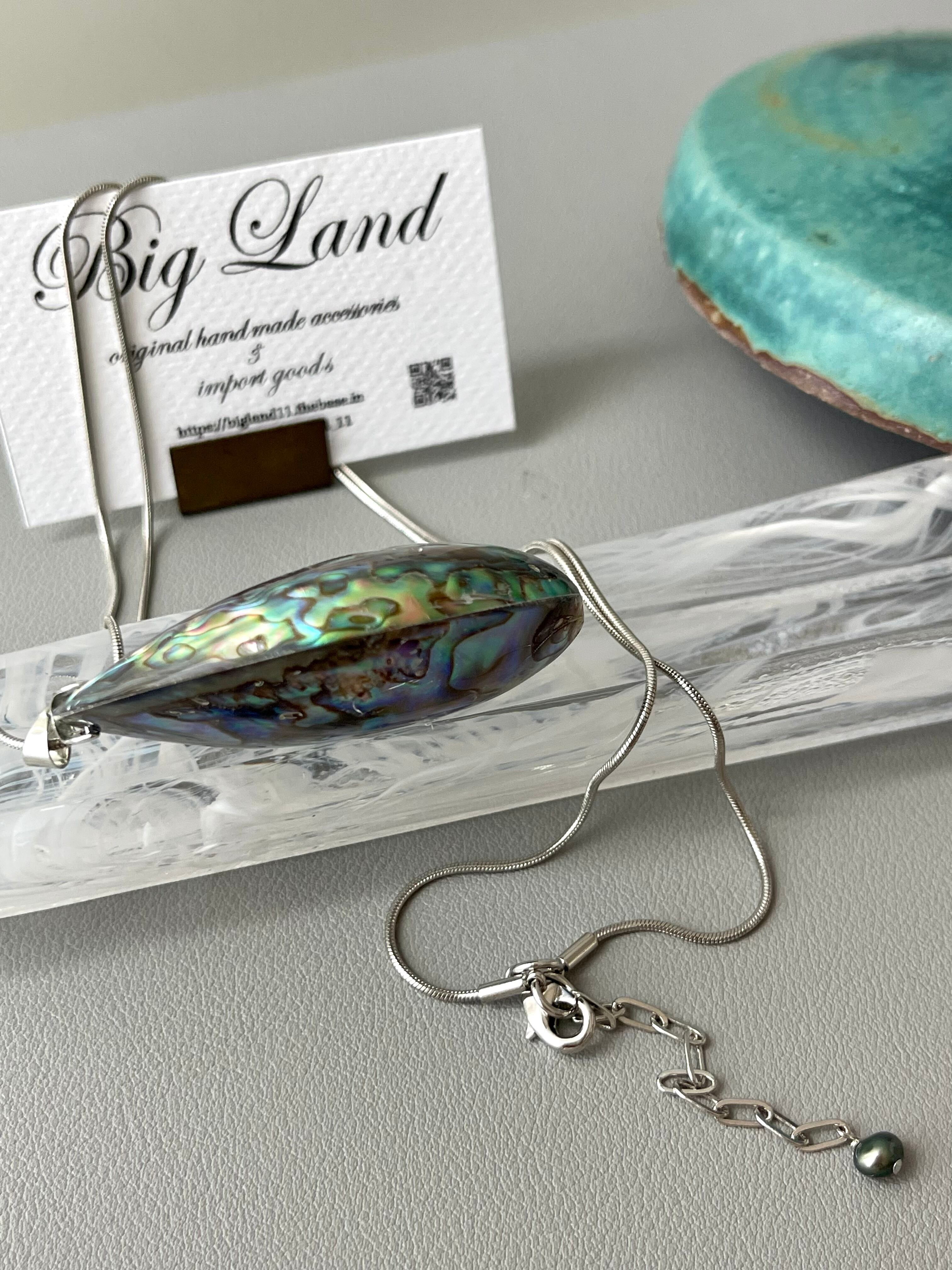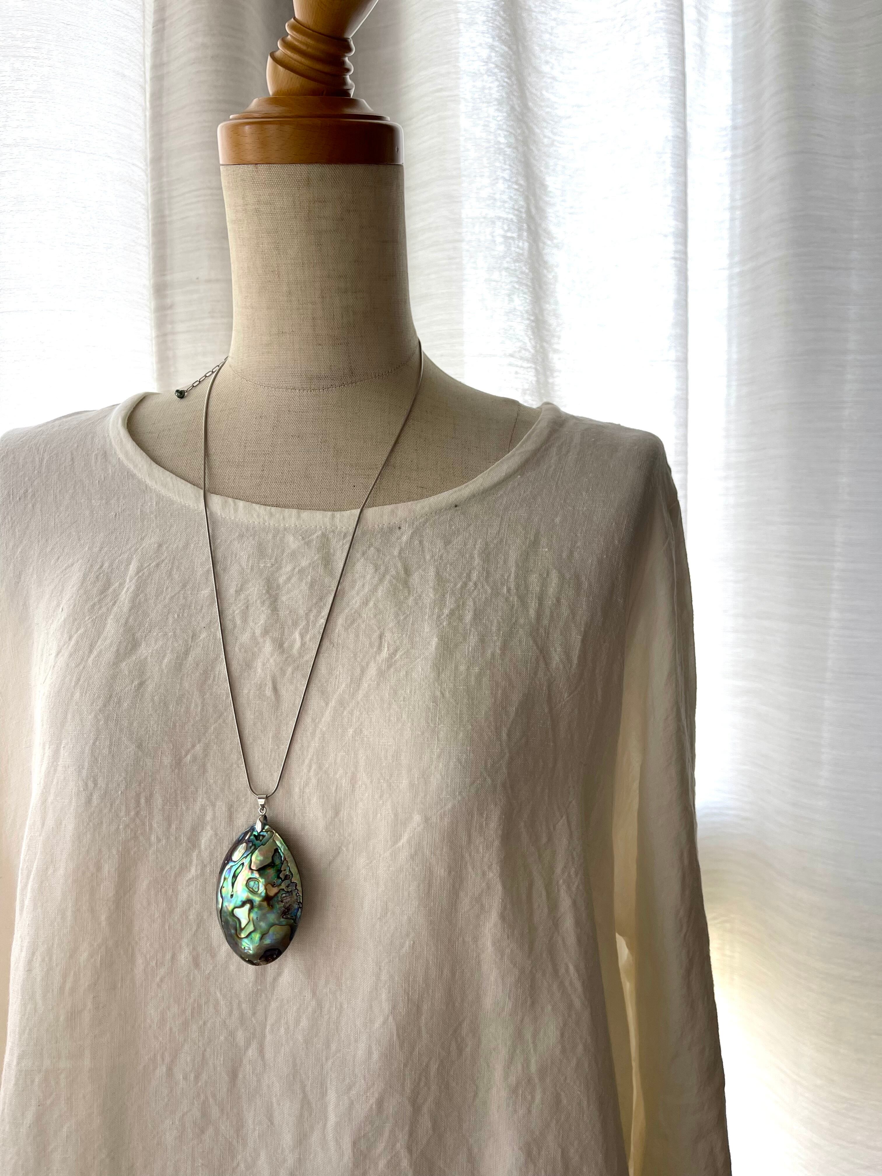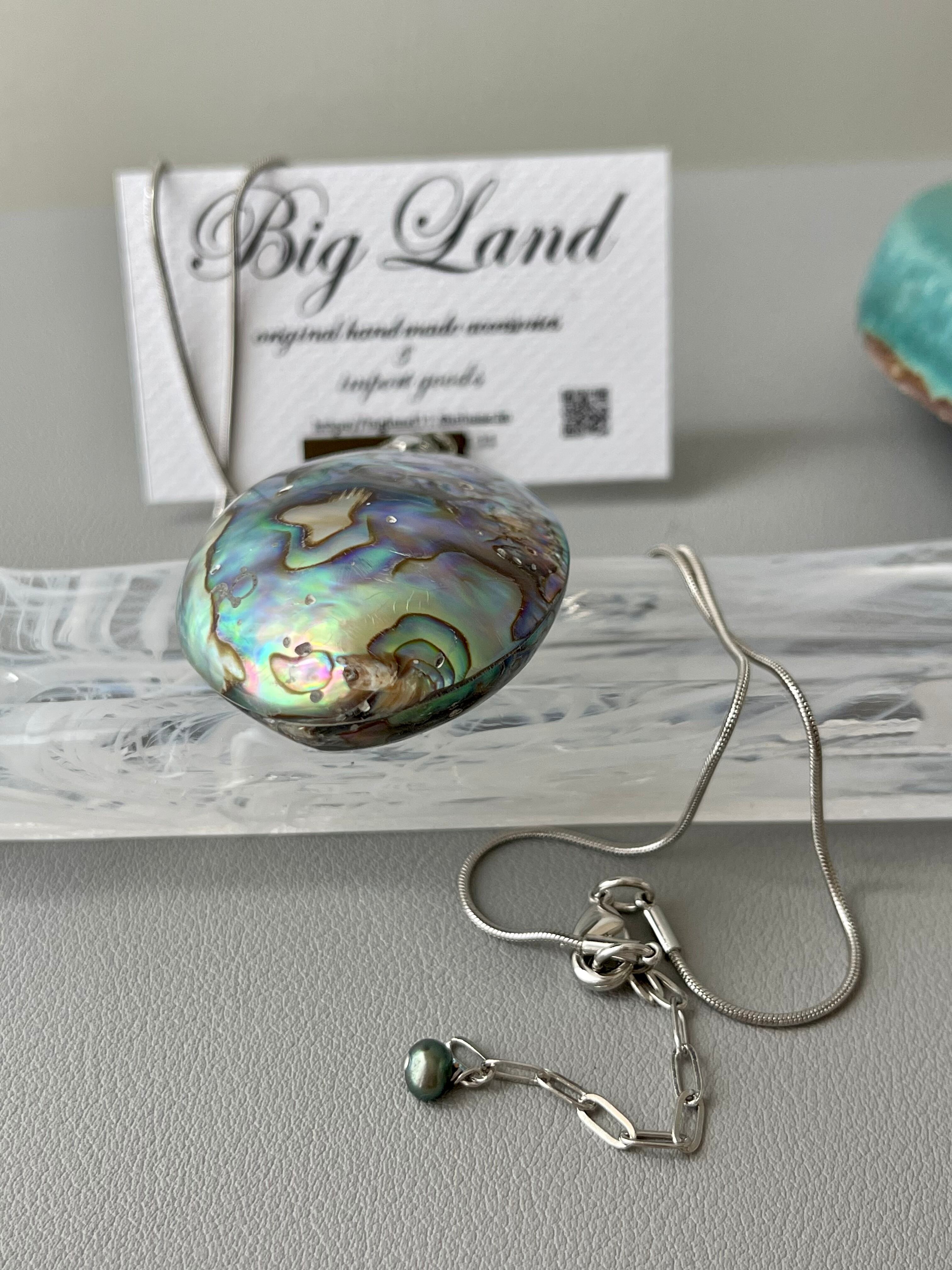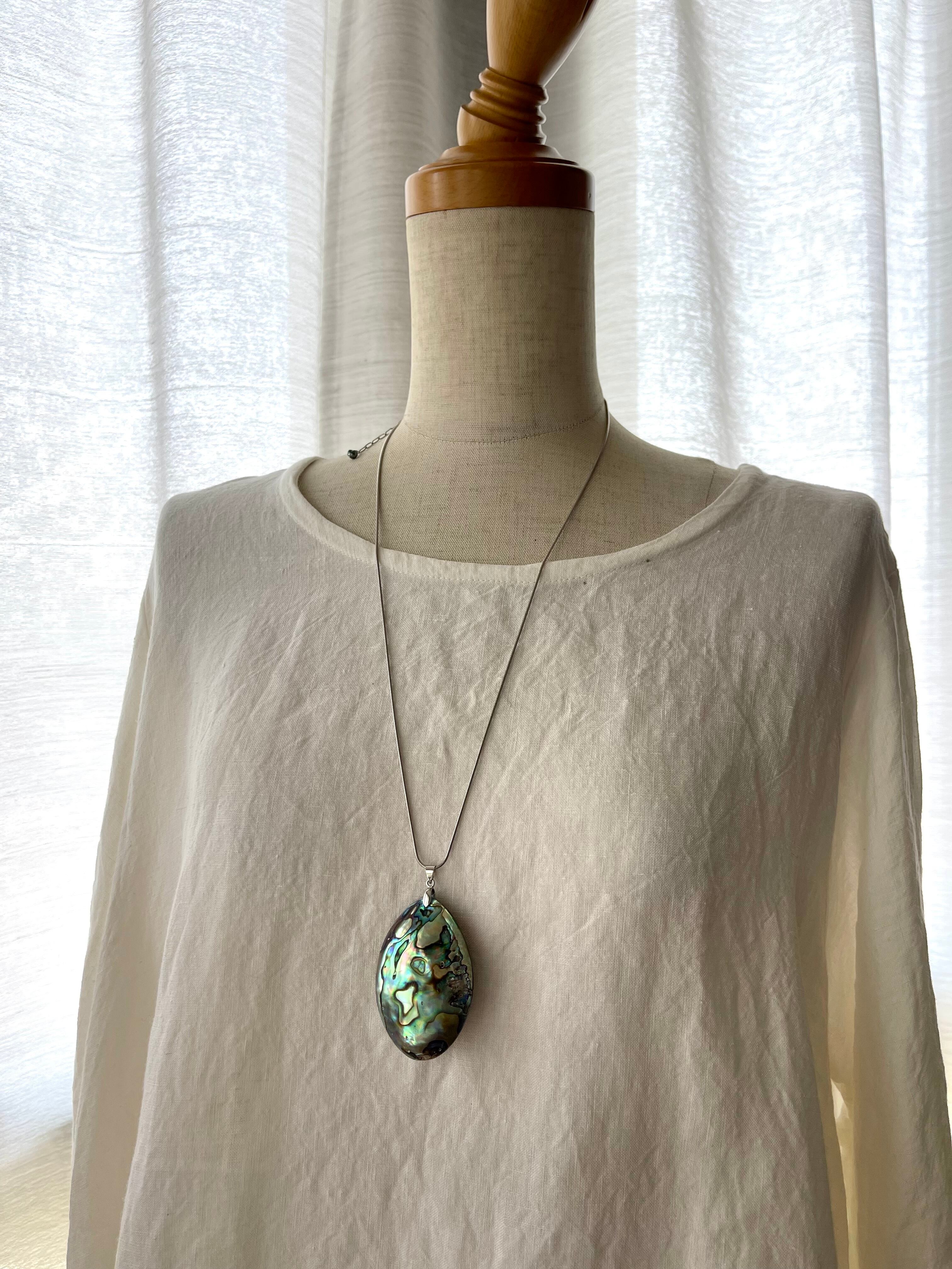 自然の美しさから生まれた模様のアバロンシェルのネックレスは華があり、太陽の光を浴びると、ピンクやオレンジ、イエローといった色が混ざり合う天然カラ〜に溜め息が出る.....
