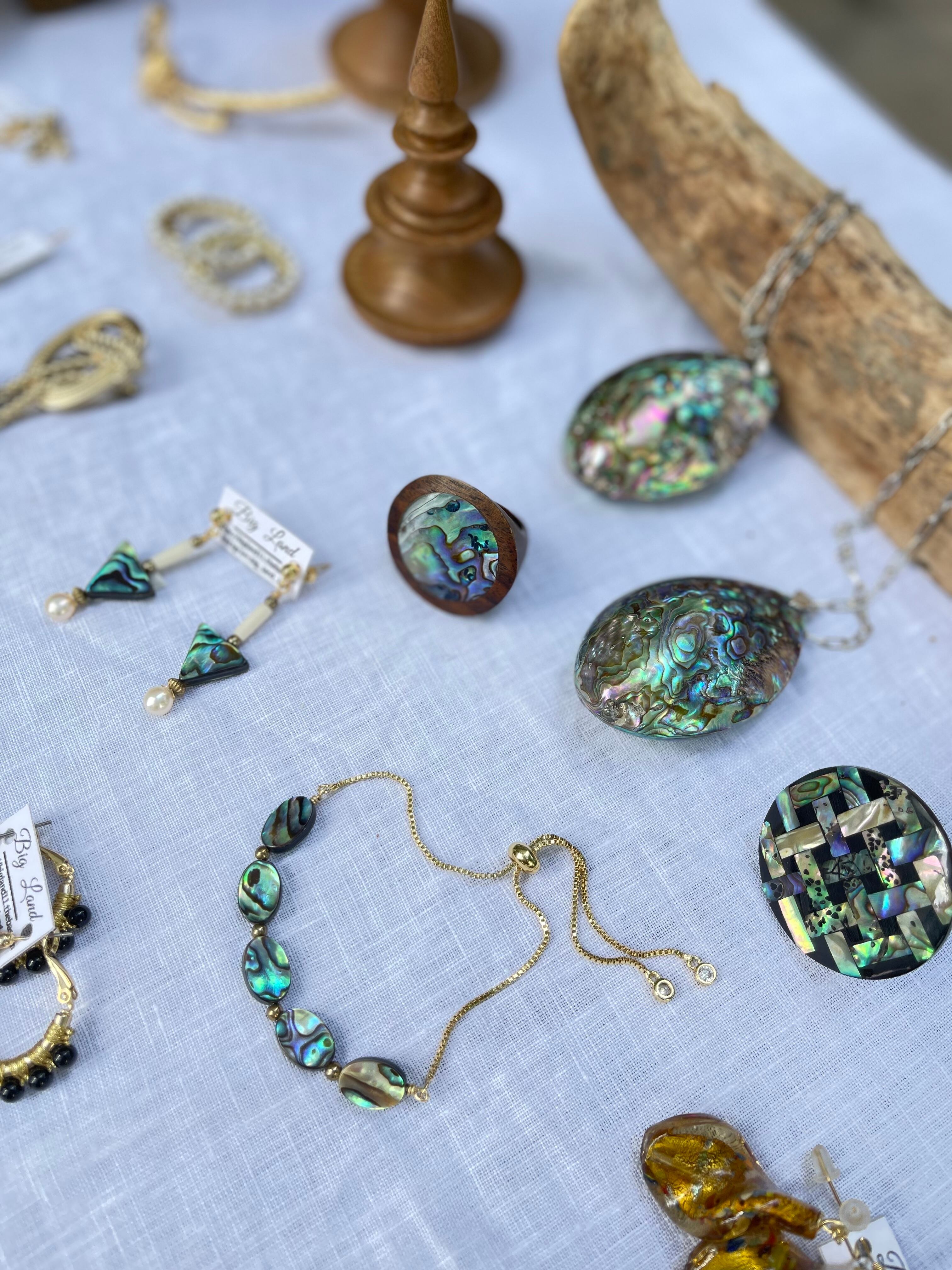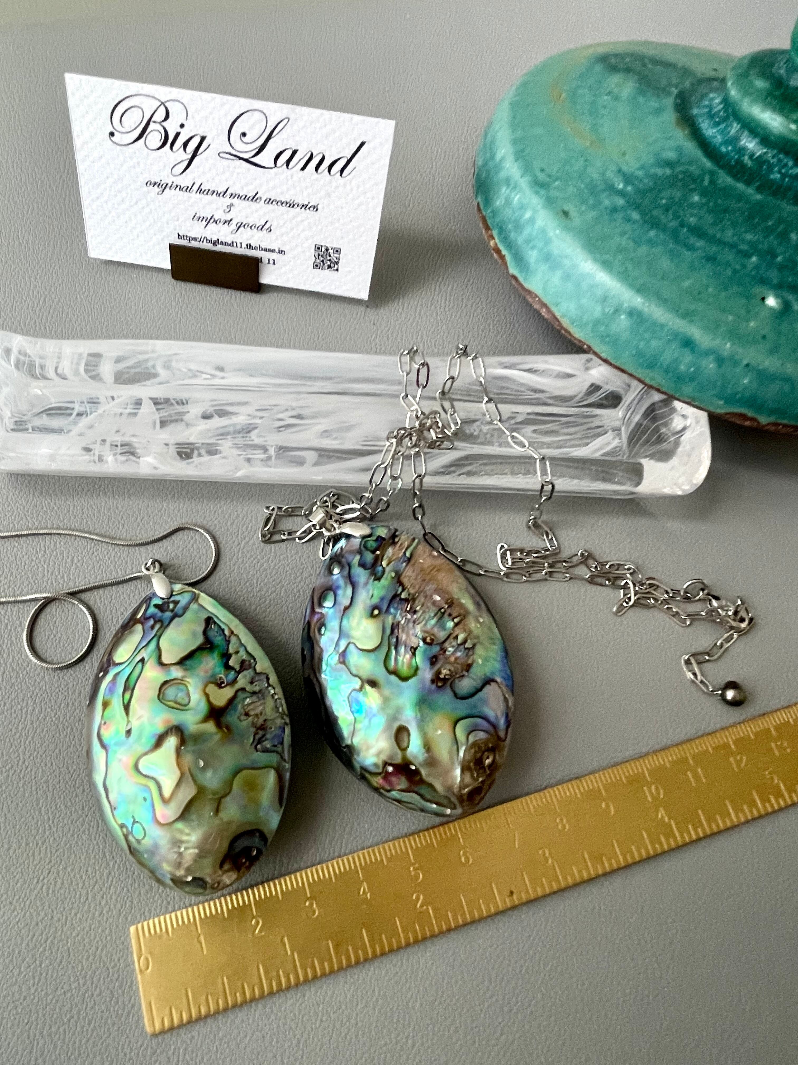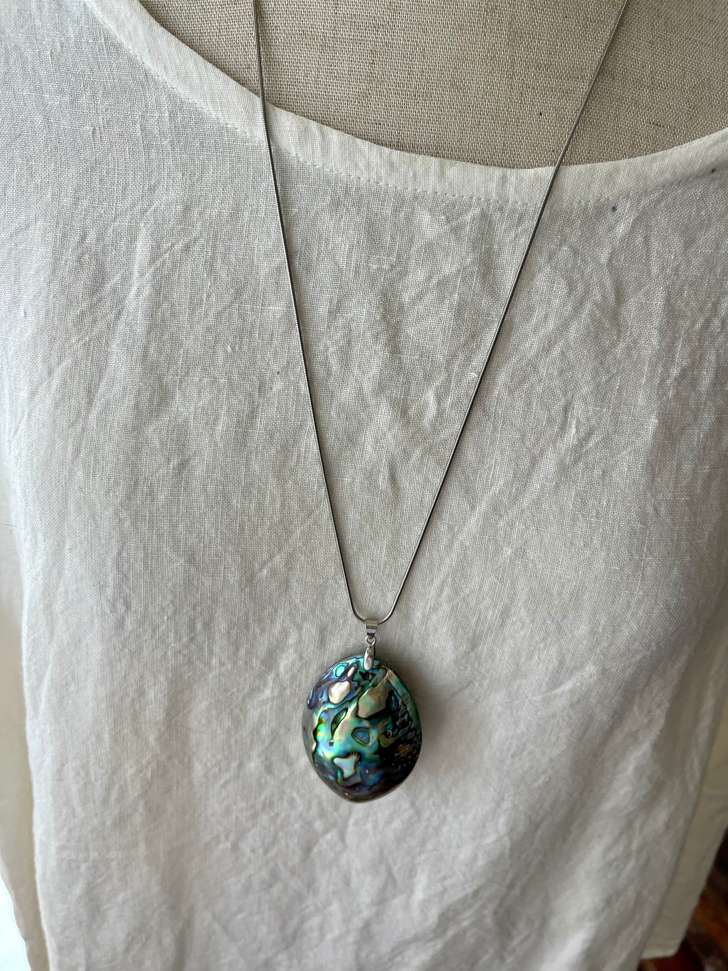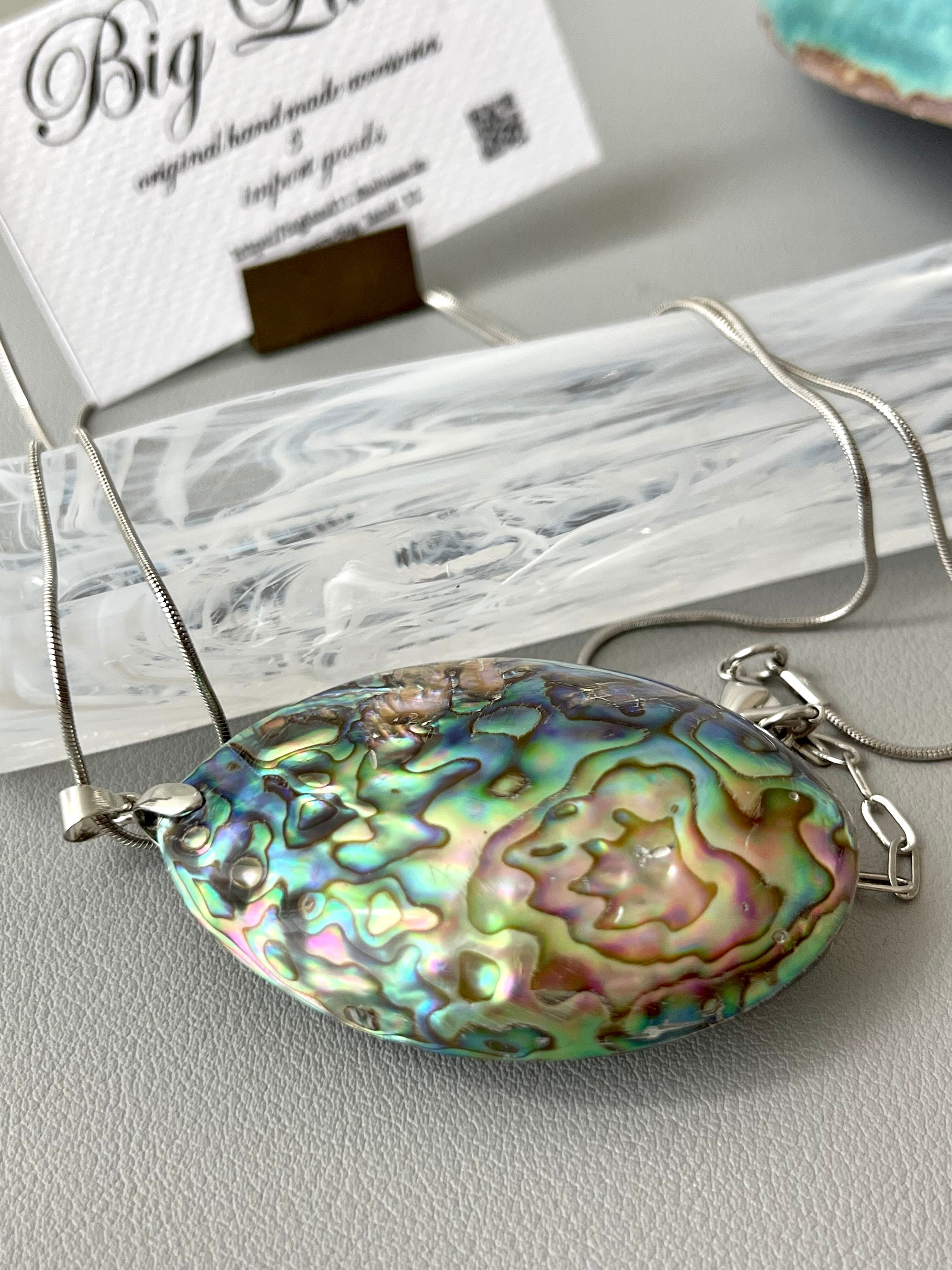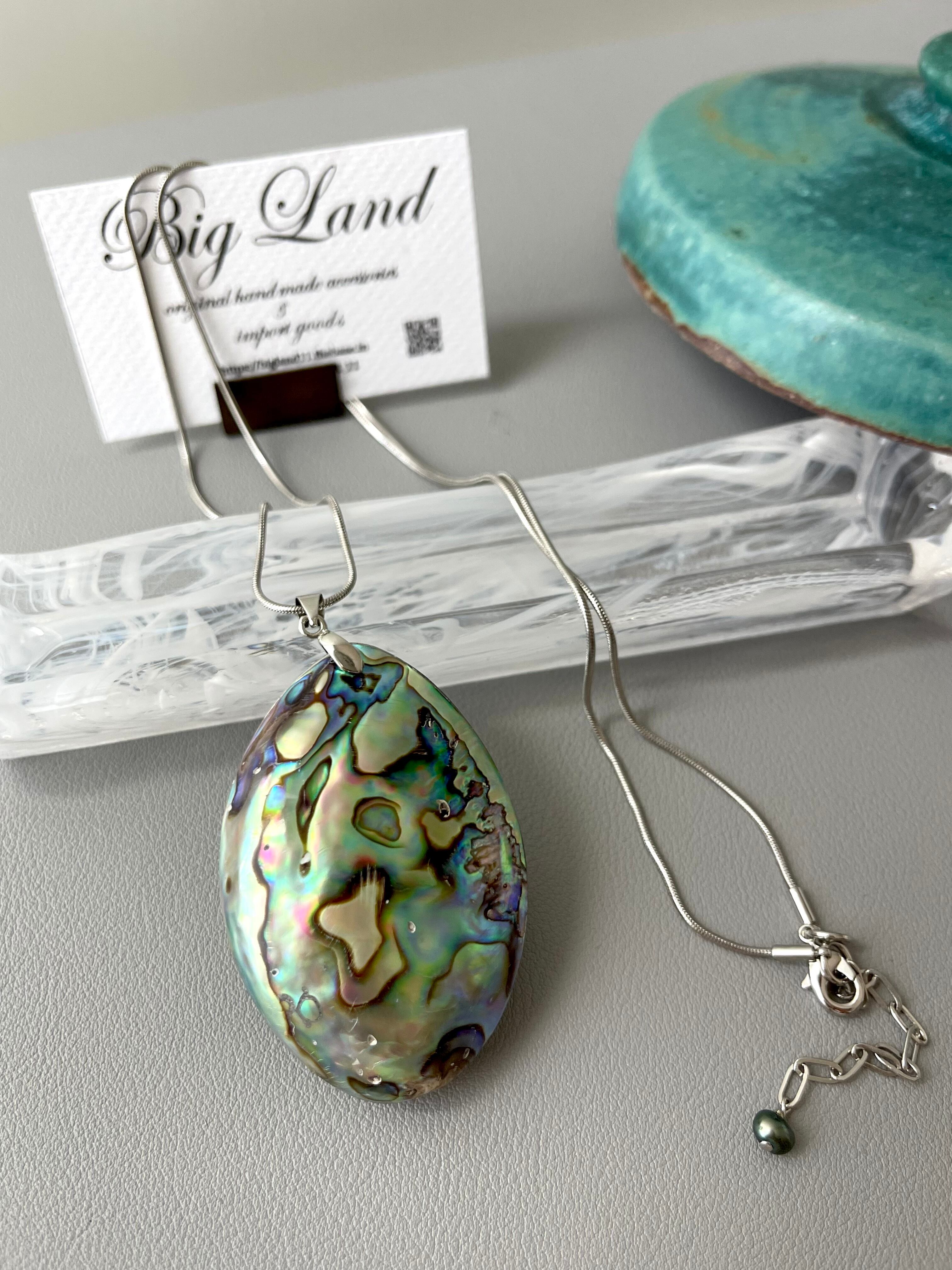 自然の美しさから生まれた模様のアバロンシェルのネックレスは華があり、太陽の光を浴びると、ピンクやオレンジ、イエローといった色が混ざり合う天然カラ〜に溜め息が出る.....