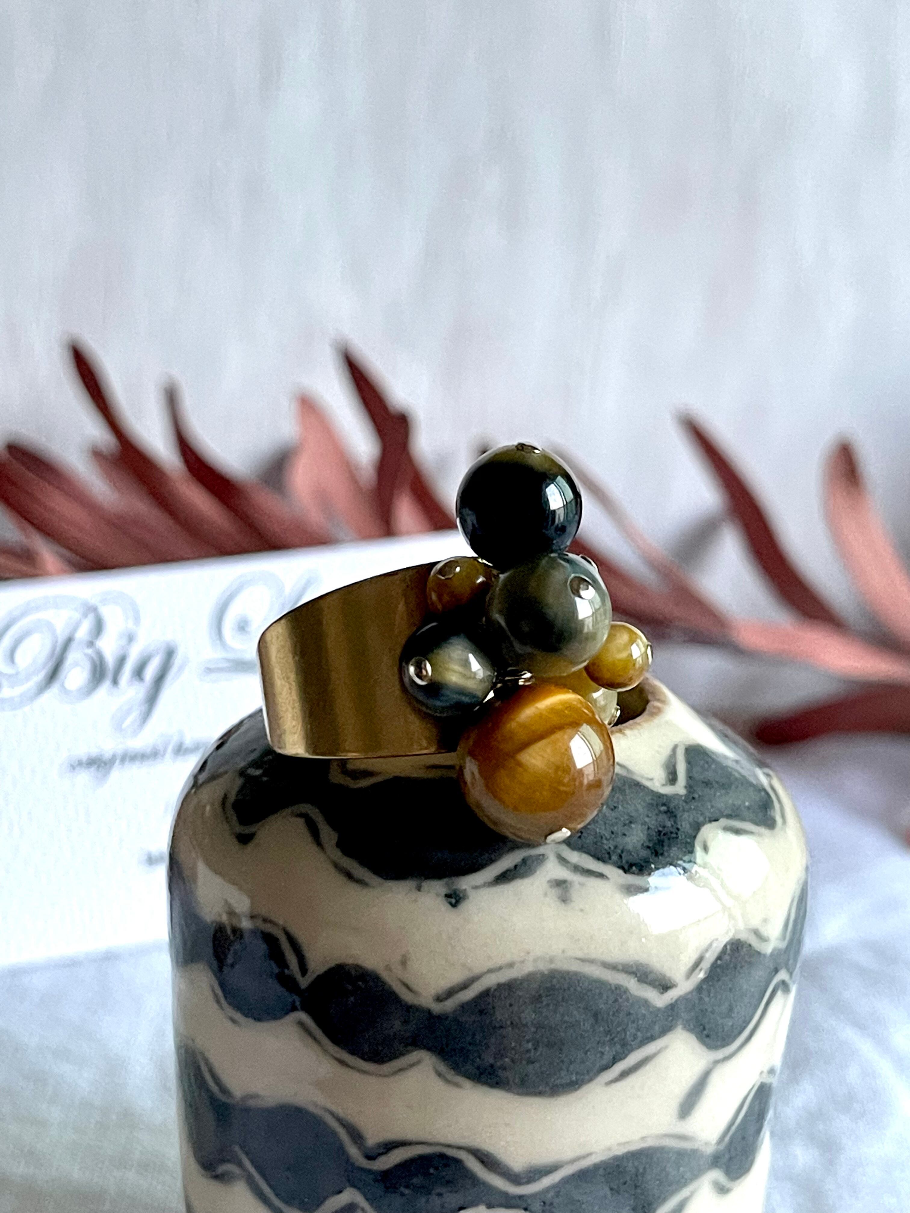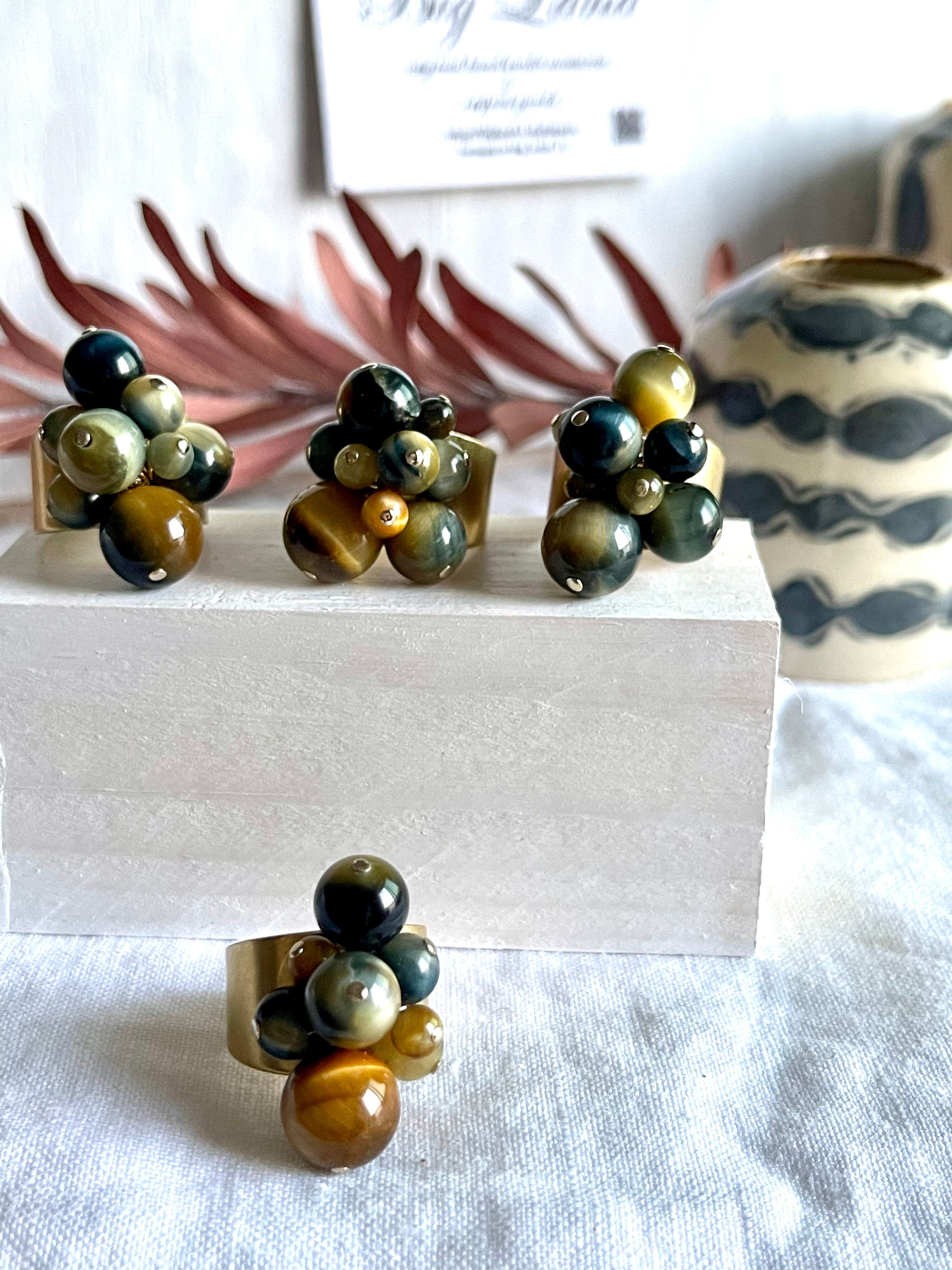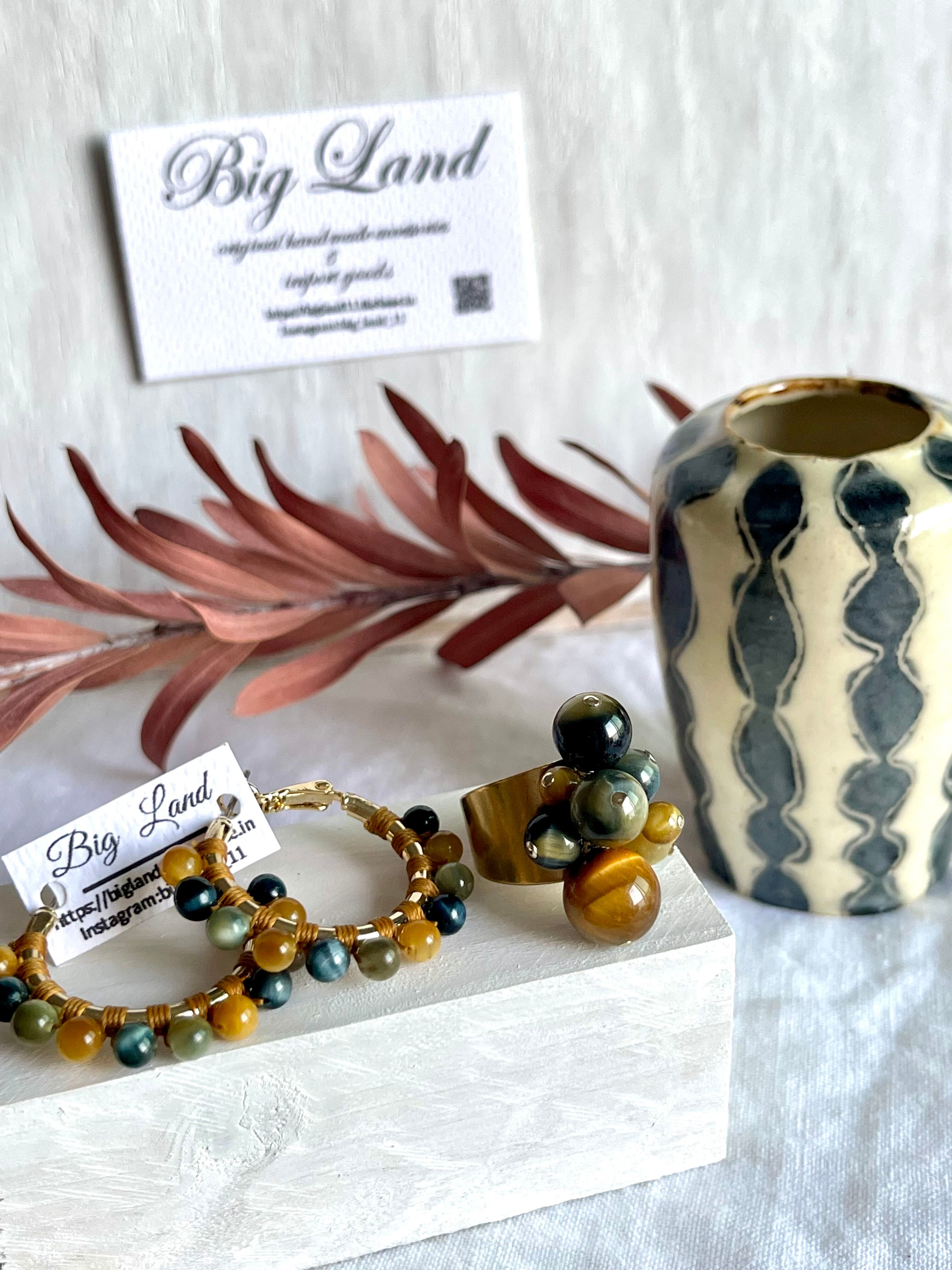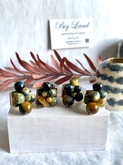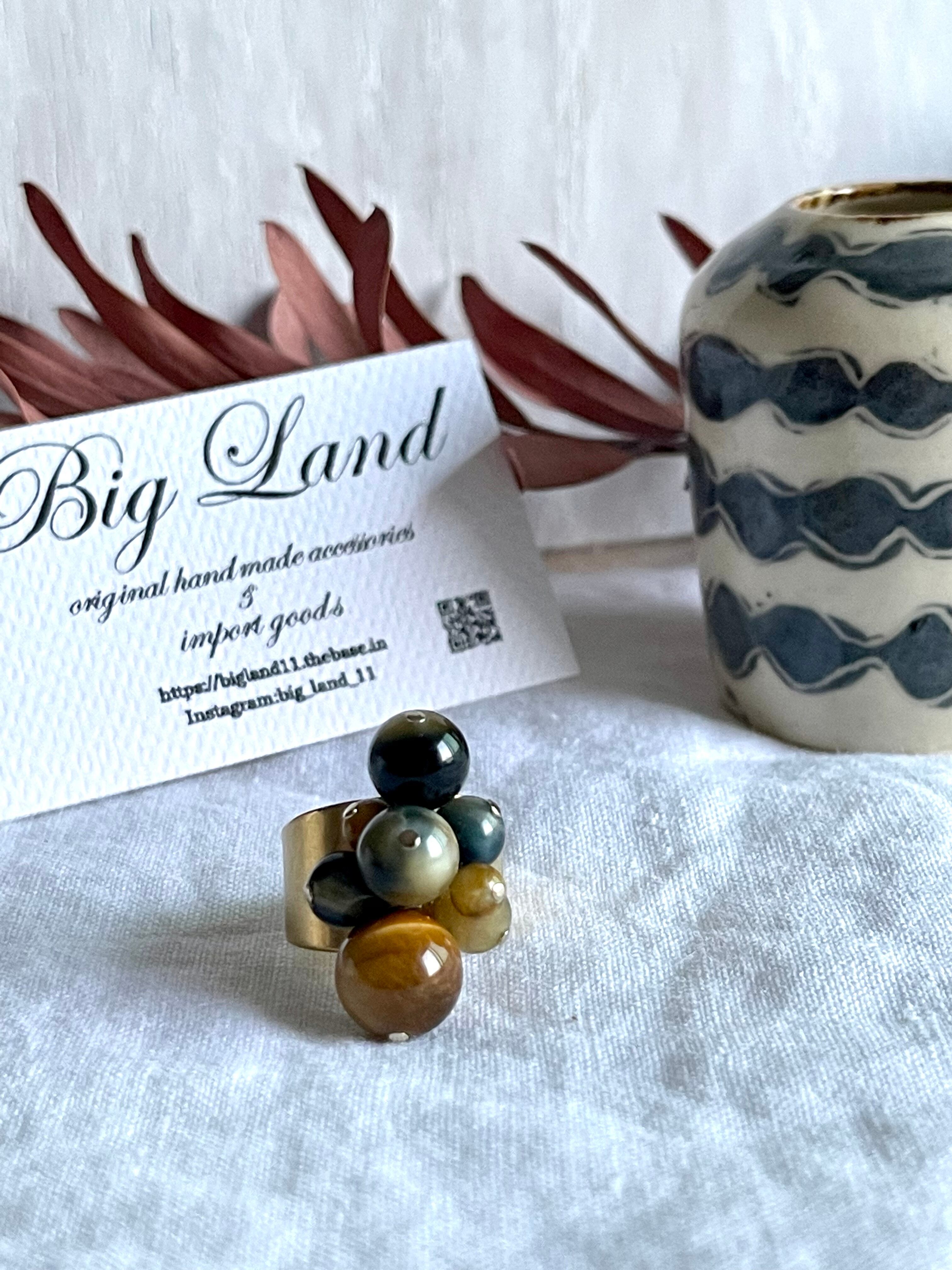 沢山の天然石がゴロゴロとデザイナーズの雰囲気で中指や人差し指に入れ、普段使いに主張し過ぎず肌馴染みも良いので出番が多くなりそう