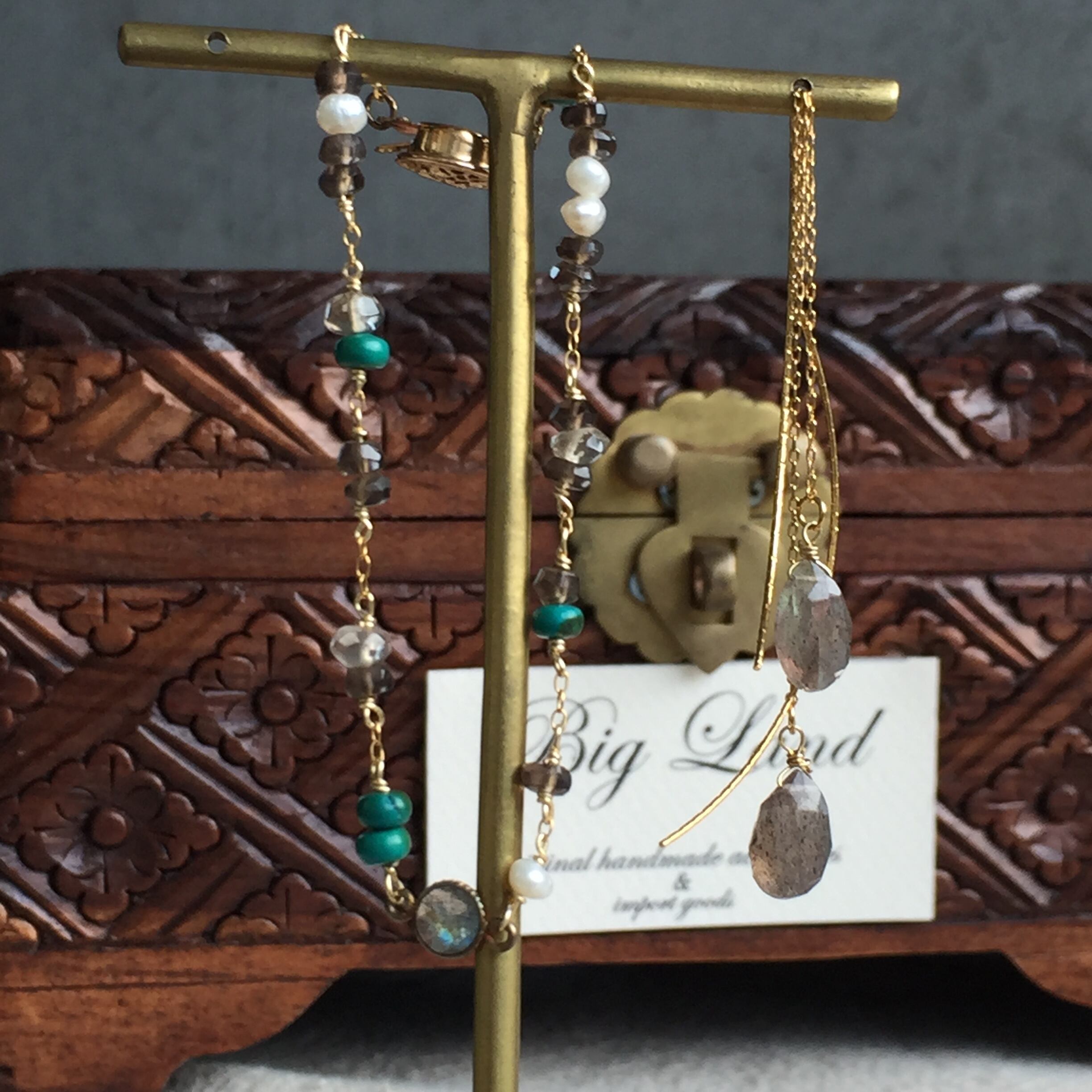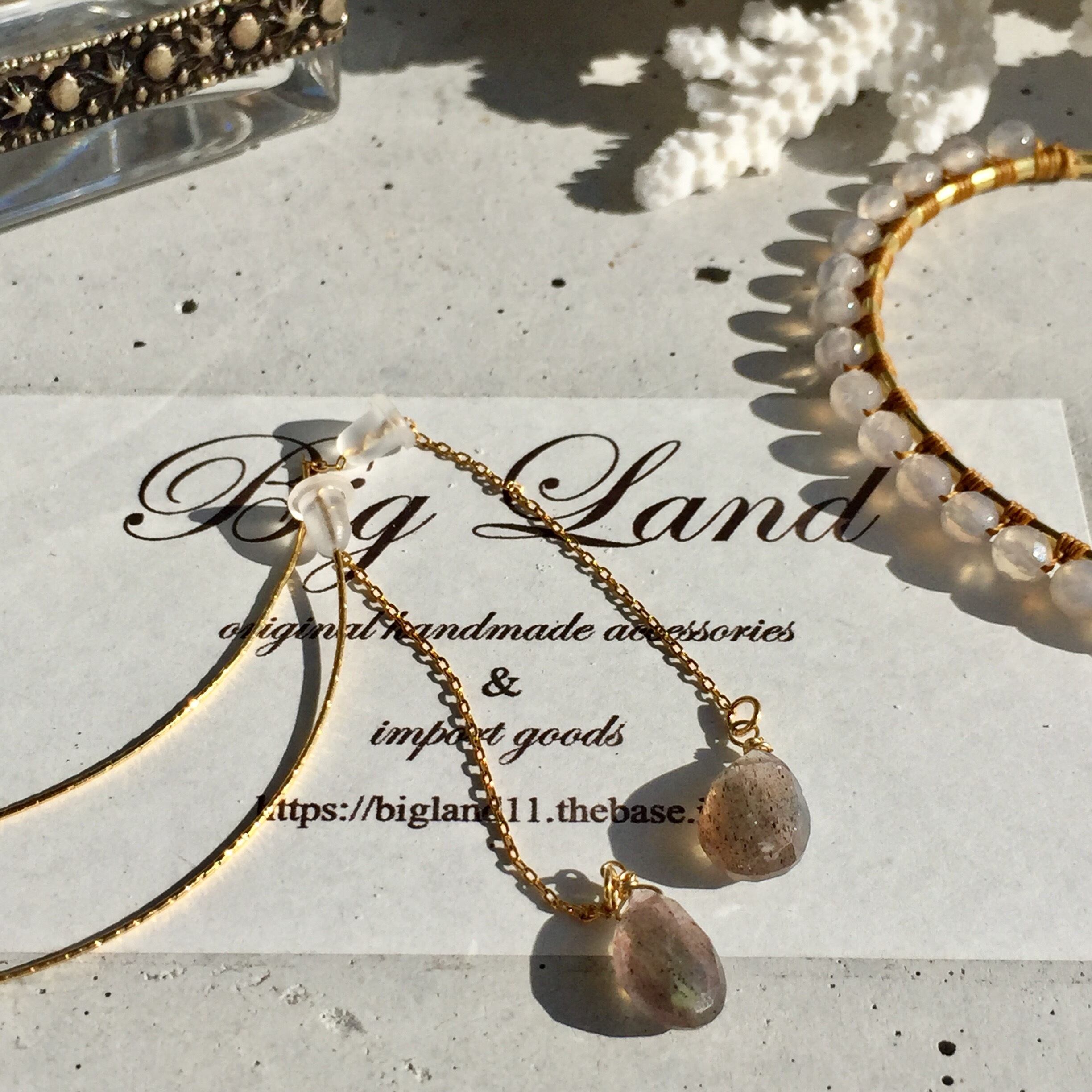 カッティング加工されたしずく型のラブラドライトがキラキラと美しさを放ち、ワンランク上の雰囲気を醸し出すピアスです✨