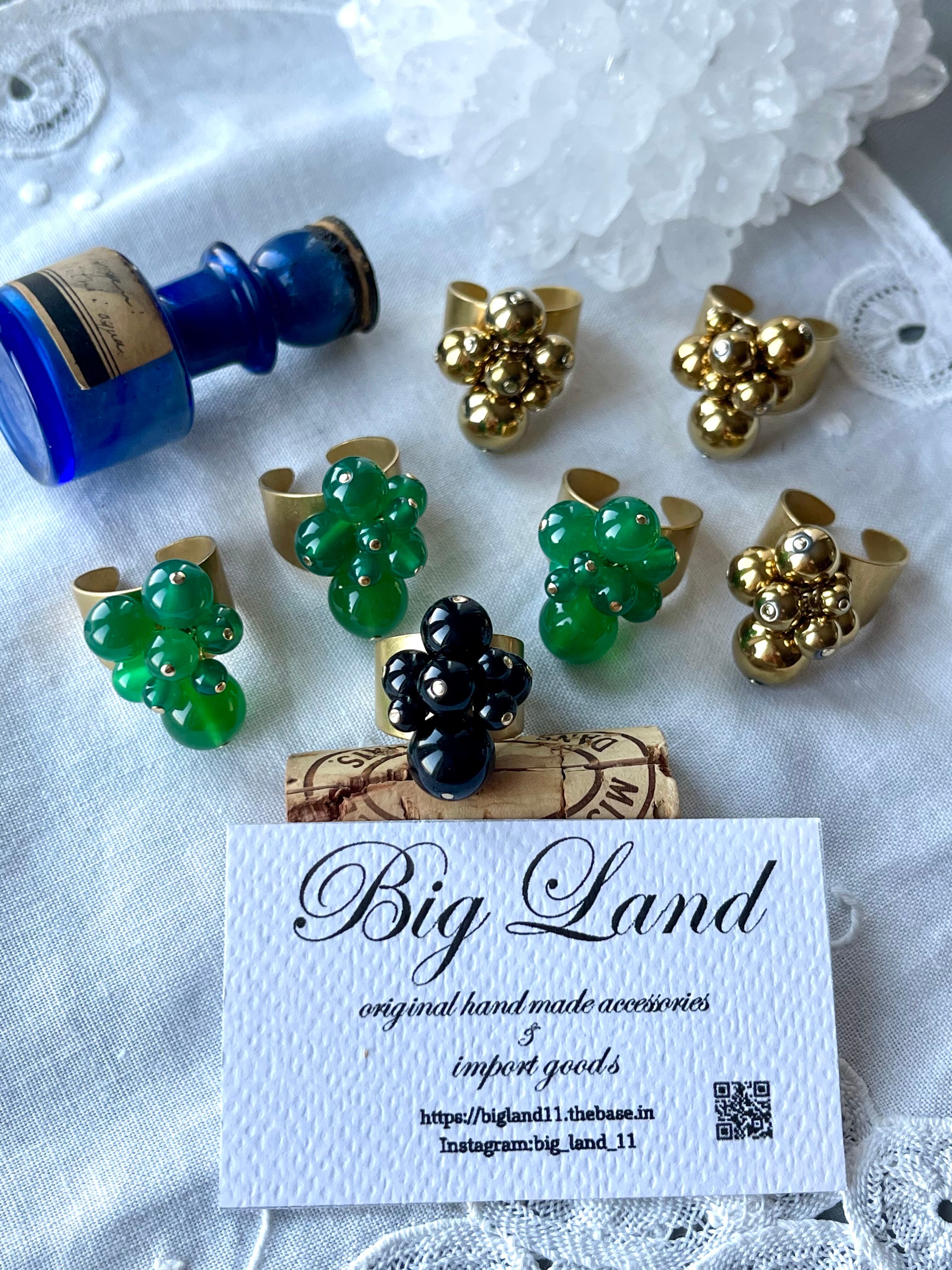 こちらは天然石にコーティングされており燻したような落ち着いたゴールドが真鍮と組み合わせ良く、パーティーシーンにもこのリング1つでキマリます‼︎