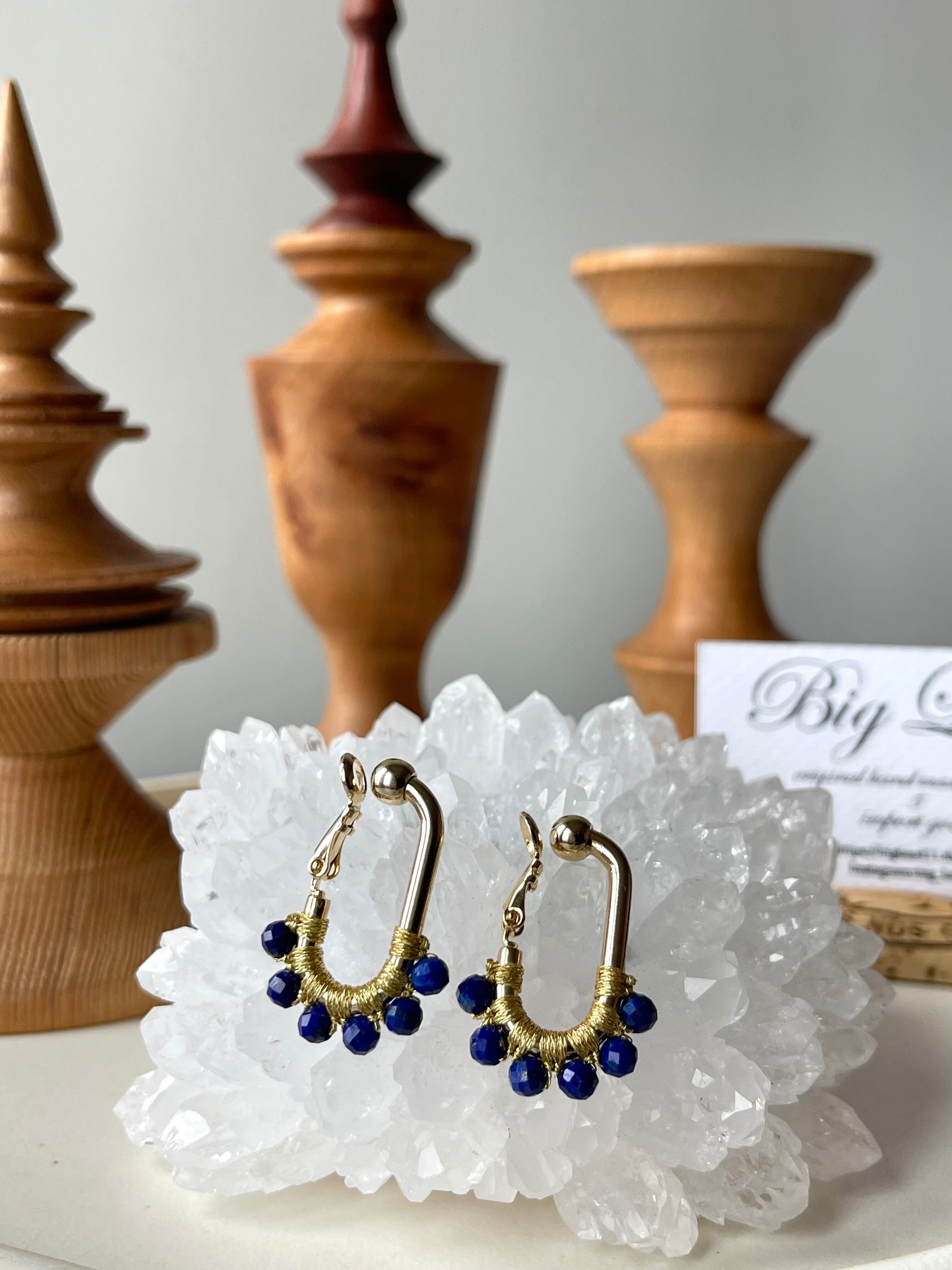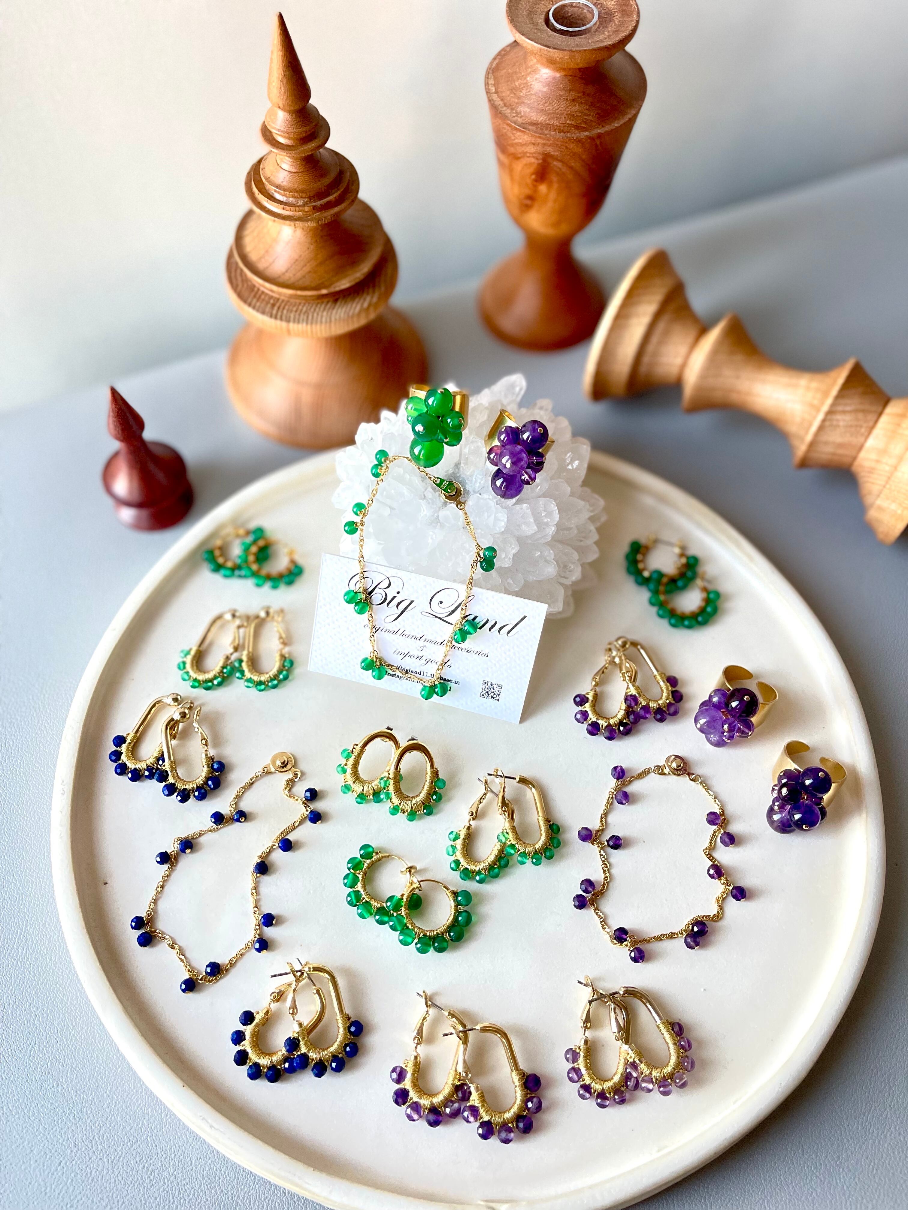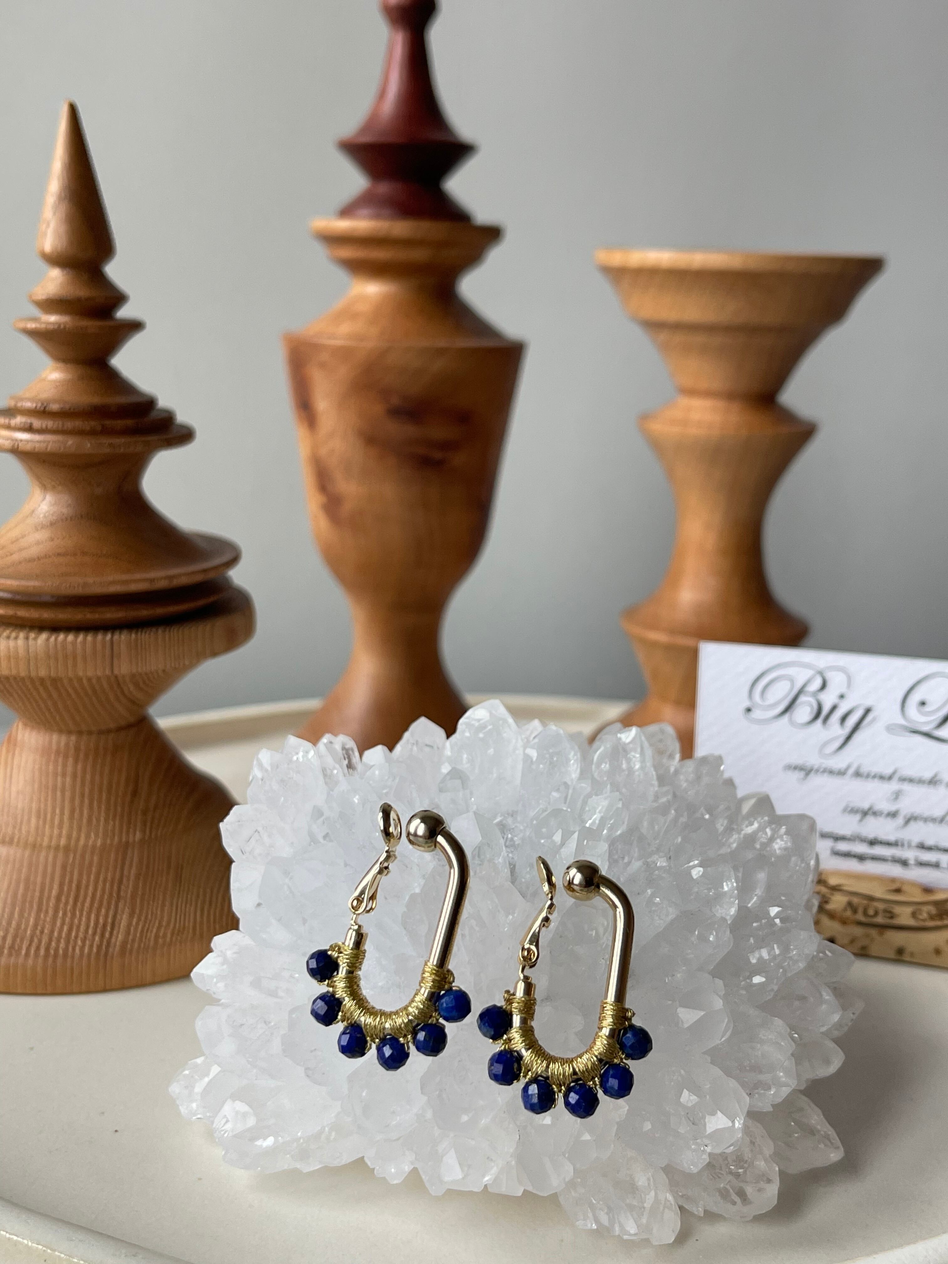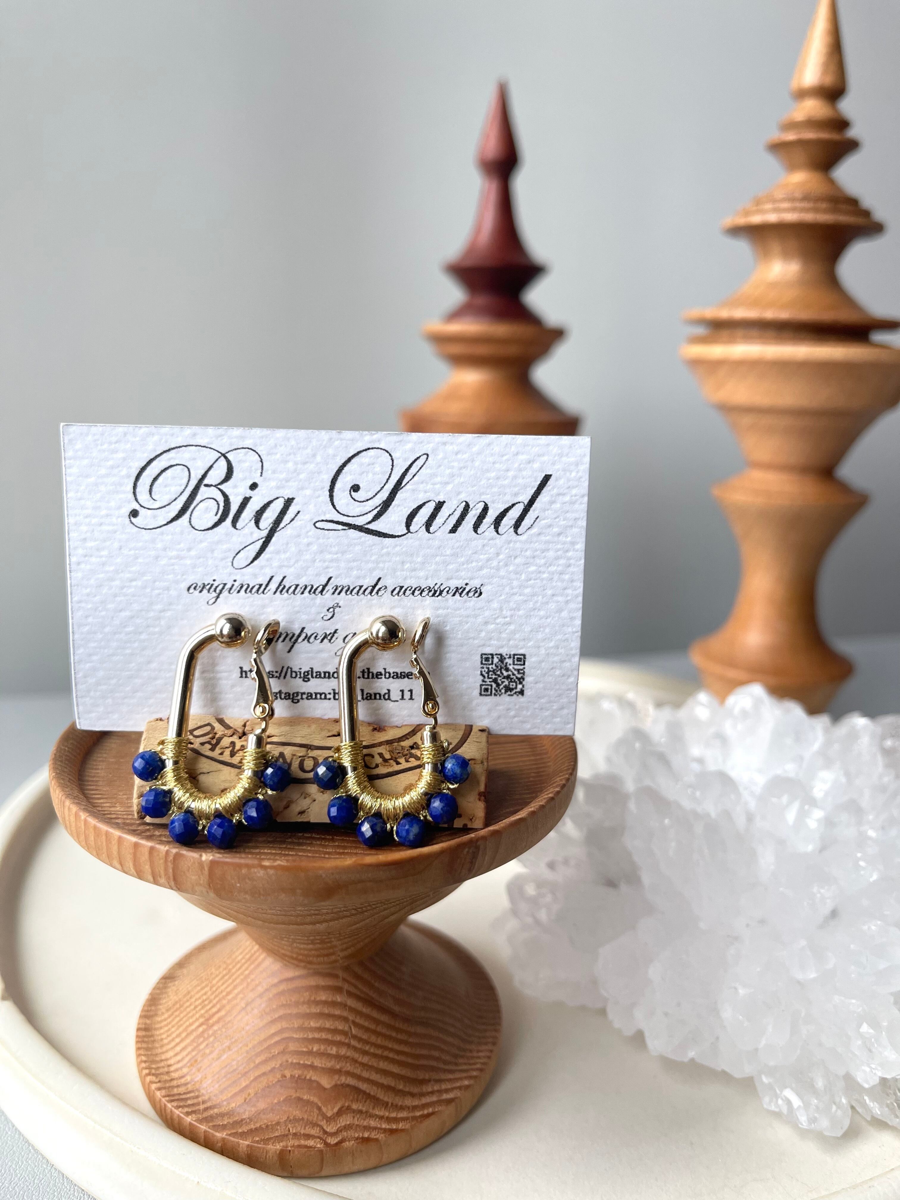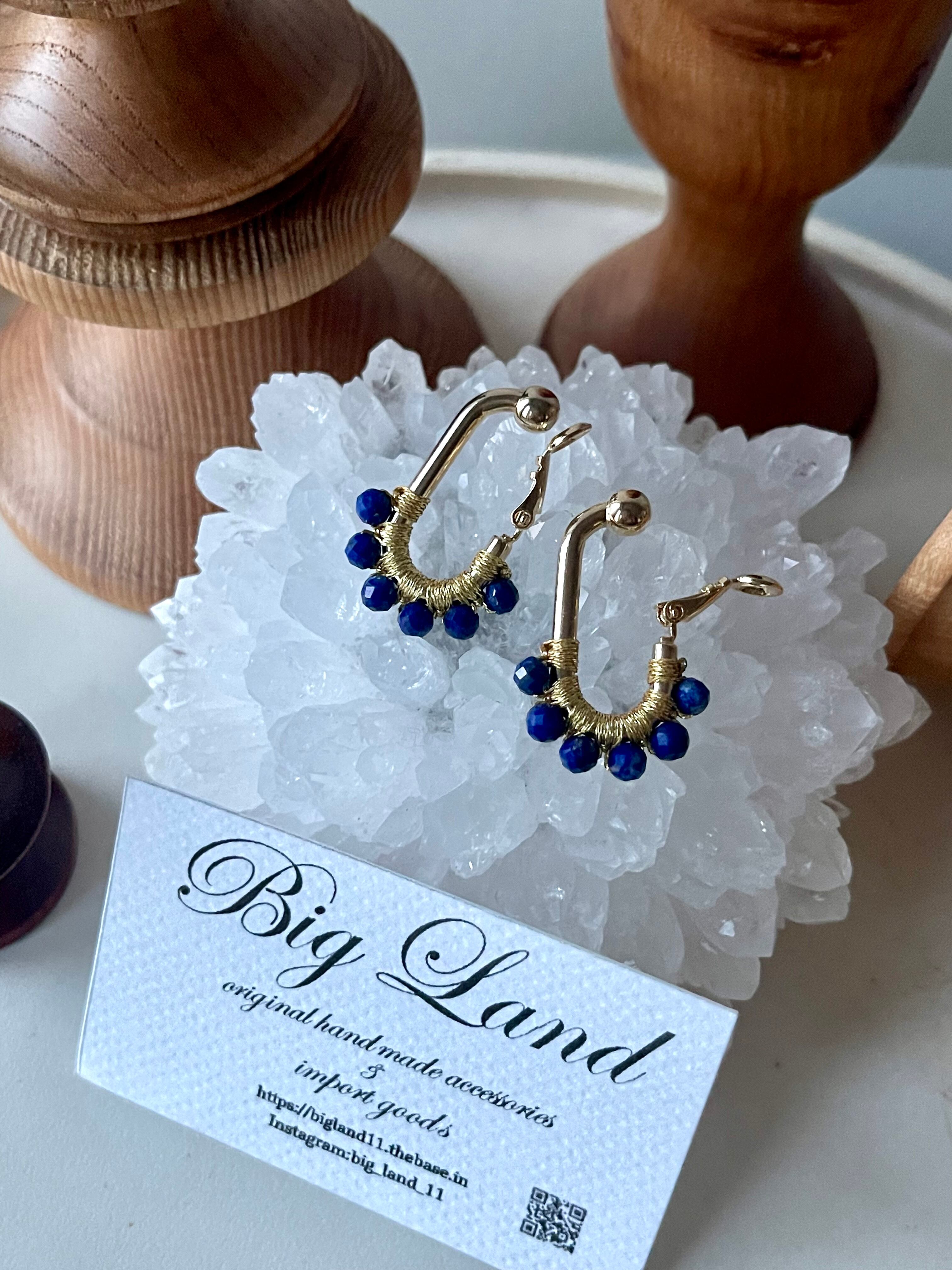 多面カット天然石ラピスラズリを一粒一粒糸で丁寧にしっかり編みあげ、高級感がありどんなお洋服にも合うと皆様色違いでご購入されてます