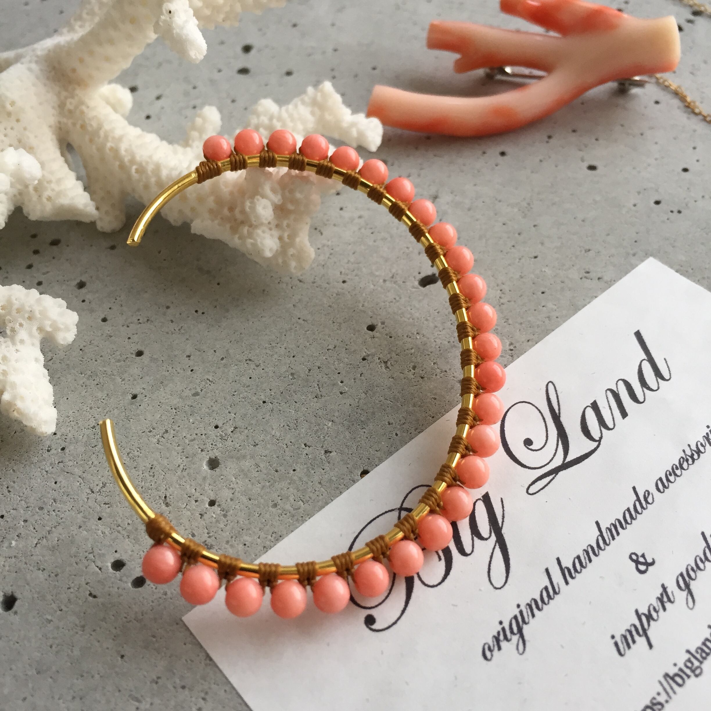 約4mmのサーモンピンクの珊瑚を紐でひと編みひと編みして仕上げました✨