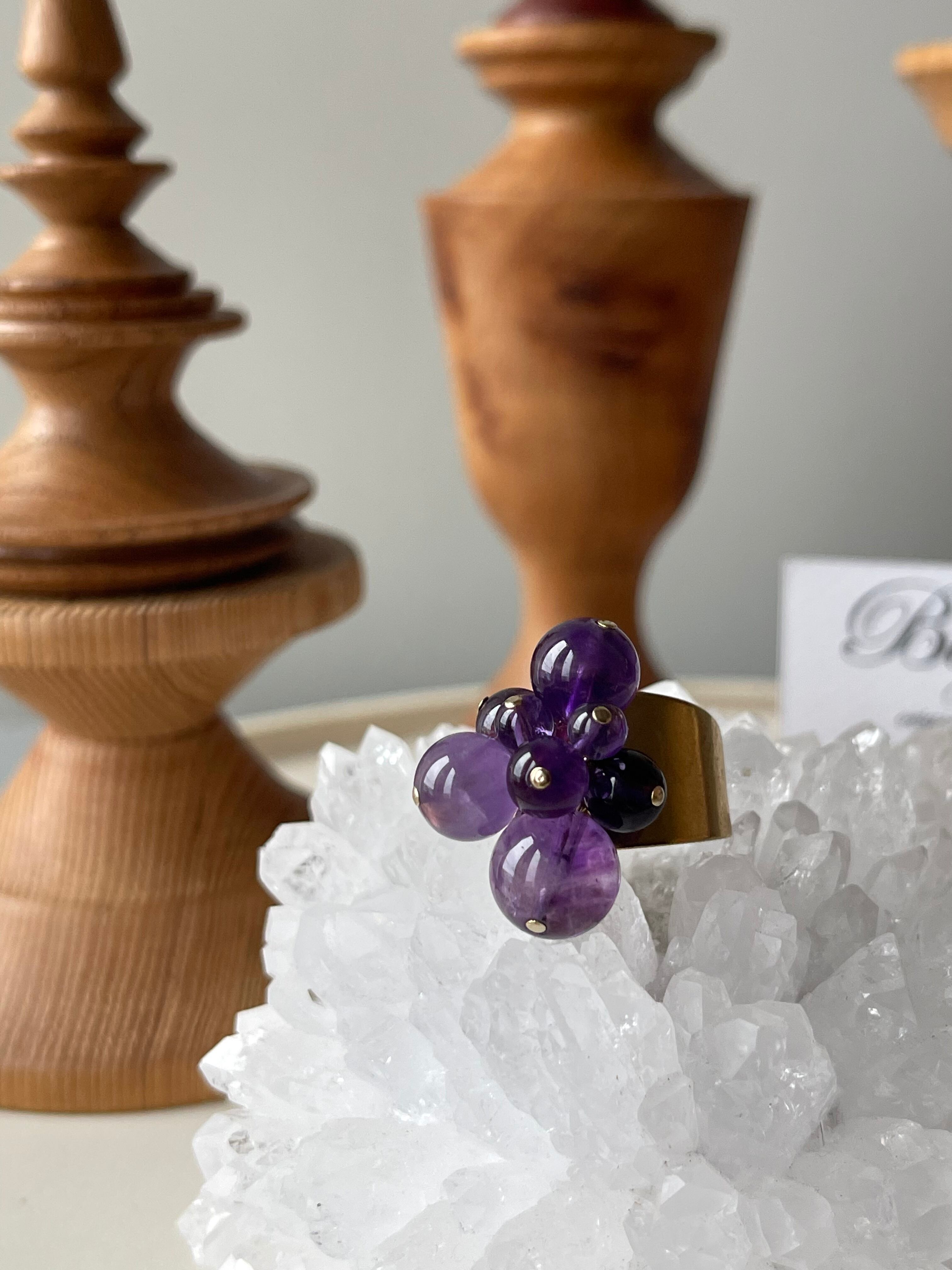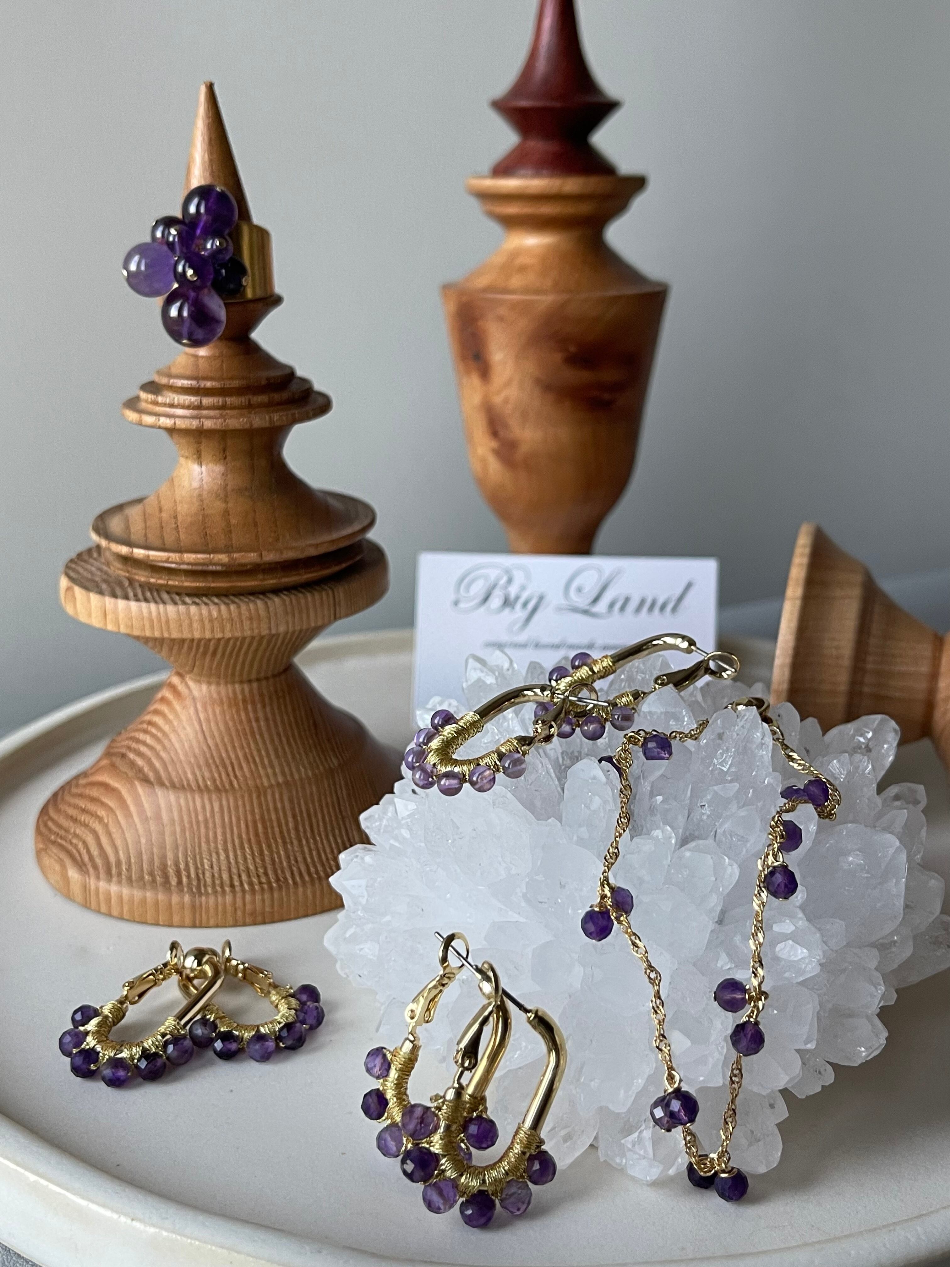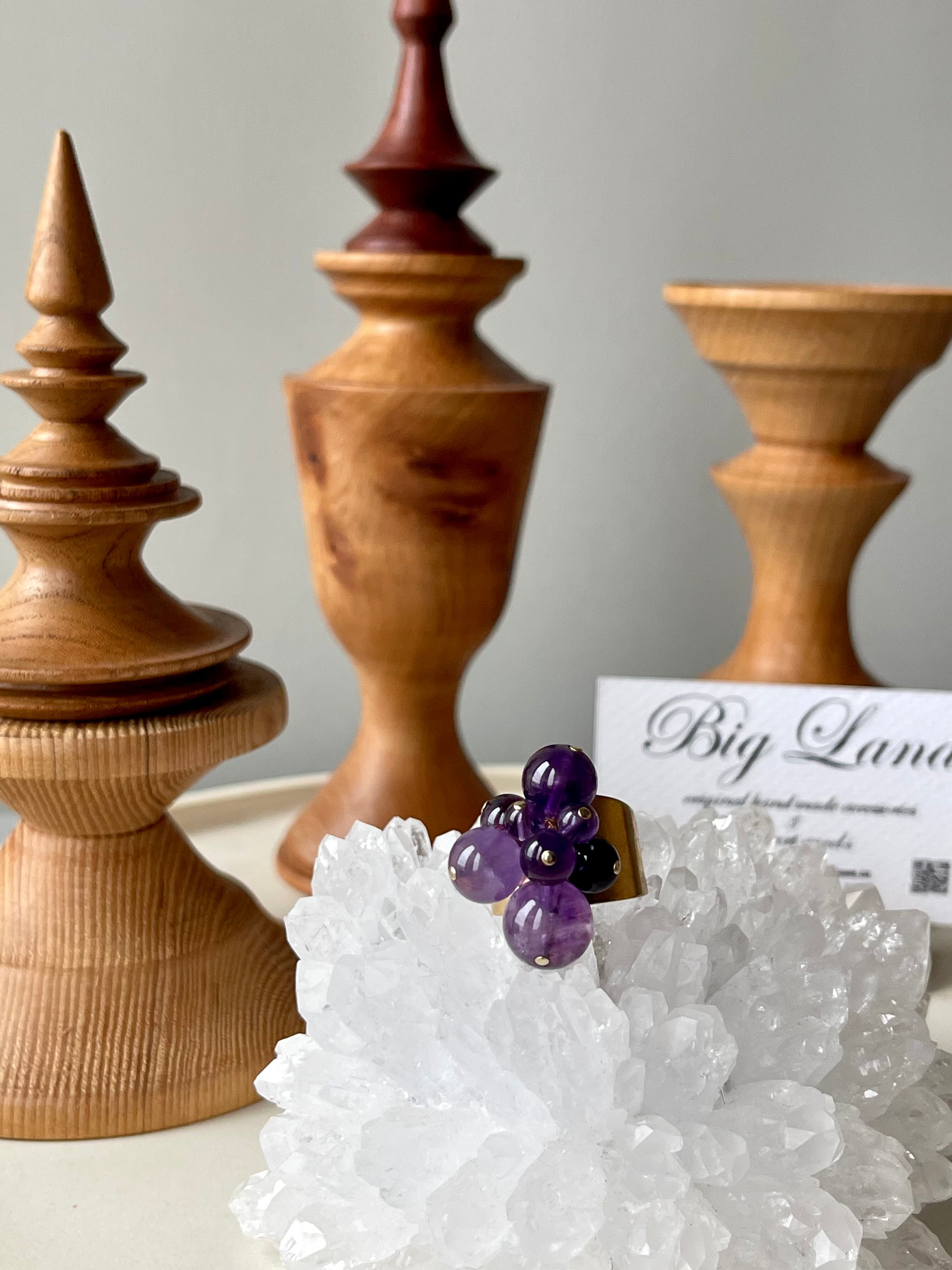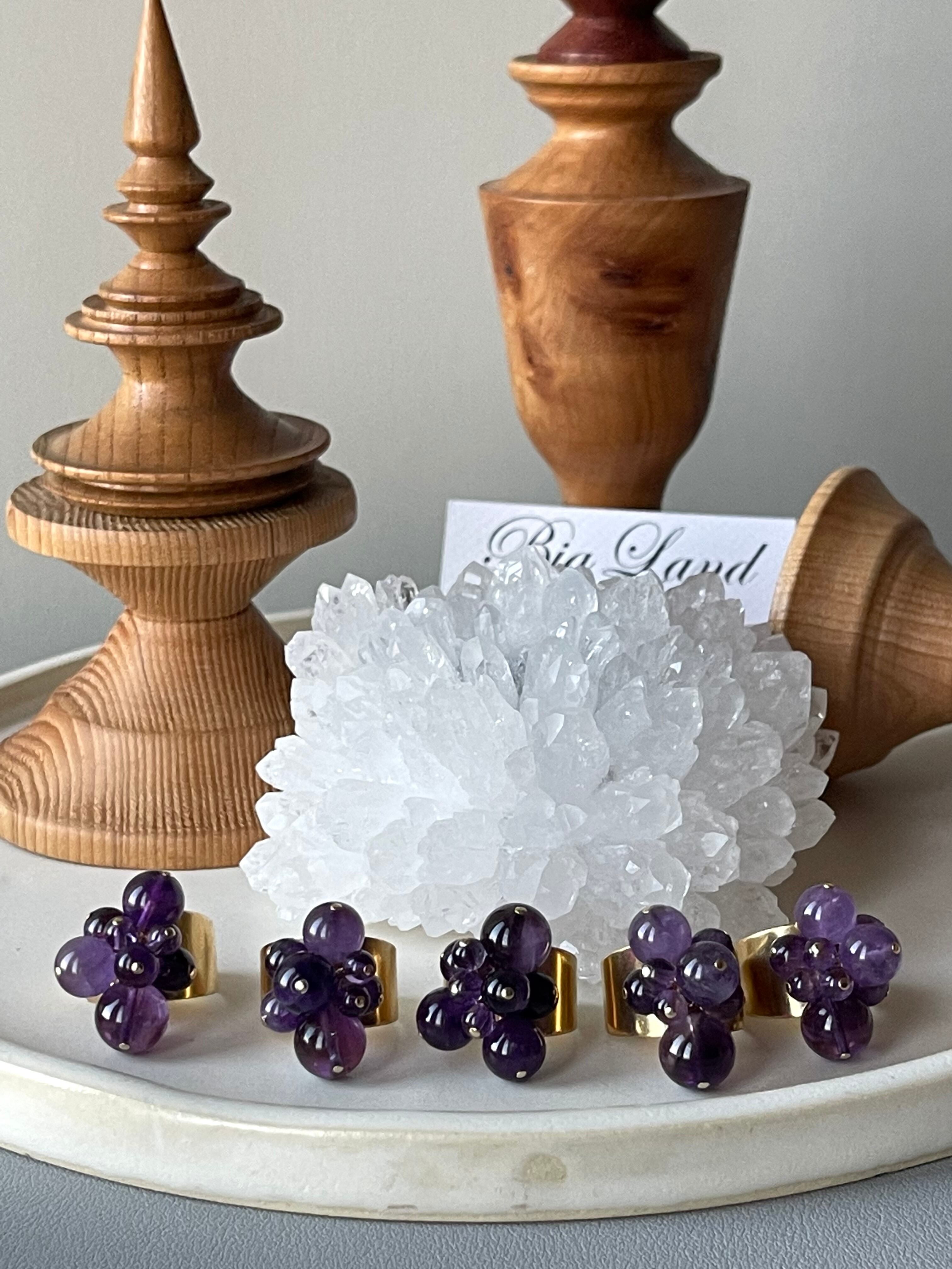 リングの製作には、アメジストを手作業で留め具にセットし、遊び心があるように大小の石をバランス良く組み合わせデザイナーズな雰囲気を醸し出し存在感は他のアクセサリーを引き立てるだけでなく、ファッションにもアクセントを与え….特別な日のドレスアップや普段使いにもぴったり!!