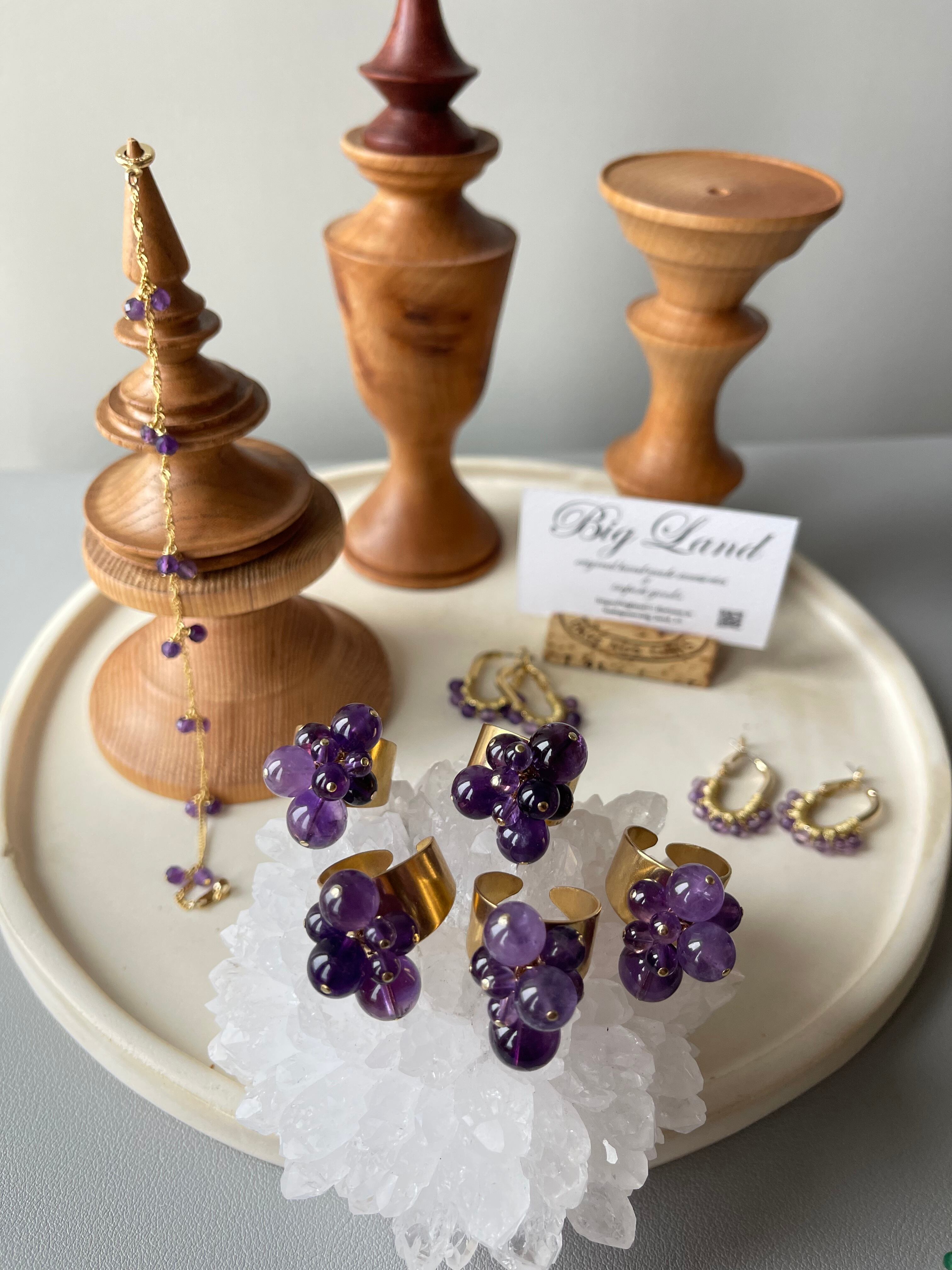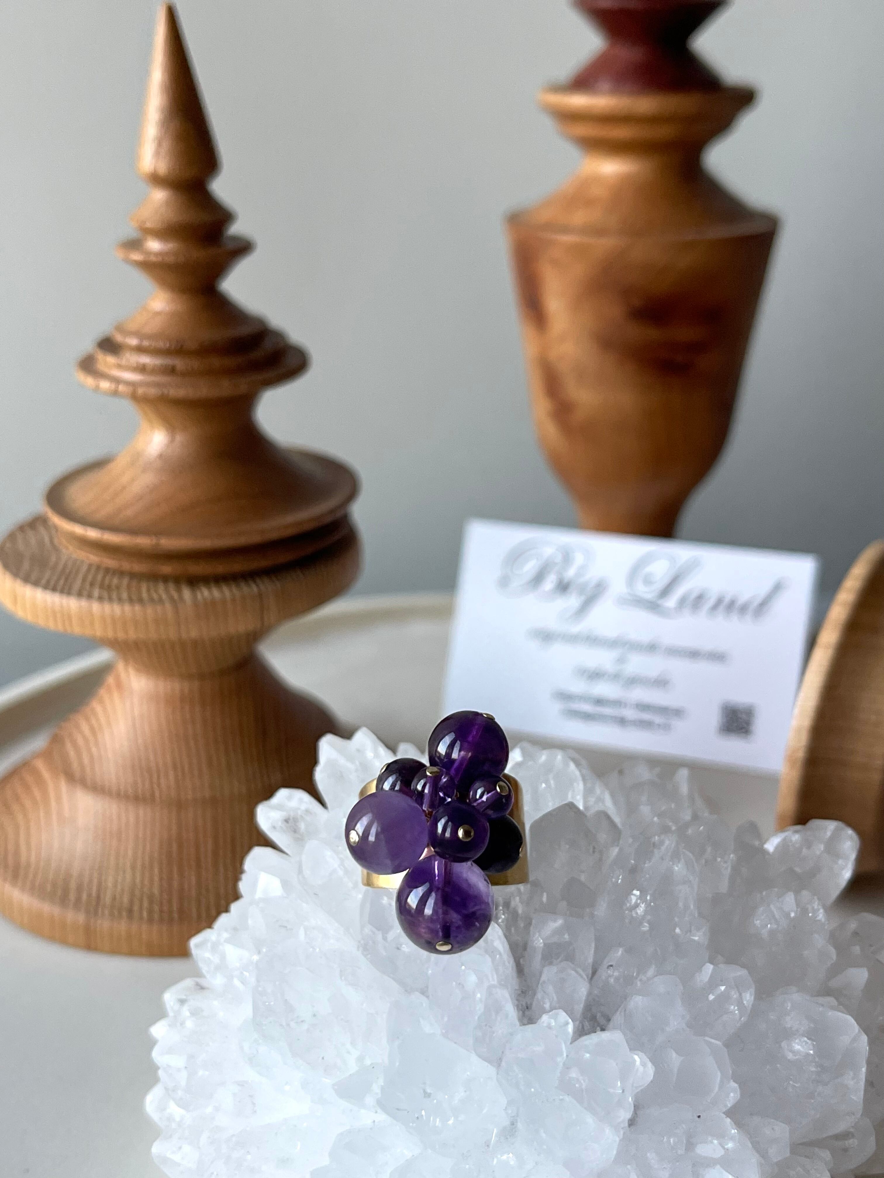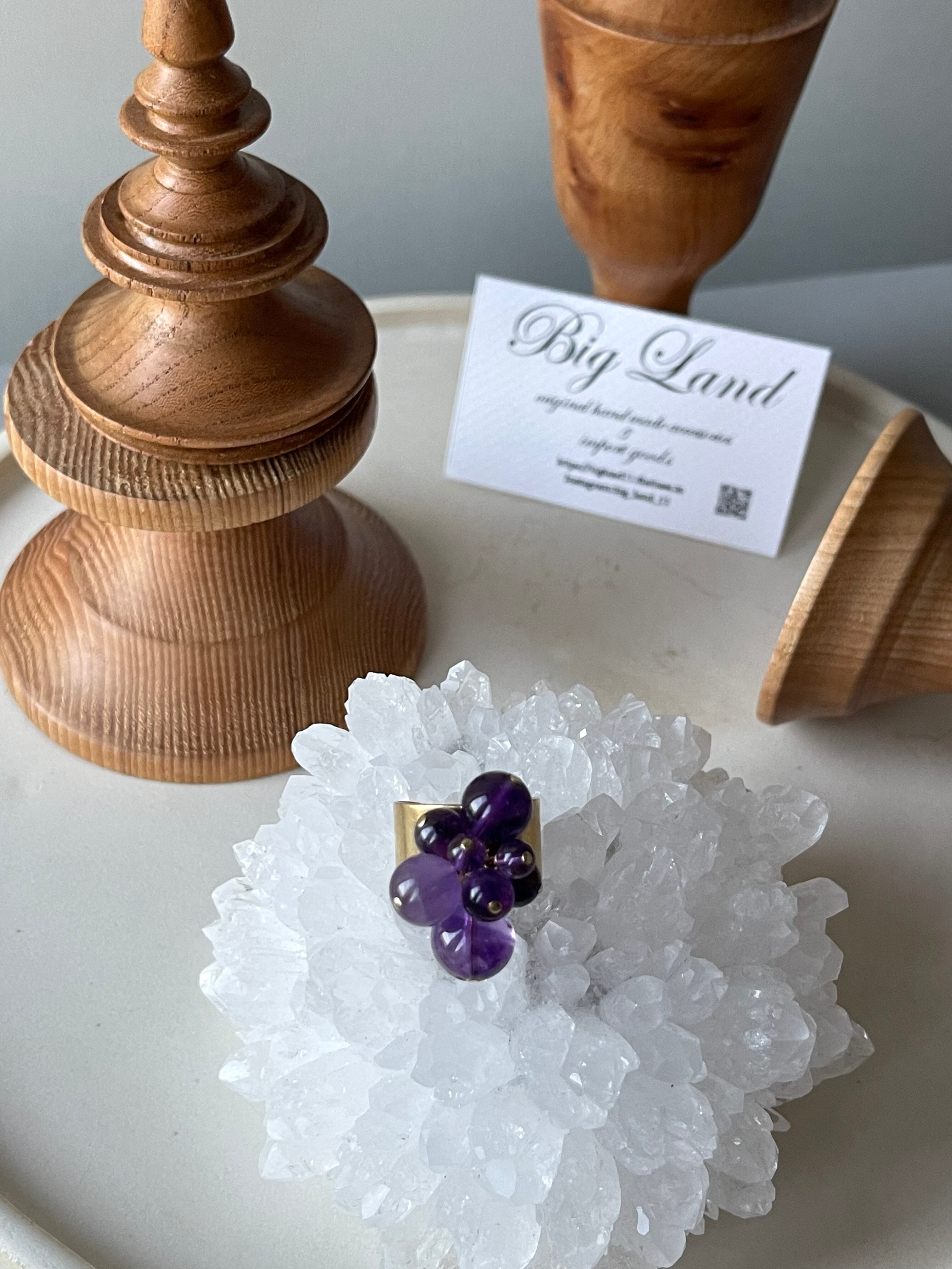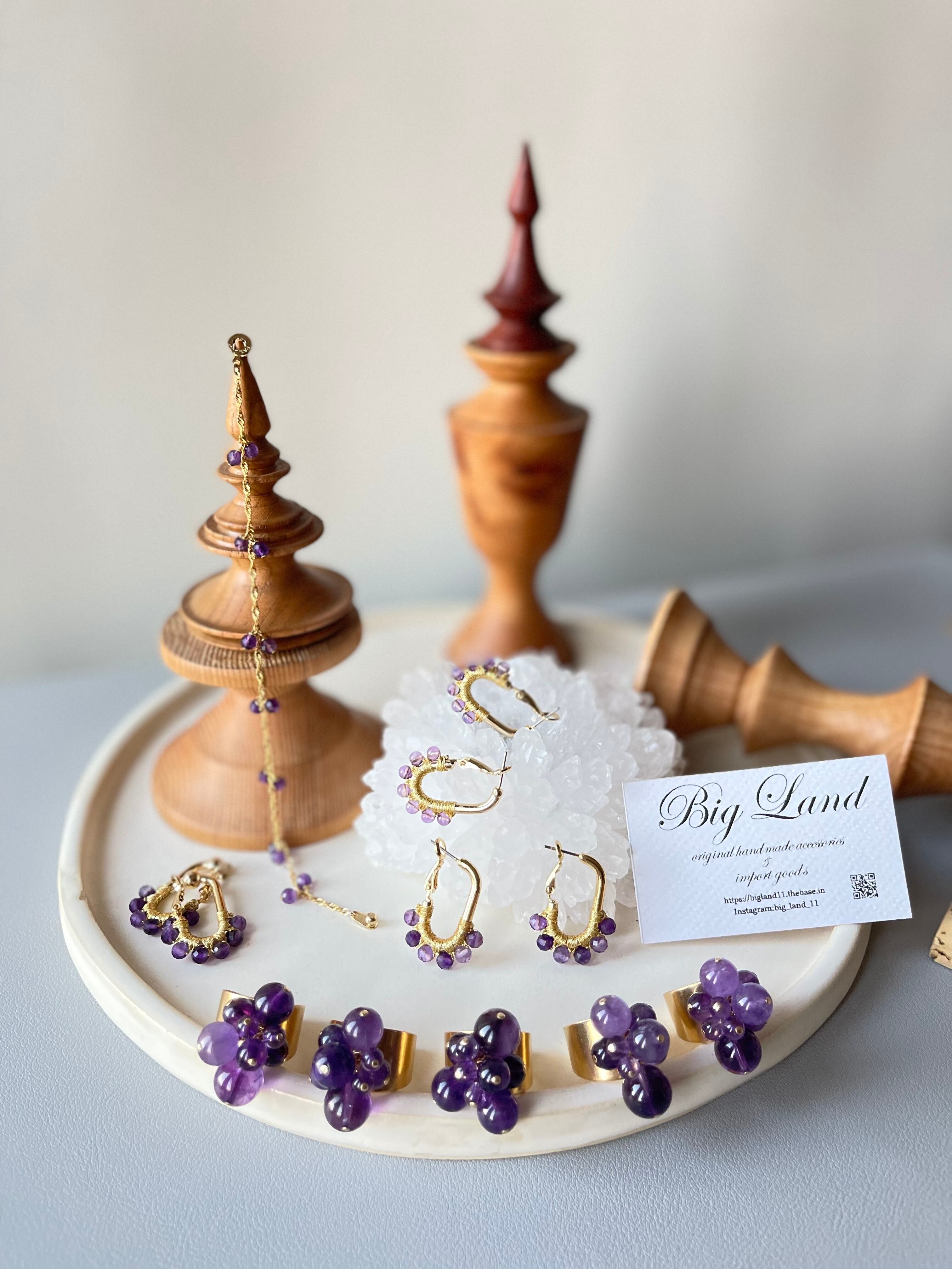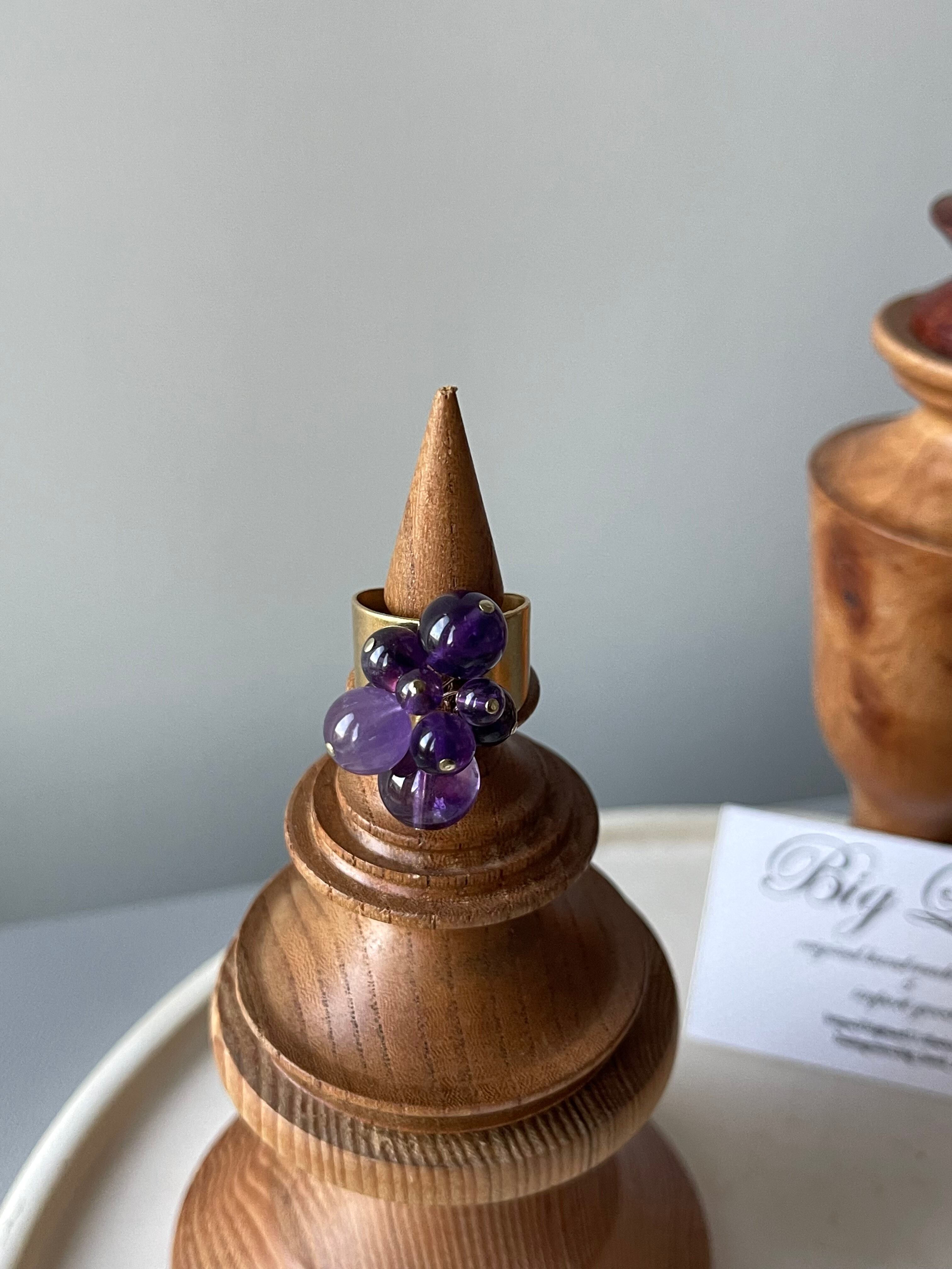 リングの製作には、アメジストを手作業で留め具にセットし、遊び心があるように大小の石をバランス良く組み合わせデザイナーズな雰囲気を醸し出し存在感は他のアクセサリーを引き立てるだけでなく、ファッションにもアクセントを与え….特別な日のドレスアップや普段使いにもぴったり!!