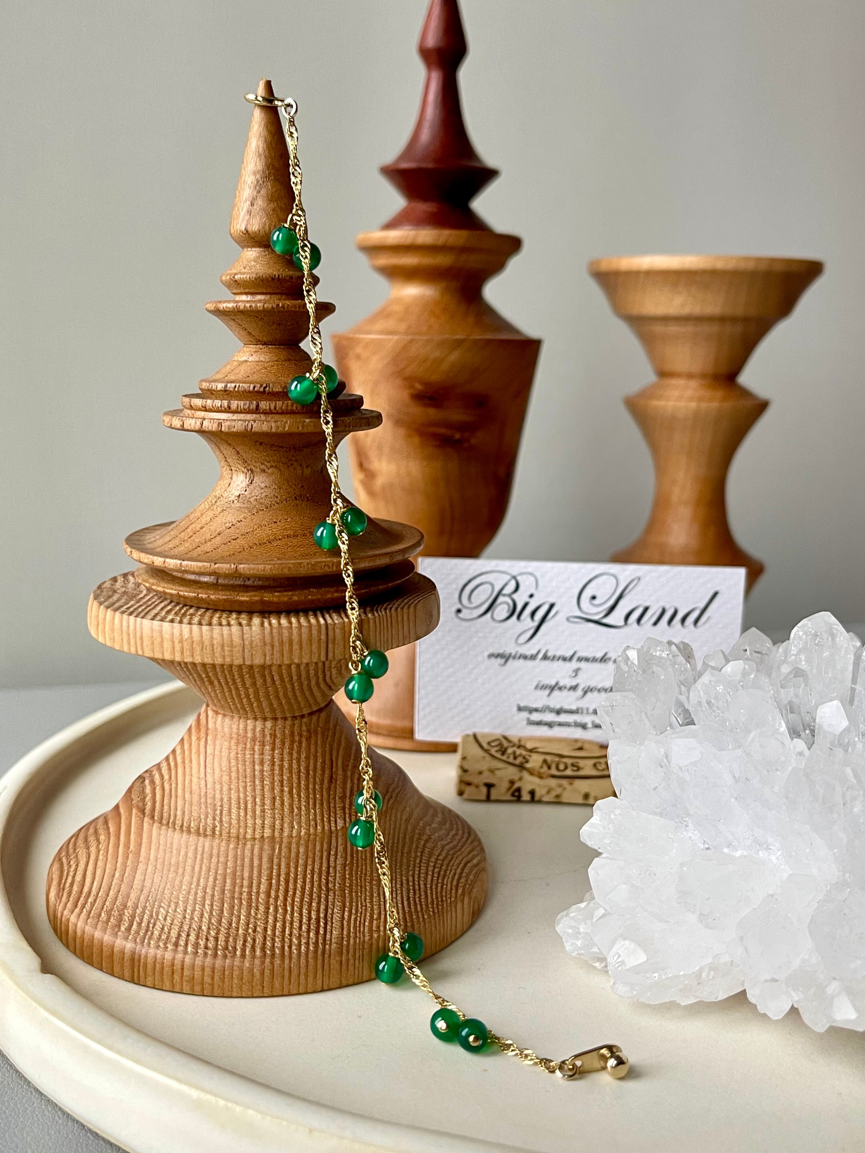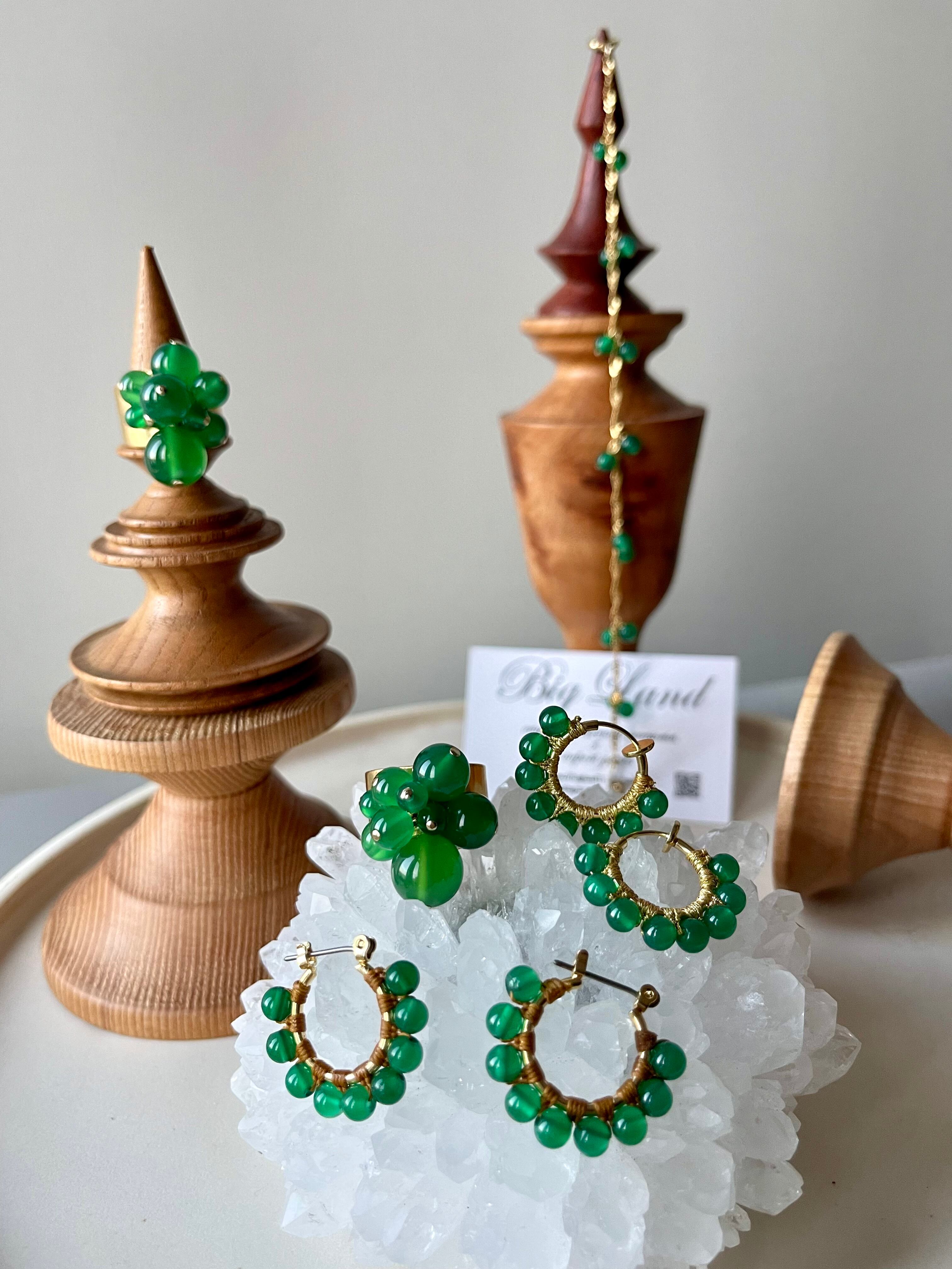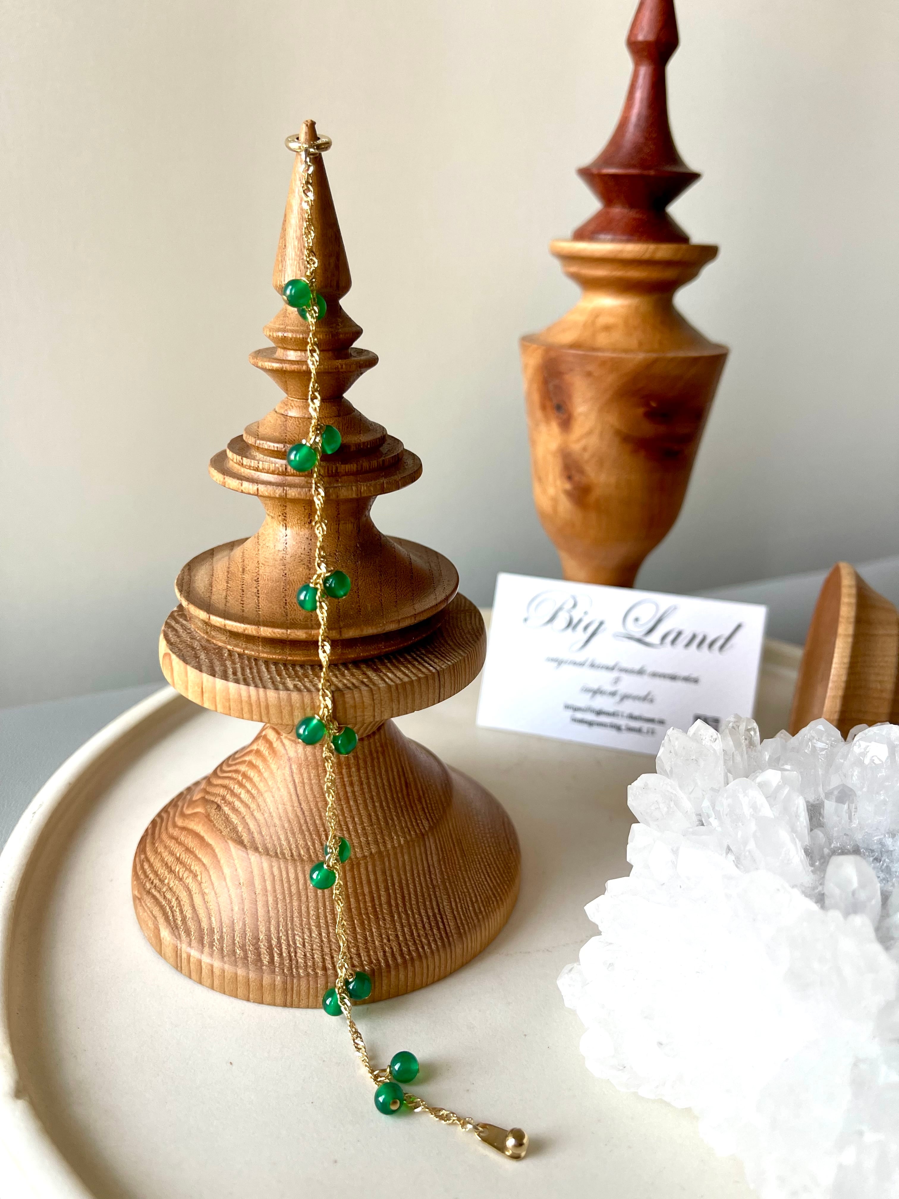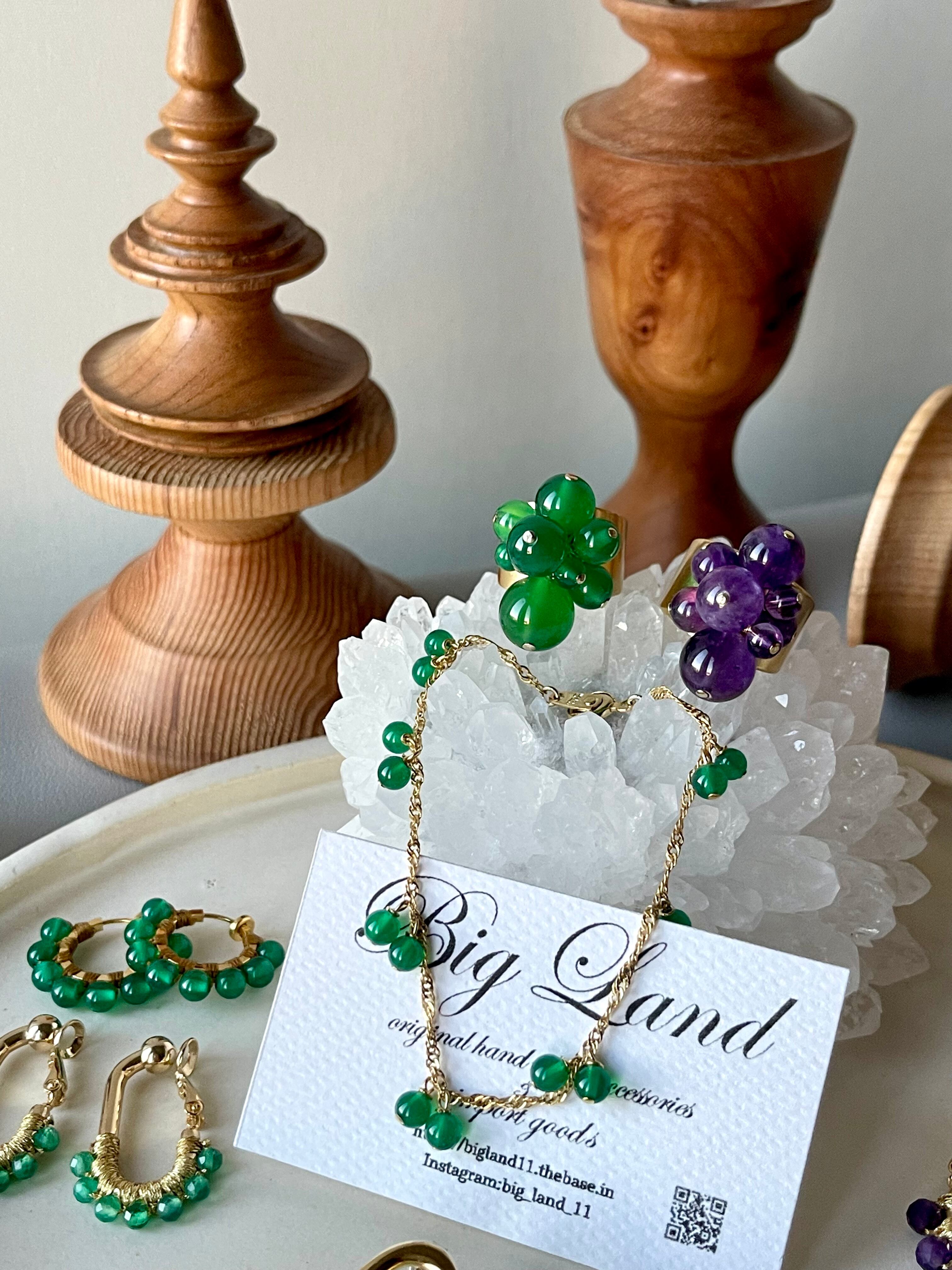 艶めくグリーンオニキスとヒラヒラしたチェーンとの組み合わせや色味がどこかインドジュエリーっぽく…何処か旅をしているかの様な気持ちになり、個人的に大好き‼︎