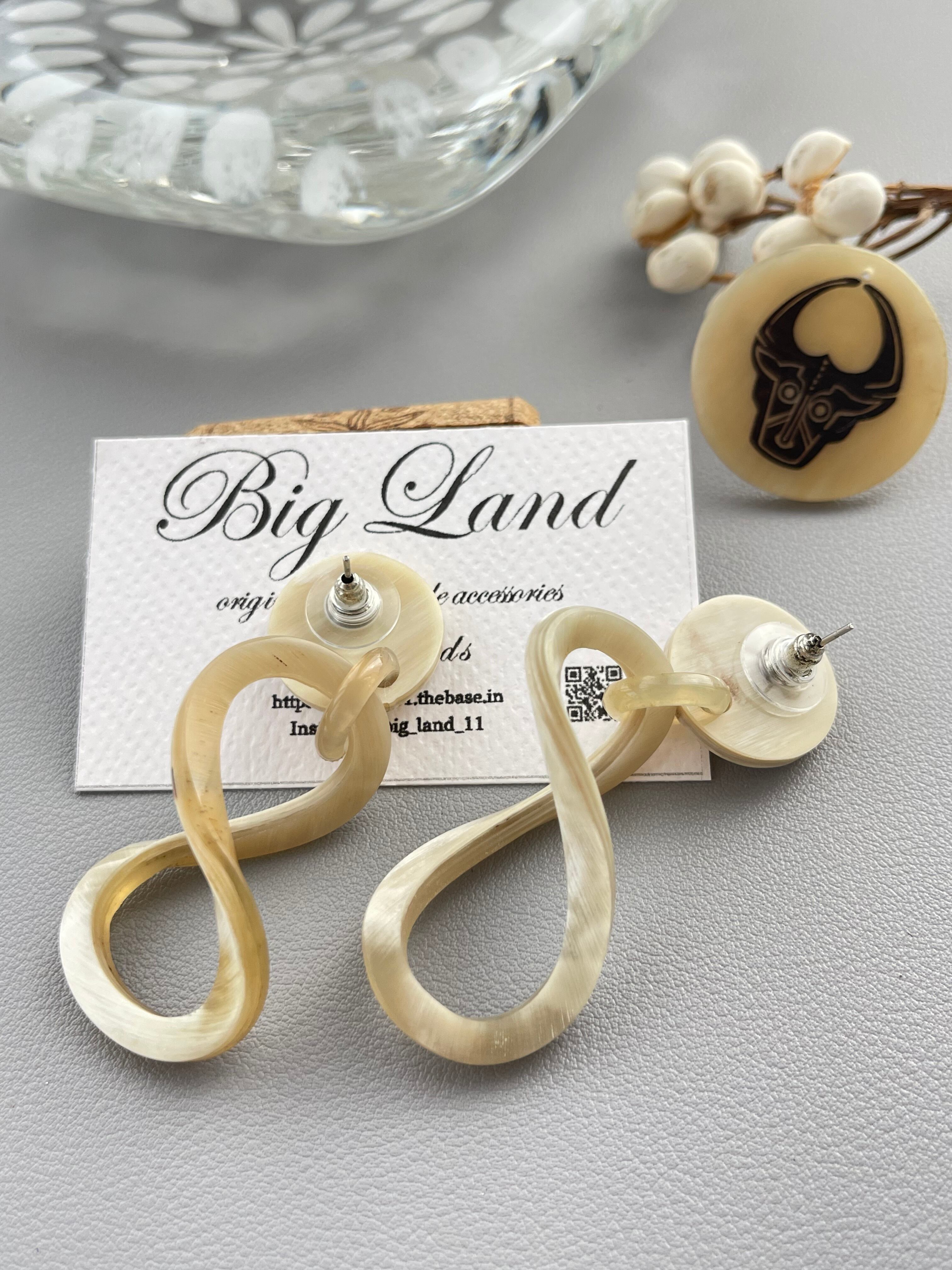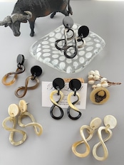 上品な色合いと無限を彷彿するようなモチーフがなんとも言えないデザインで、大ぶりなのに大変軽いのが水牛アクセサリーの特徴で小顔効果抜群ですよー✨