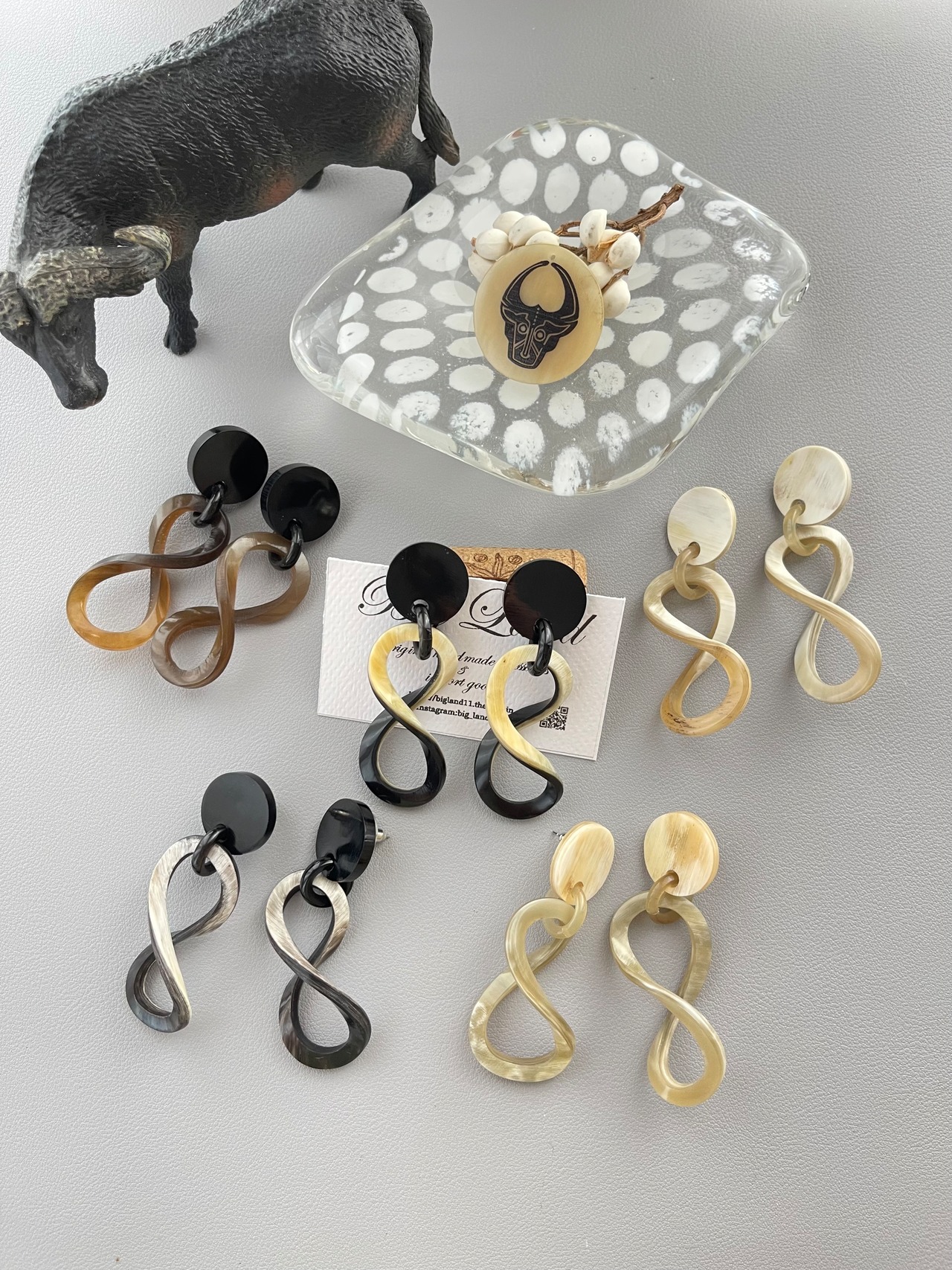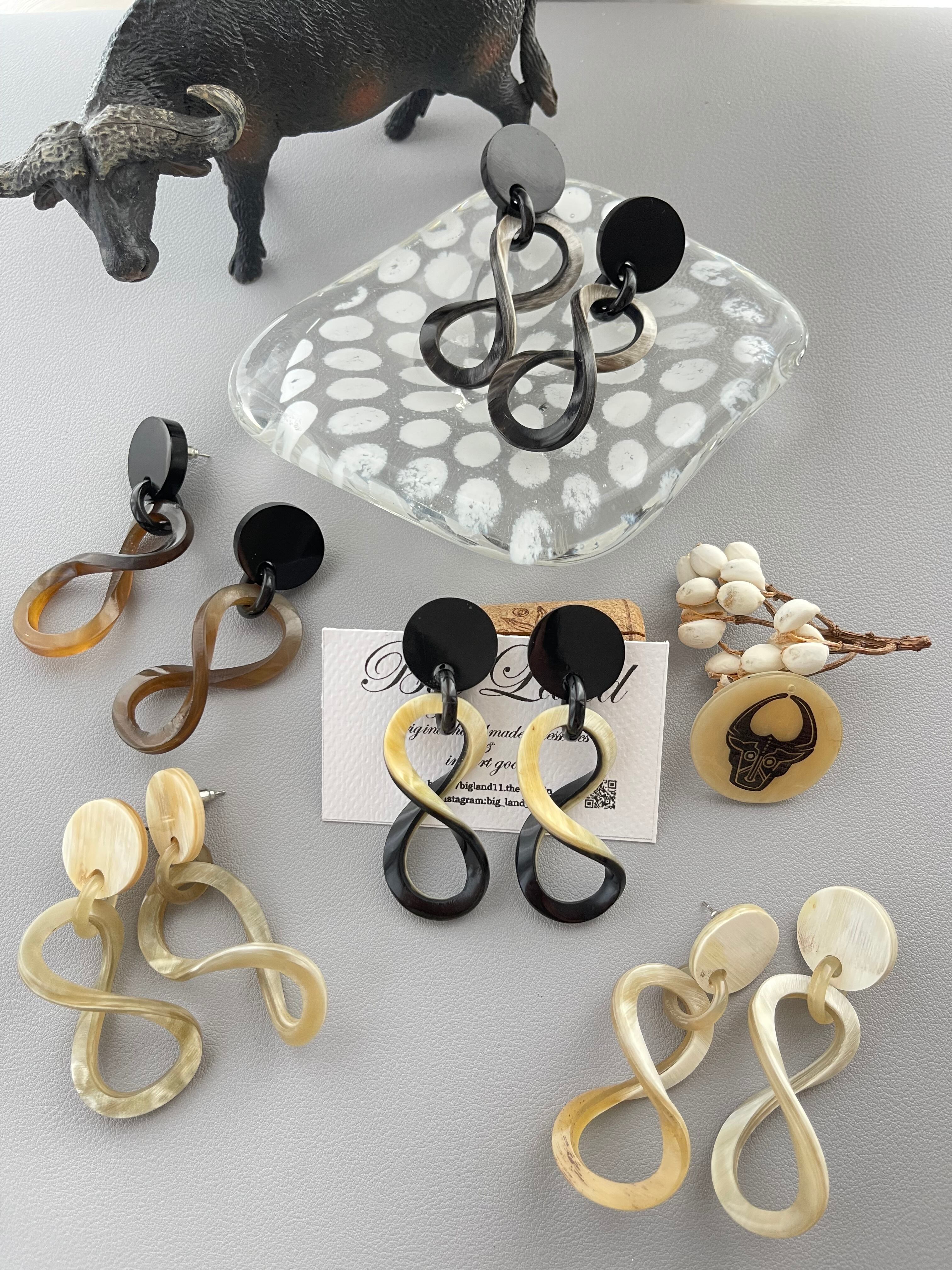 上品な色合いと無限を彷彿するようなモチーフがなんとも言えないデザインで、大ぶりなのに大変軽いのが水牛アクセサリーの特徴で小顔効果抜群ですよー✨