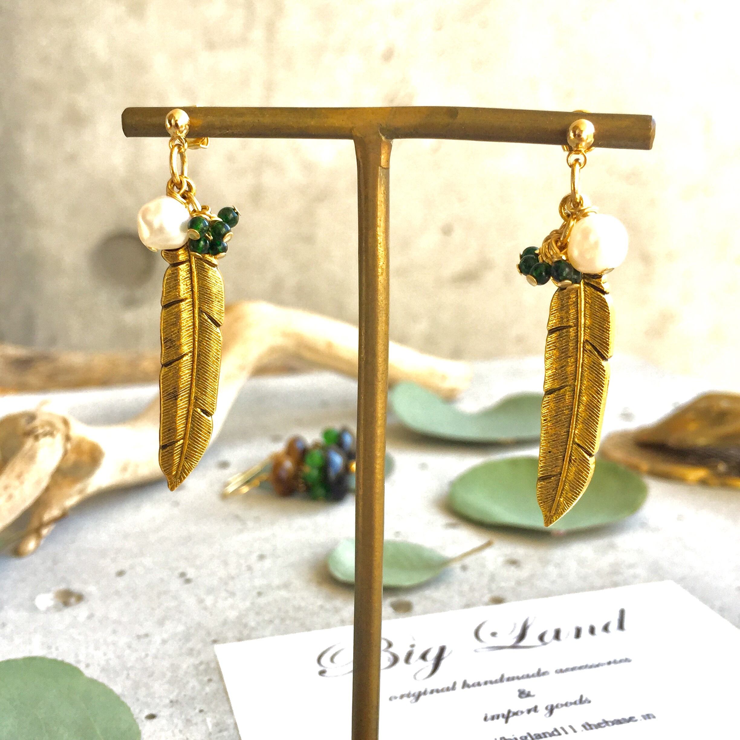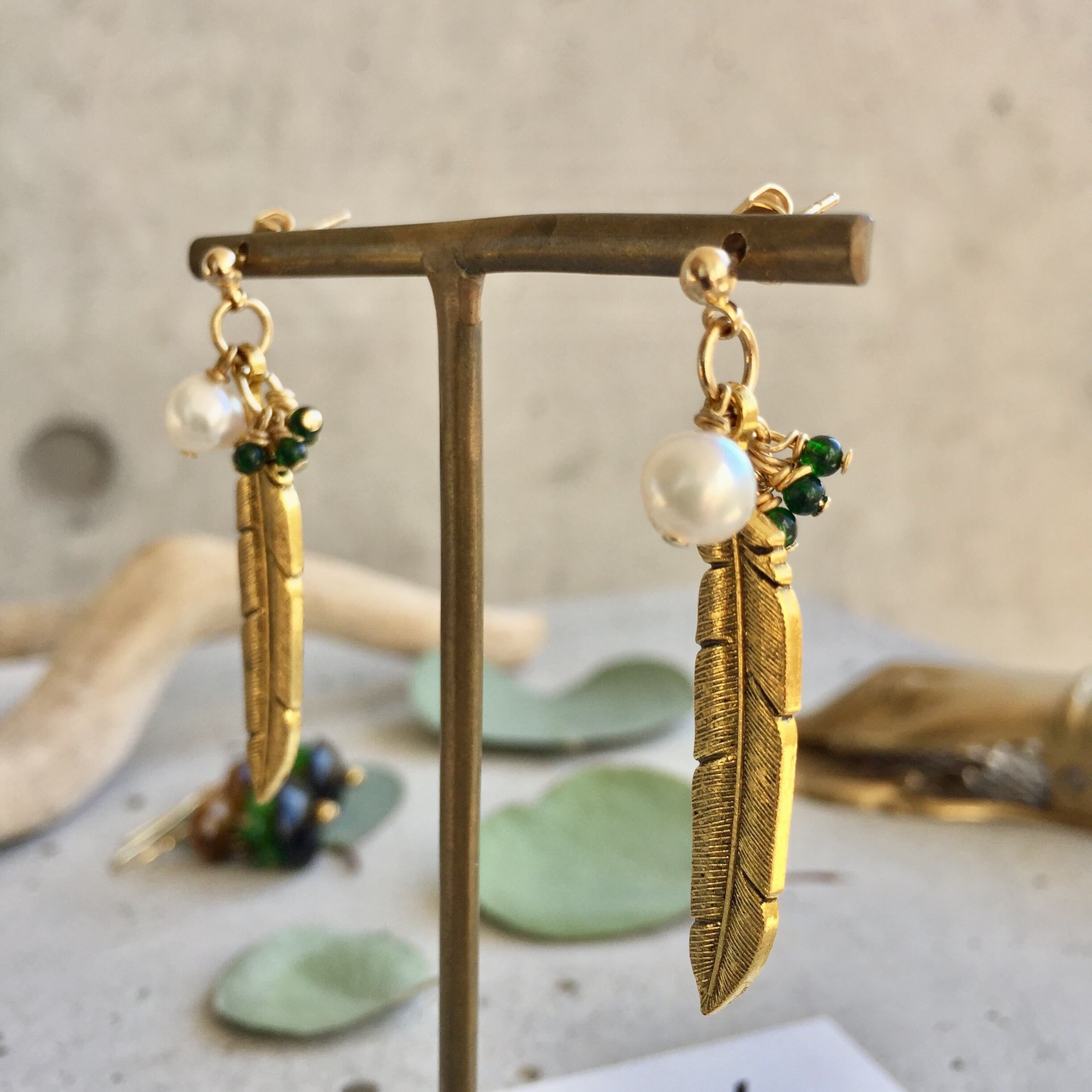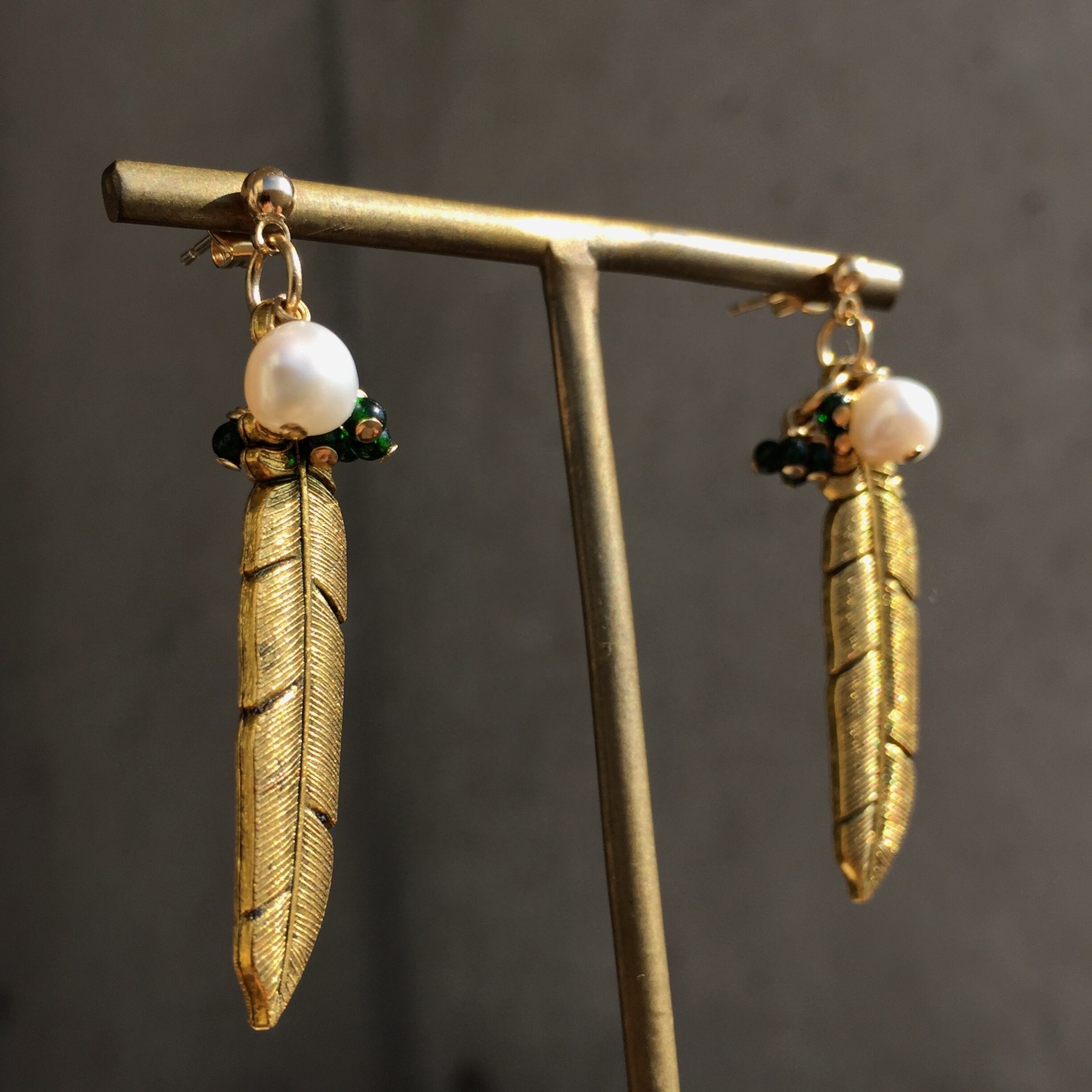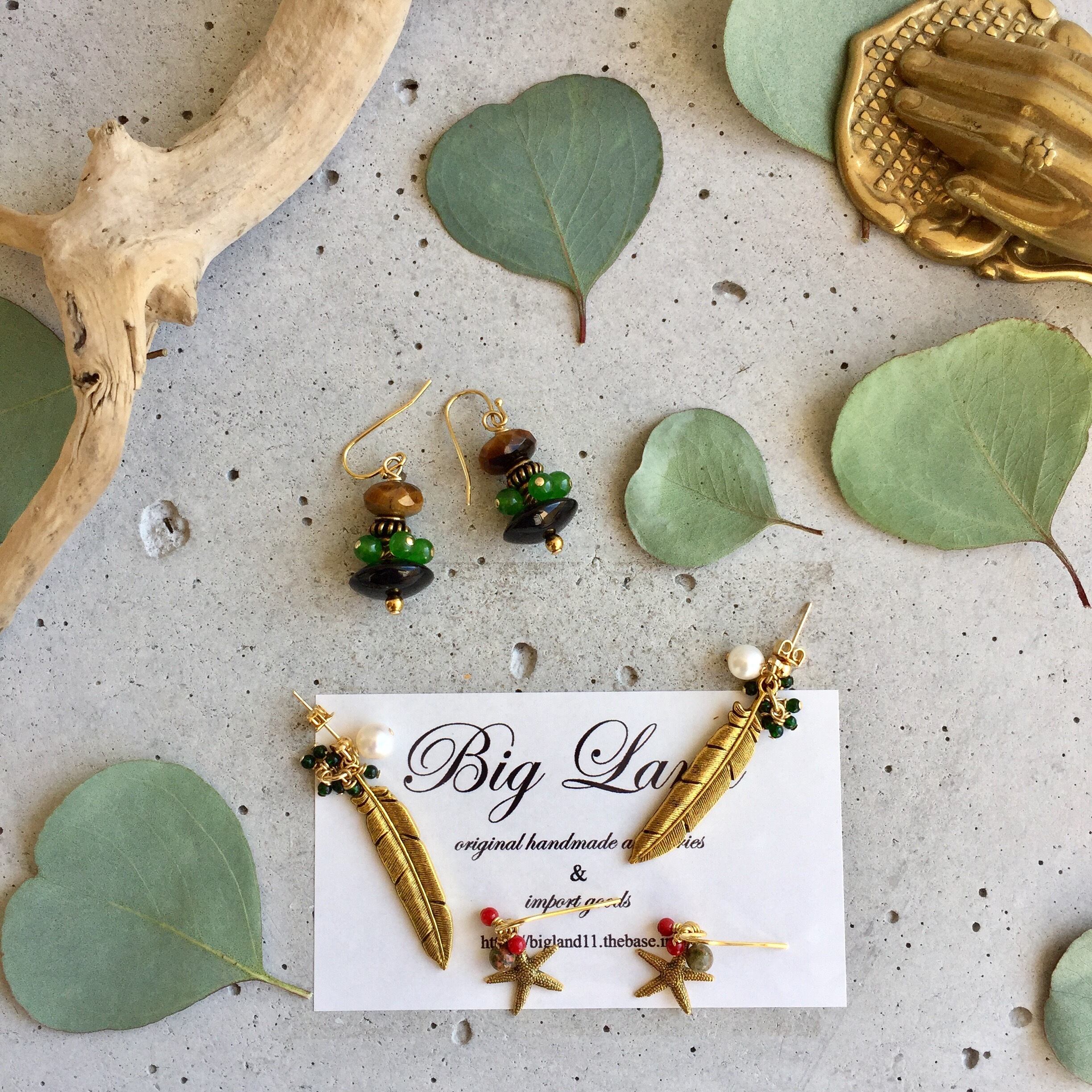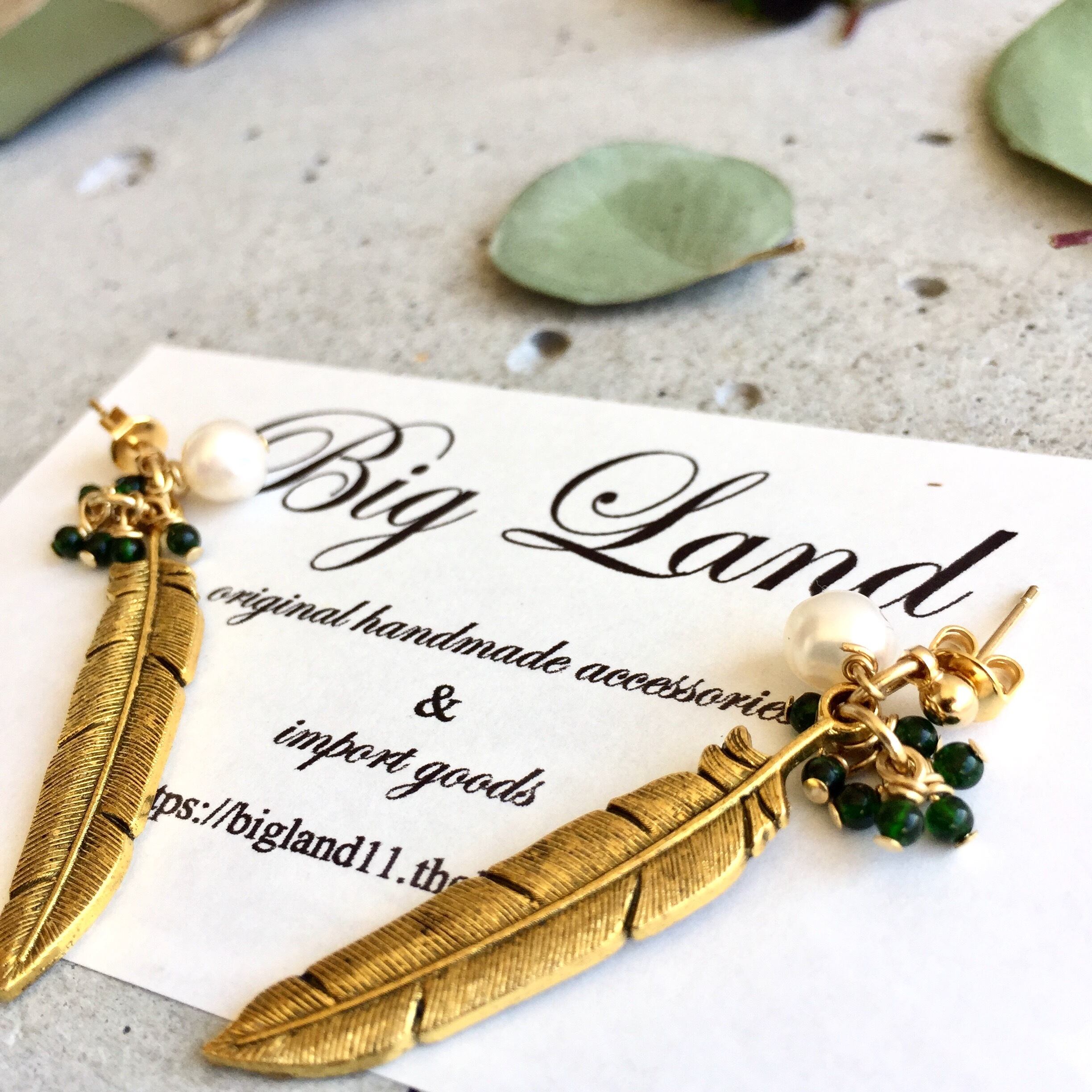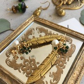 パールと小粒のグリーン天然石を加える事により、クラシカルな雰囲気で大変オシャレ感があります✨アンティーク、ヴィンテージな雰囲気がありナチュラルなお洋服や作家さん系のデザインがお好きな方にオススメです✨
